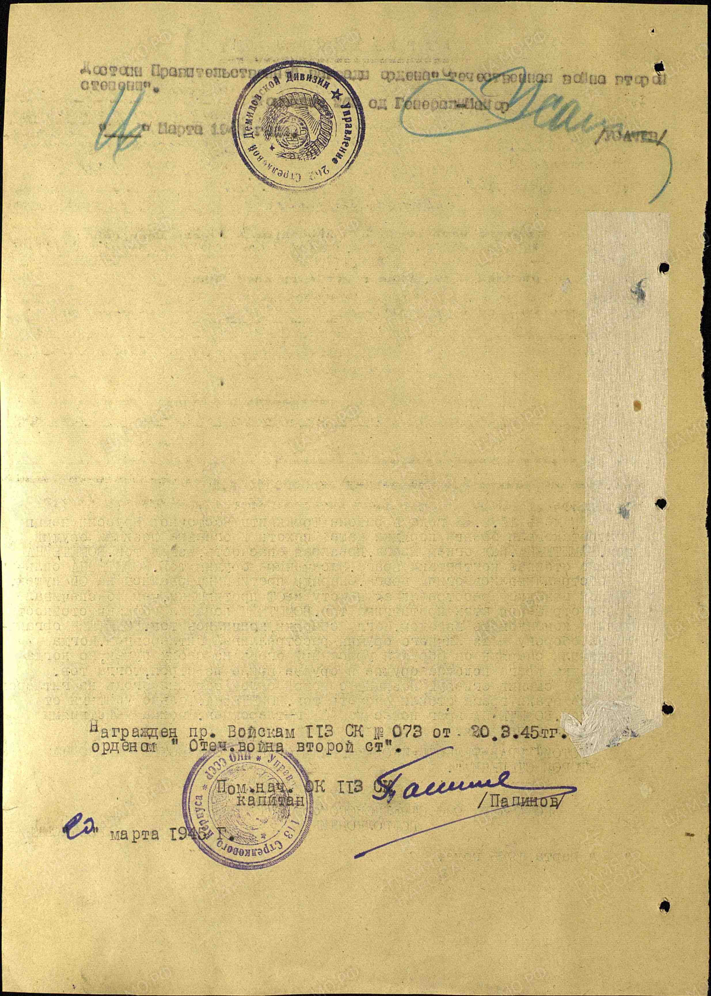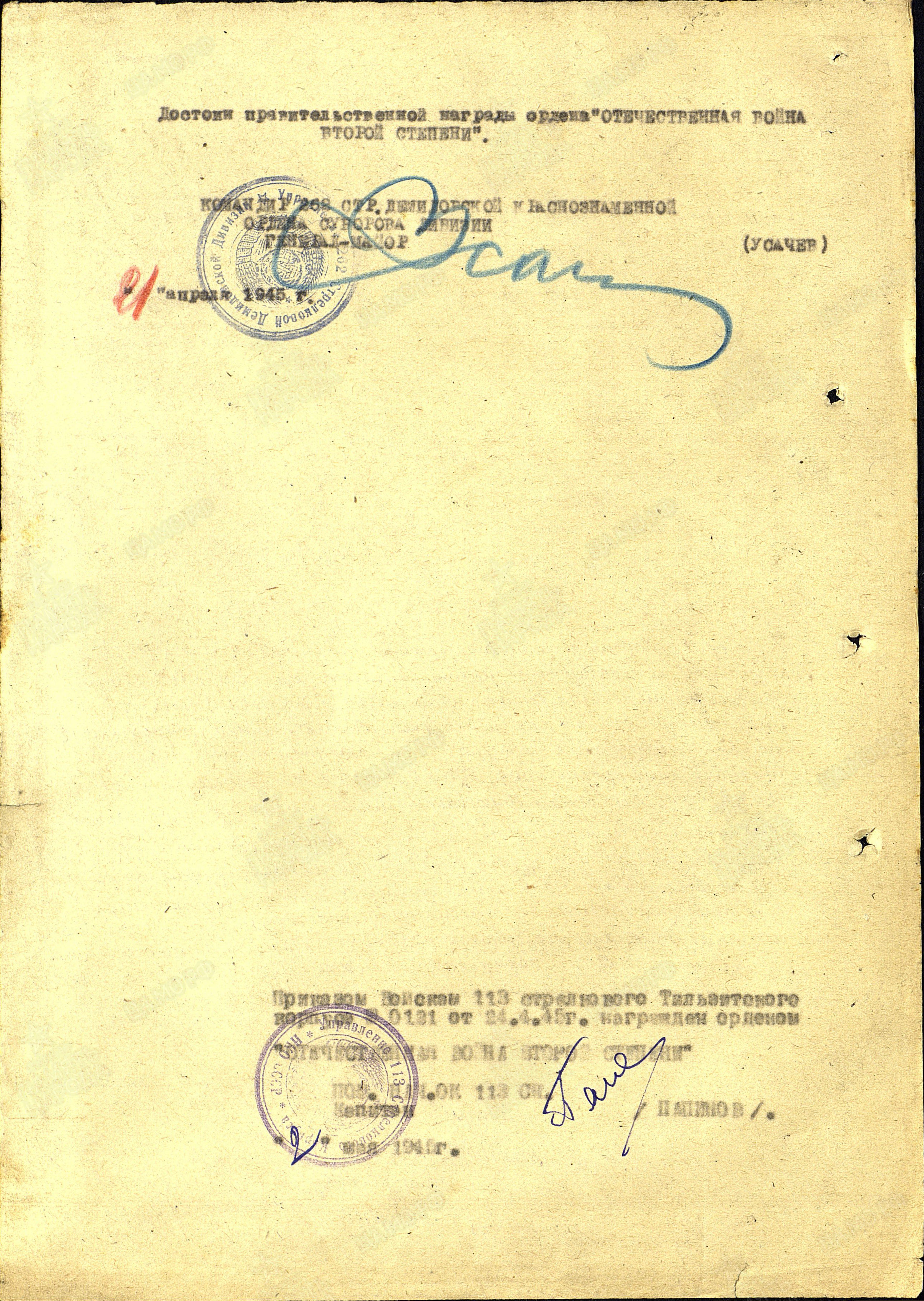Ордена: "ОТЕЧЕСТВЕННОЙ ВОЙНЫ" 2 СТЕПЕНИ (2), "КРАСНОЙ ЗВЕЗДЫ" (2).
