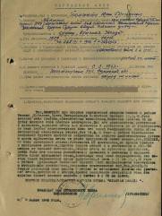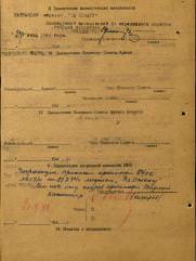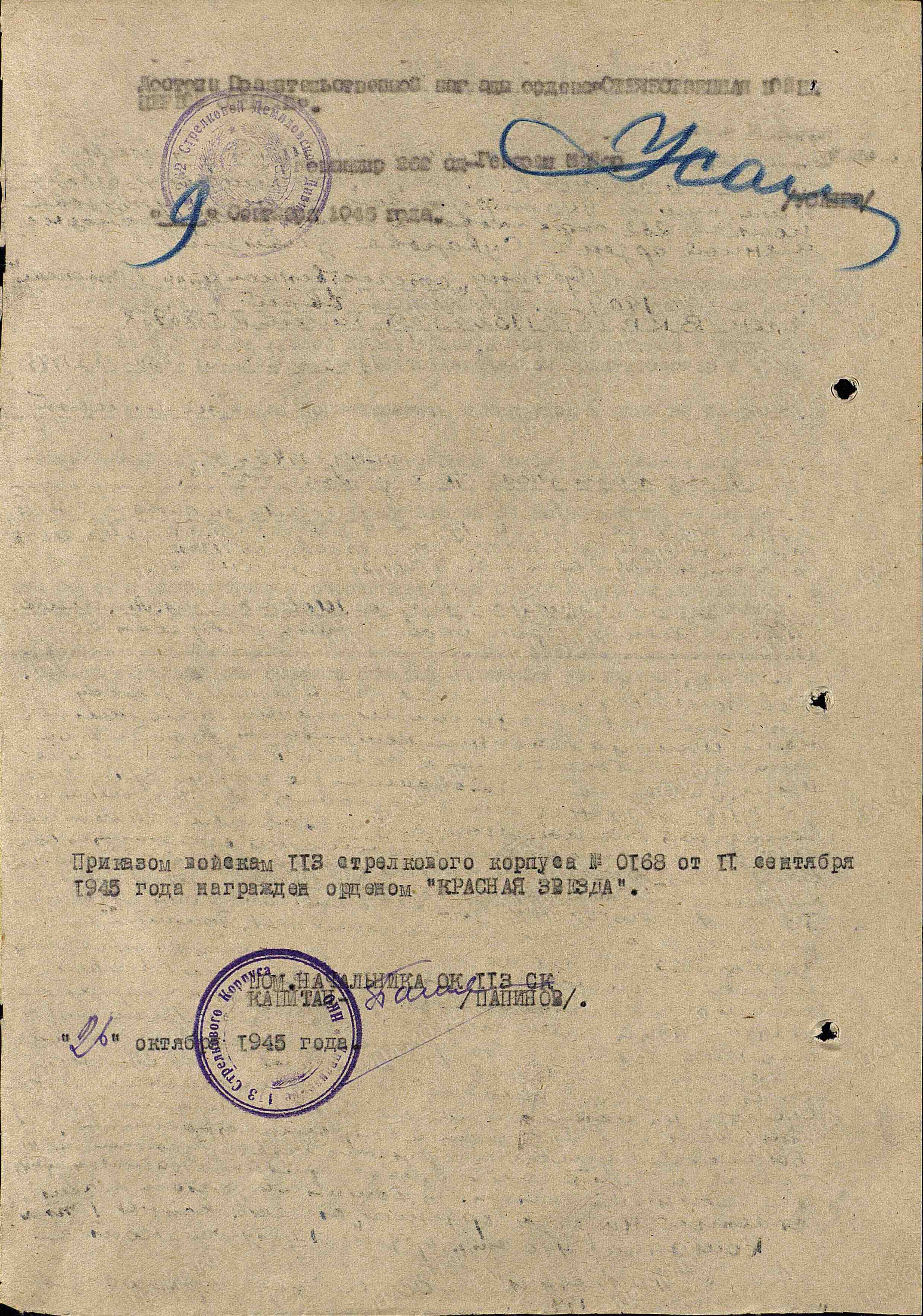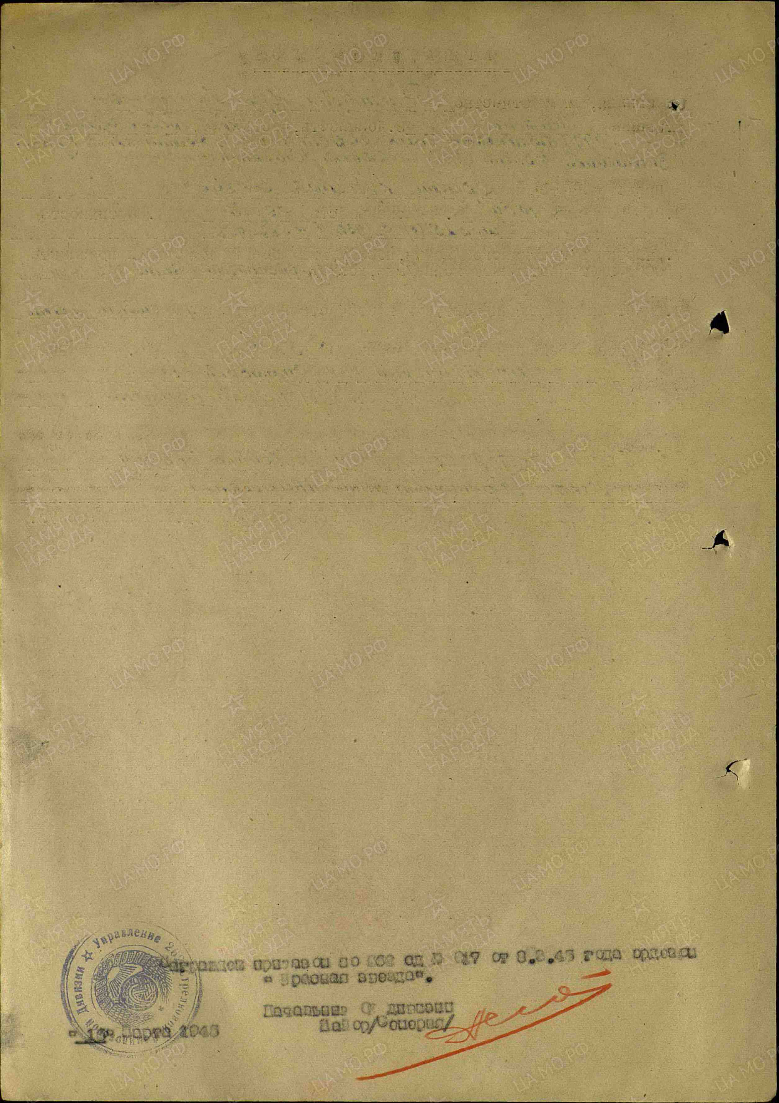 Командир огневого взвода 45 мм. противотанковых орудий 940 стрелкового ордена Кутузова полка, 262 стрелковой Демидовско - Хинганской Краснознамённой ордена Суворова дивизии, 113 стрелкового корпуса, 39 армии, 3 Белорусского фронта.