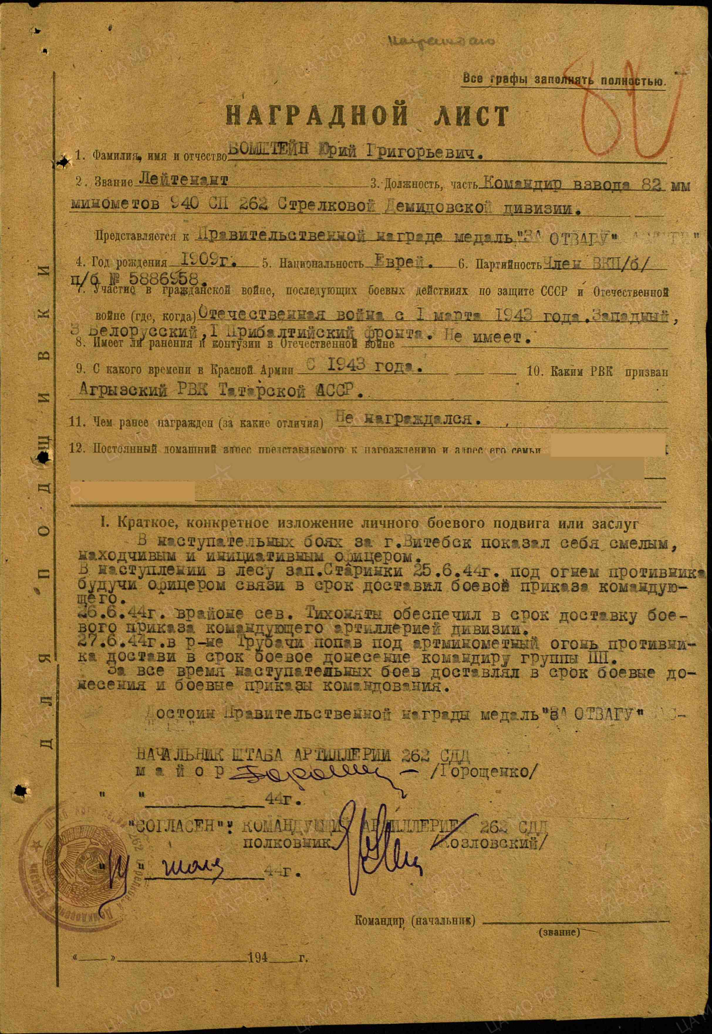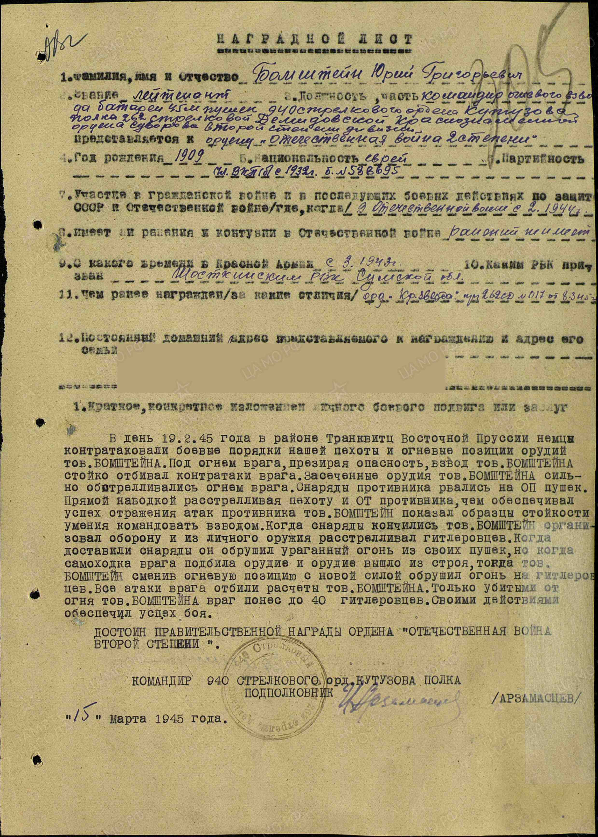 Лейтенант БОМШТЕЙН ЮРИЙ ГРИГОРЬЕВИЧ, 1909 года рождения, место рождения - Российская Империя, Черниговская губерния, Глуховский уезд, Воронежская волость, село Воронеж (по административному делению СССР: Украинская ССР, Сумская область, Шосткинский район, село Воронеж), еврей. В РККА призван Агрызским РВК, Агрызского района Татарской АССР, 1.03.1943 года. В Великой Отечественной войне с 2.02.1944 года (на Западном, 1 Прибалтийском, 3 Белорусском фронтах) в должности: Командира огневого взвода 45 мм. противотанковых орудий 940 стрелкового ордена Кутузова полка, 262 стрелковой Демидовско - Хинганской Краснознамённой ордена Суворова дивизии, 113 стрелкового корпуса, 39 армии, 3 Белорусского фронта. Ранения: нет. Боевые награды: 1. Ордена: "ОТЕЧЕСТВЕННОЙ ВОЙНЫ" 2 СТЕПЕНИ (2), "КРАСНОЙ ЗВЕЗДЫ" (2); 2. Медали: "ЗА ОТВАГУ", "ЗА ПОБЕДУ НАД ГЕРМАНИЕЙ В ВЕЛИКОЙ ОТЕЧЕСТВЕННОЙ ВОЙНЕ 1941 - 1945 ГГ.", "ЗА ПОБЕДУ НАД ЯПОНИЕЙ"  с ЭЛЕКТРОННЫЙ  ДОКУМЕНТОВ «ПОДВИГ НАРОДА В ВЕЛИКОЙ ОТЕЧЕСТВЕННОЙ 1941-1945 ГГ.»  http://podvignaroda.ru/?#tab=navHome. Вернулся с Великой Отечественной войны. Послевоенная судьба: неизвестна. Вечная Слава и Память!
