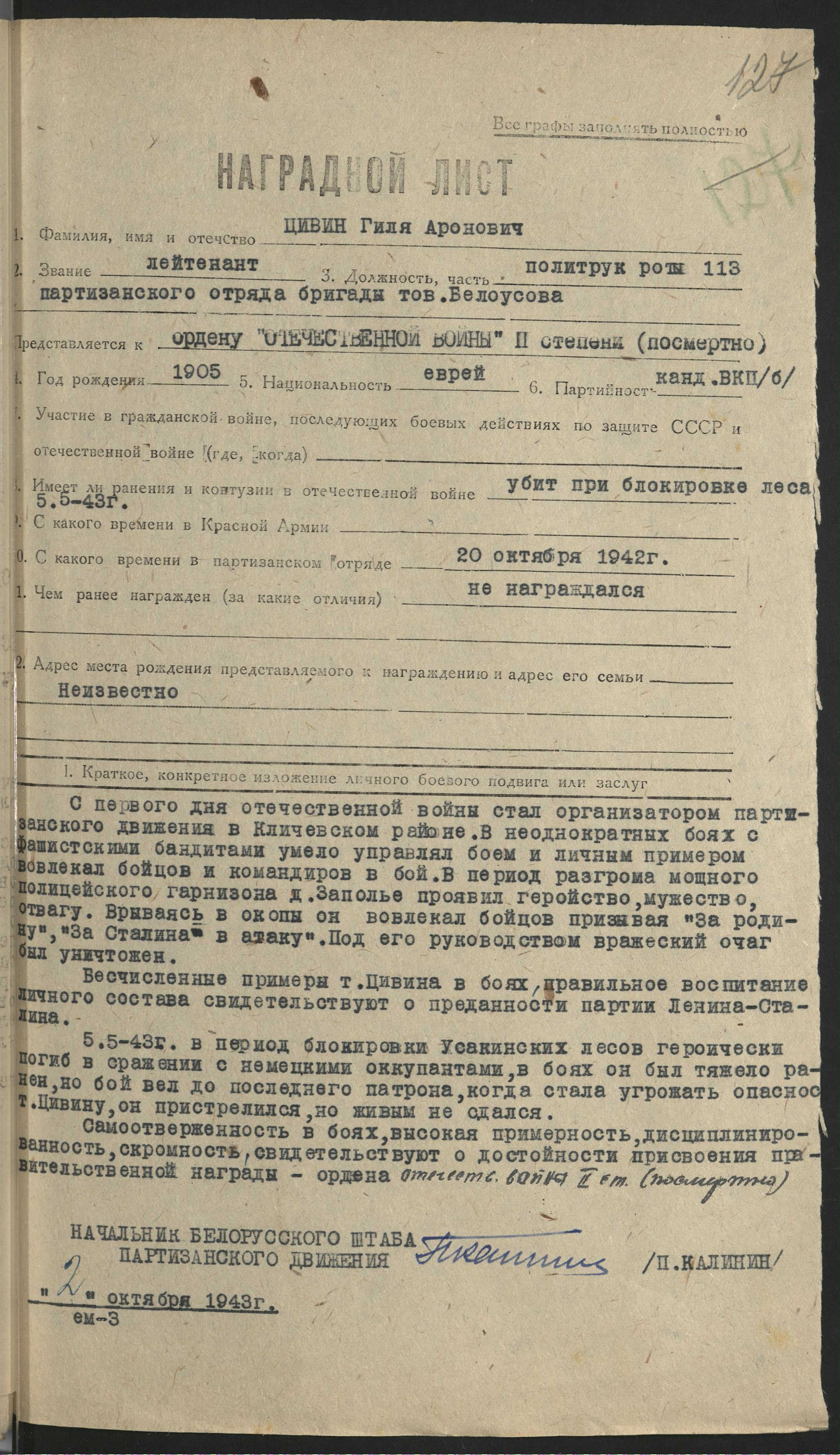 Лейтенант ЦИВИН ГИЛЯ АРОНОВИЧ, 1905 года рождения, место рождения - неизвестно, еврей. В Великой Отечественной войне (партизанском отряде) с 10.10.1942, в должности: Политрука роты 113 партизанского полка, Могилёвской военно - оперативной грууппы, Штаба партизанского движения Белорусской ССР. Ренения: нет. Боевые награды: нет; представлялся к наградам: званию "ГЕРОЙ СОВЕТСКОГО СОЮЗА", ордену "ОТЕЧЕСТВЕННОЙ ВОЙНЫ" 2 СТЕПЕНИ. С Великой Отечественной войны не вернулся: 5.05.1943 года, тяжело ранен, в бою, при блокировке леса немецко - фашистскими оккупантами, застрелился при угрозе захвата в плен. Захоронен: Республика Беларусь, Могилёвская область, Клический район, деревня Усакино, Мемориальный комплекс (в настоящее время). Вечная Слава и Память.