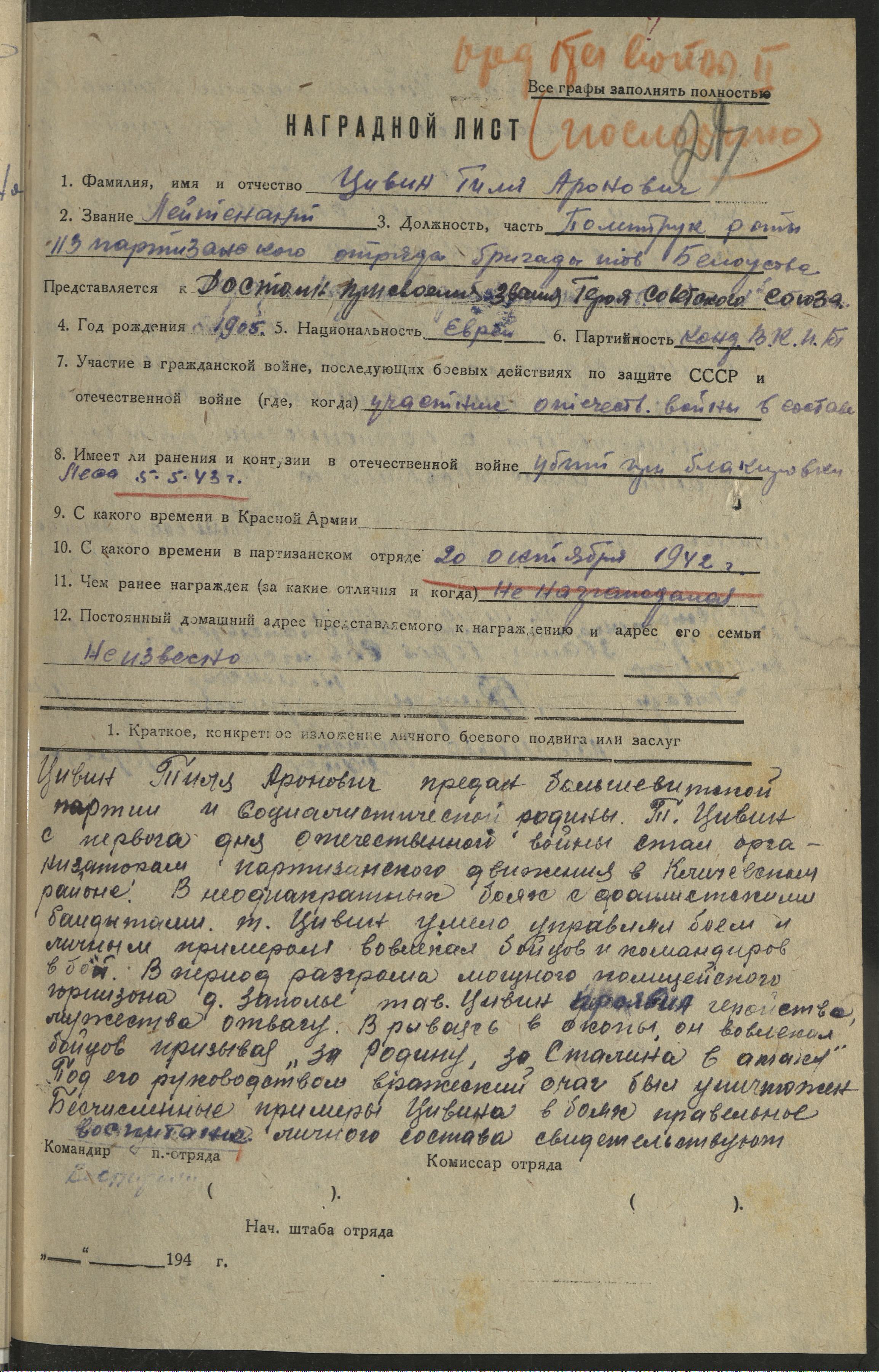 1. НАГРАДНЫЕ ЛИСТЫ на представление к наградам: званию "ГЕРОЙ СОВЕТСКОГО СОЮЗА", ордену "ОТЕЧЕСТВЕННОЙ ВОЙНЫ" 2 СТЕПЕНИ (с "Партизаны Беларуси"; https://partizany.by/partisans/29119/ );