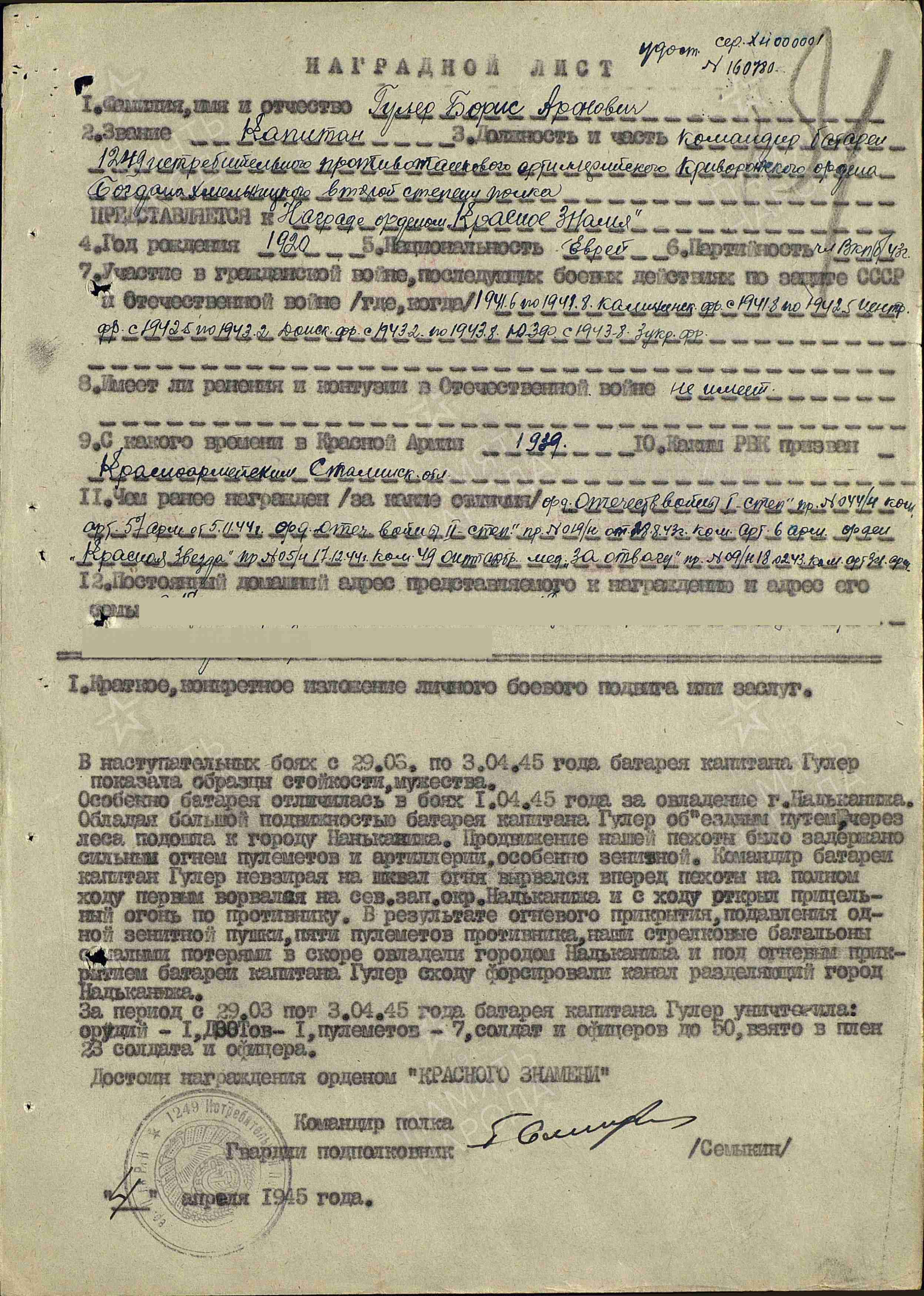 Гулер Борис Аронович родился 1920 году в городе Умань Киевской области. Еврей.