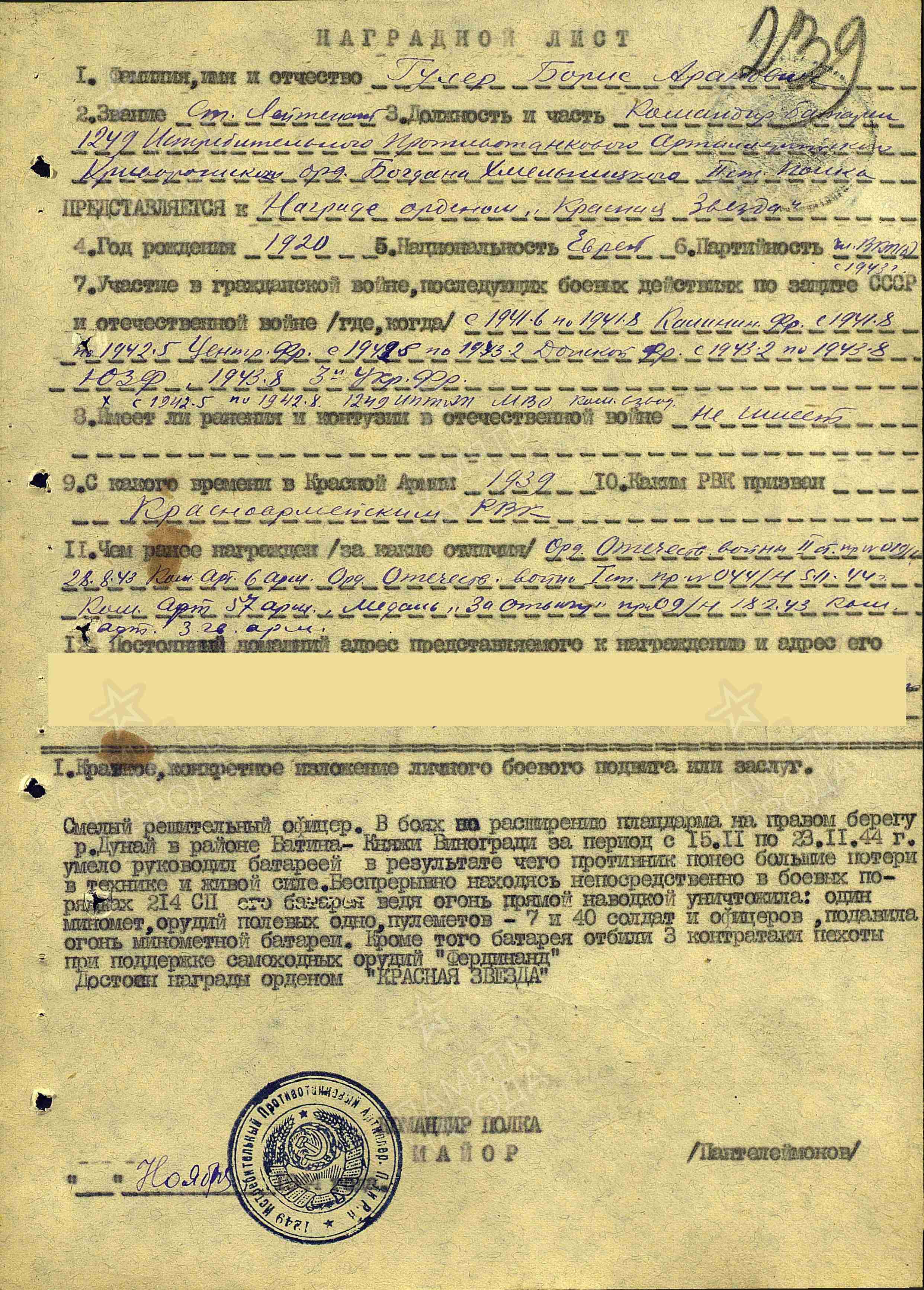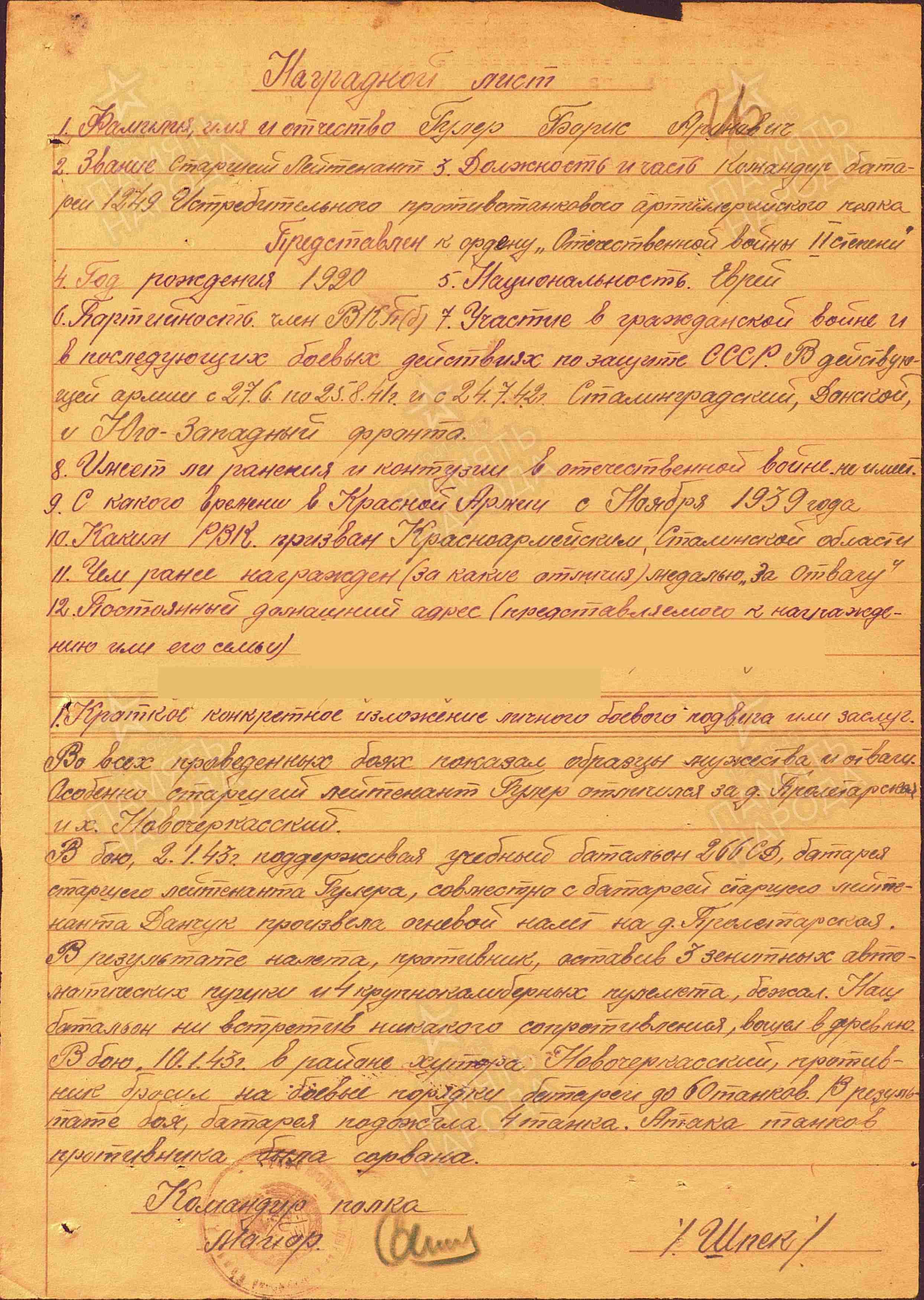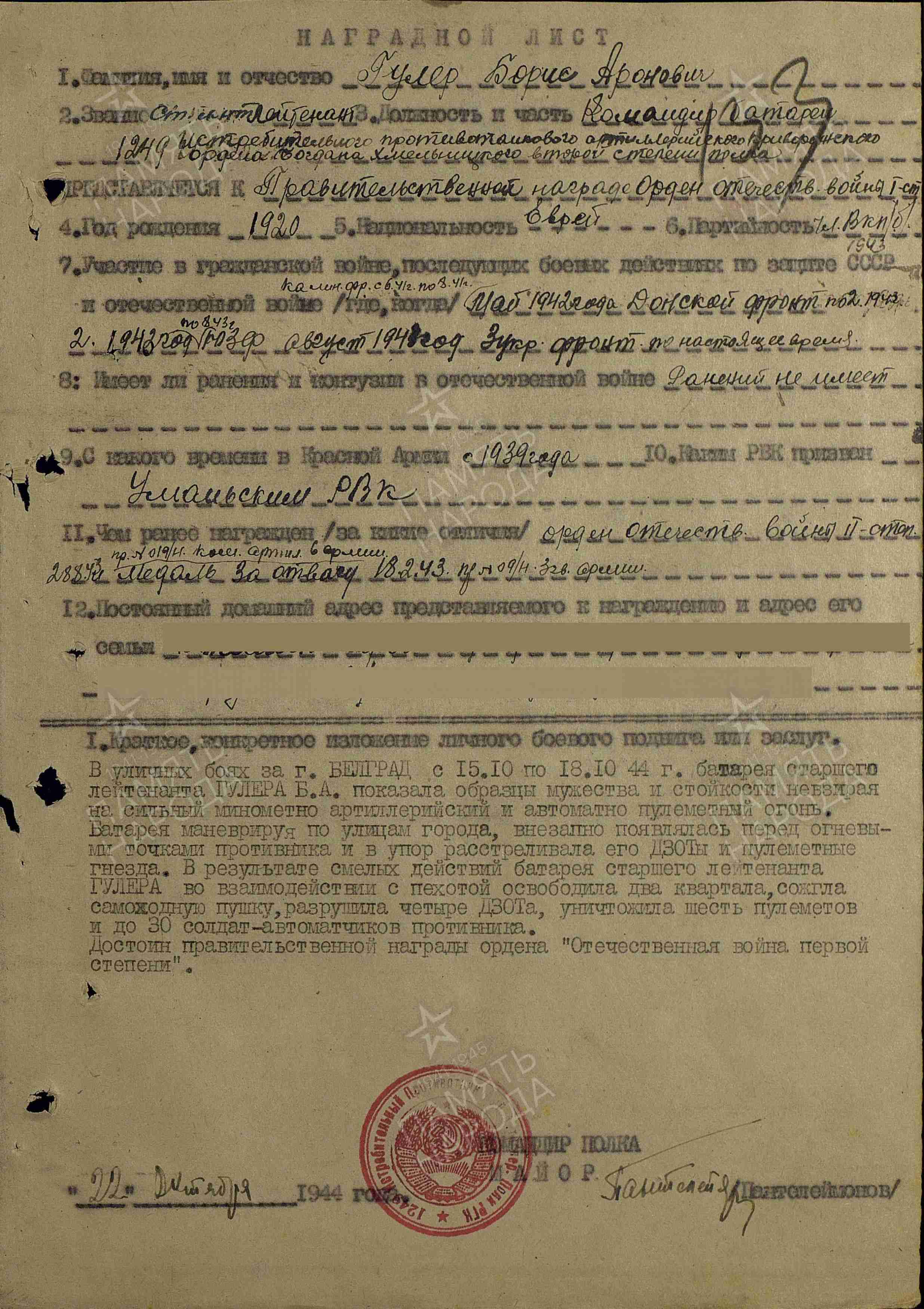 Гулер Борис Антонович. Орден Отечественной войны I степени