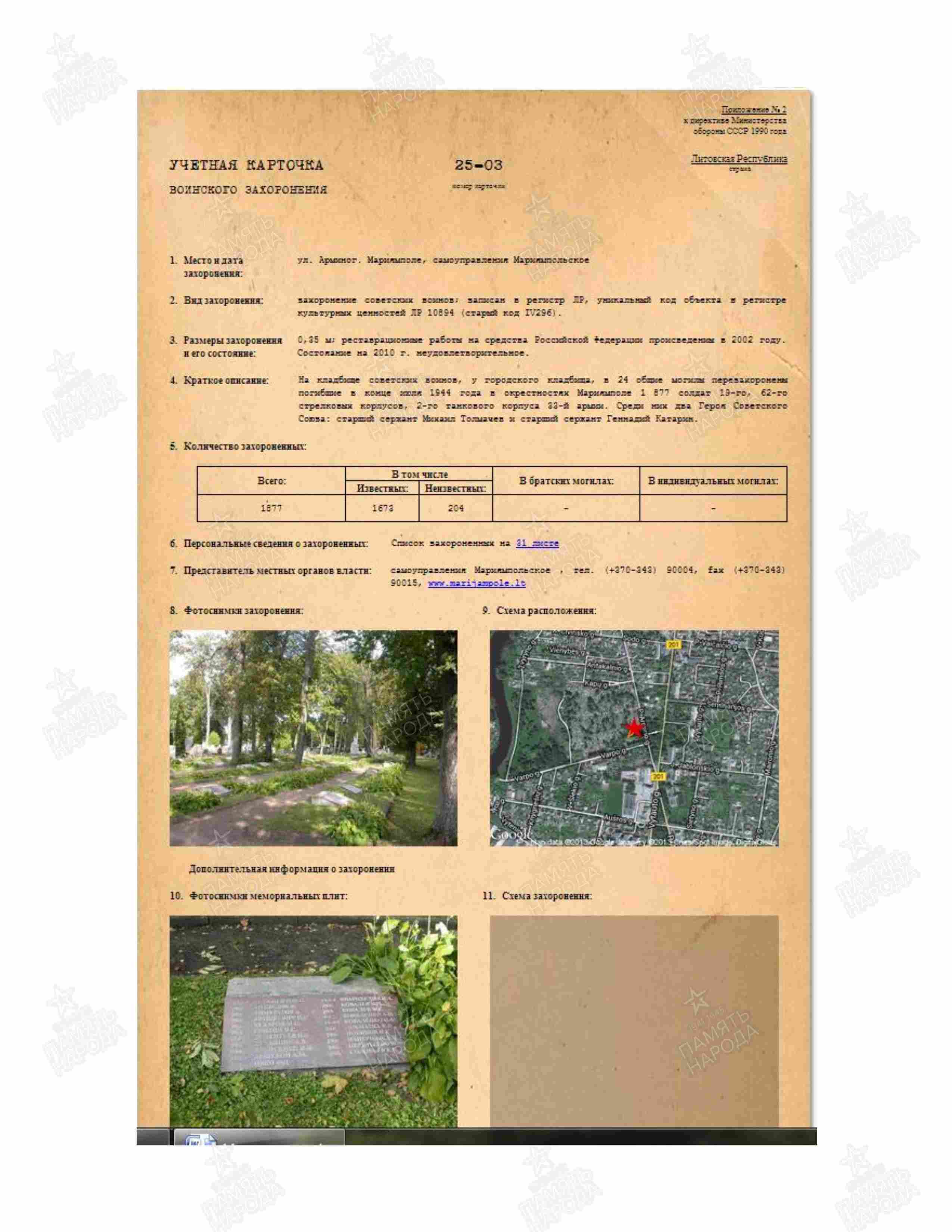 Место захоронения: г. Мариямполе, ул. Арминог, городское кладбище, около, кладбище советских воинов