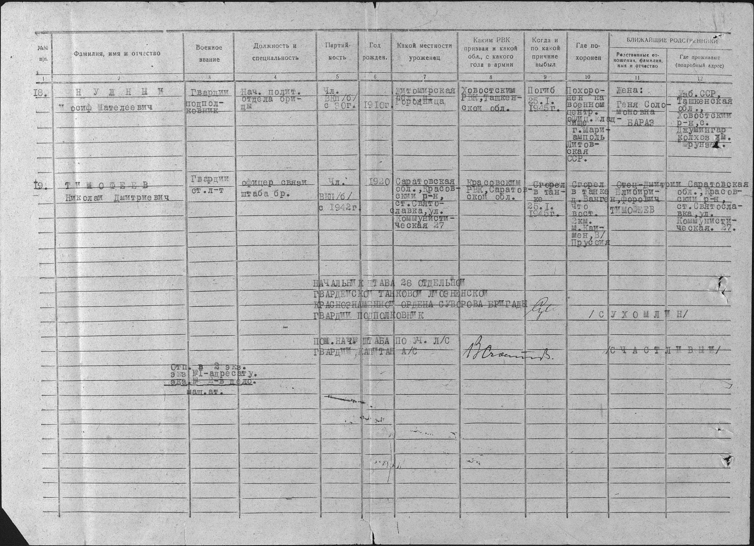 Примечание: Гвардии подполковник НУЖНЫЙ И. М. убит, в бою, 25.01.1945 года. Захоронен (в настоящее время): Литовская Республика, регион Сувалкия, Марияпольский уезд, Марияпольское самоуправление, г. Марияполе, ул. Семинариёс, 3с, кладбище советских офицеров.