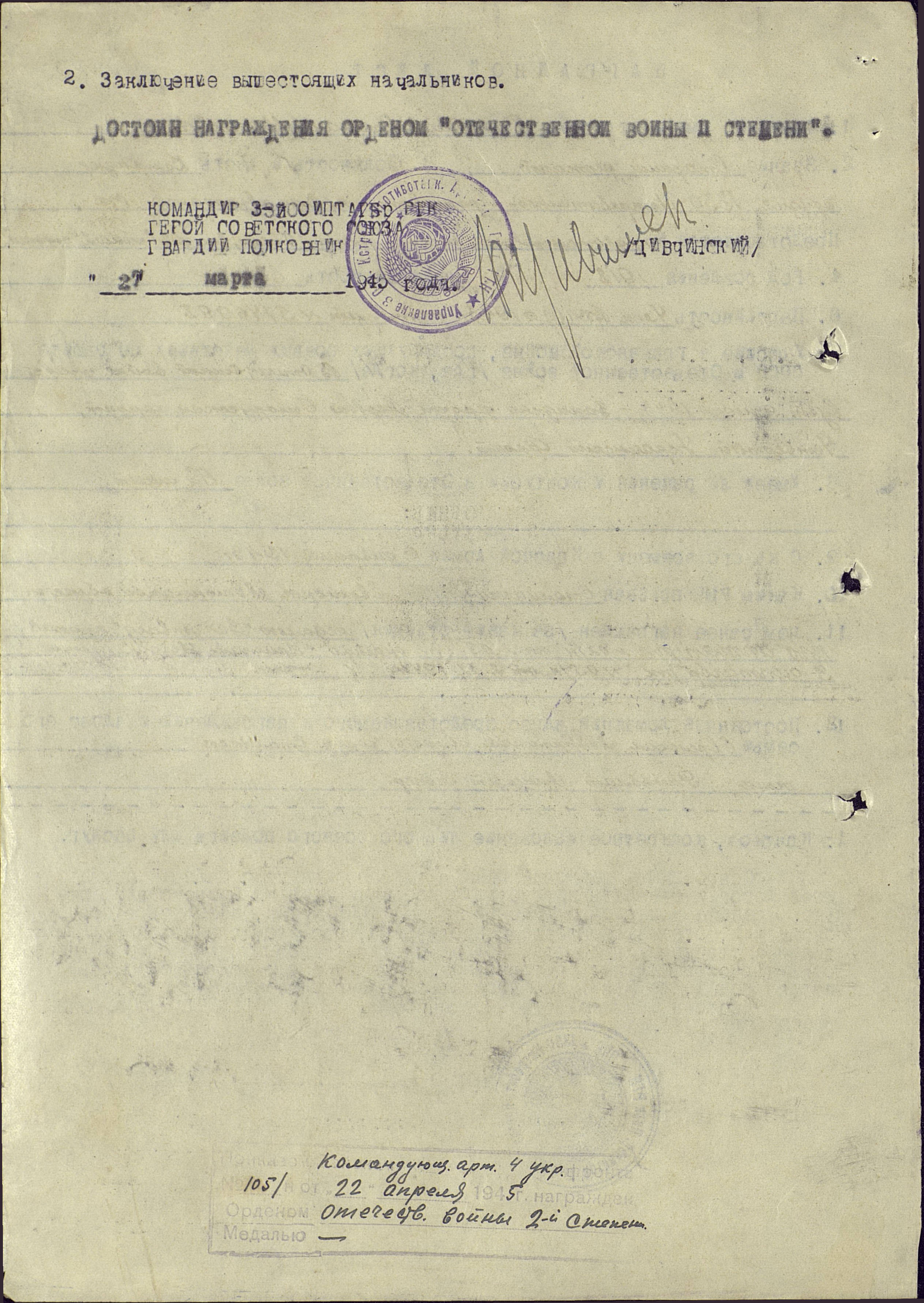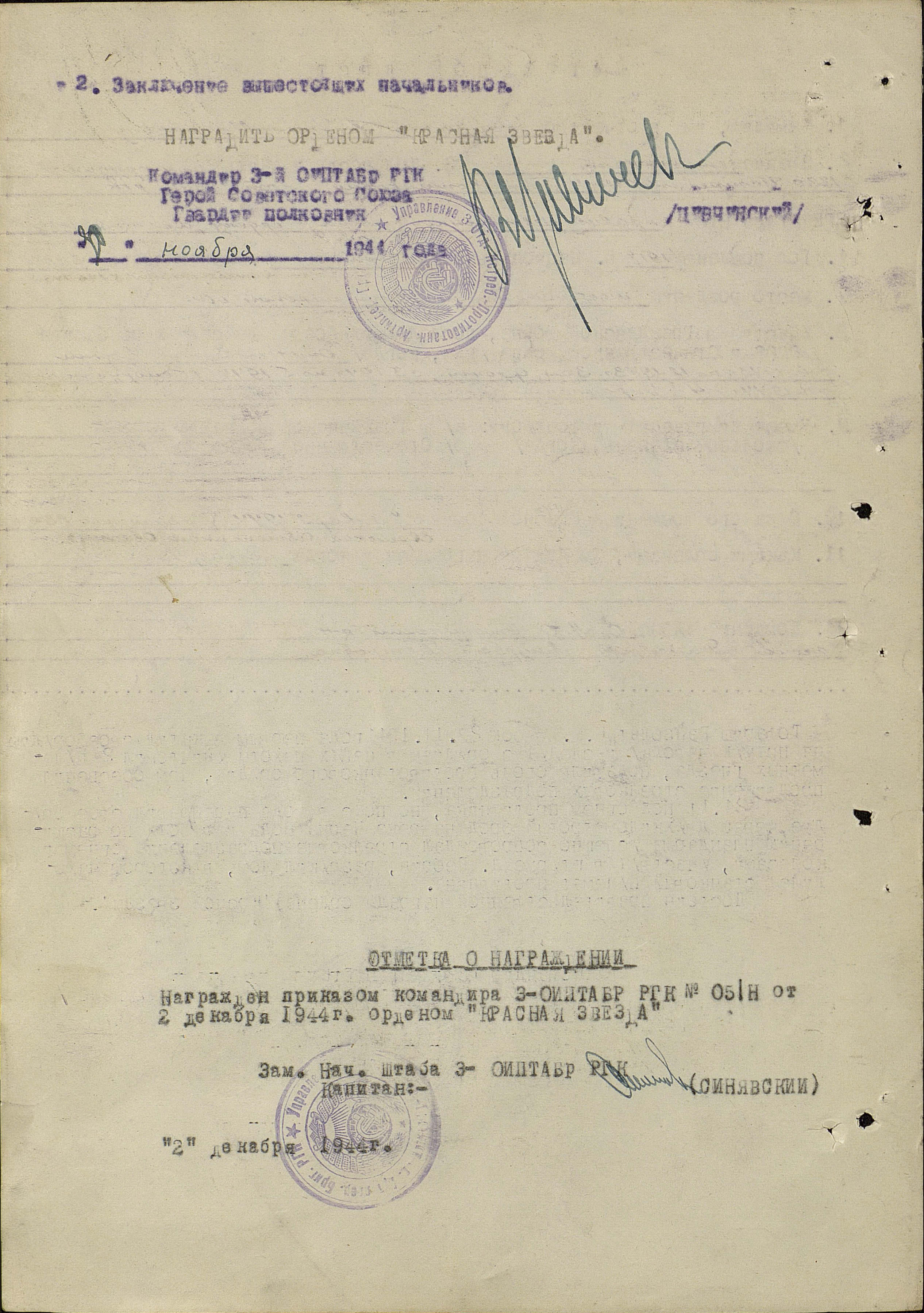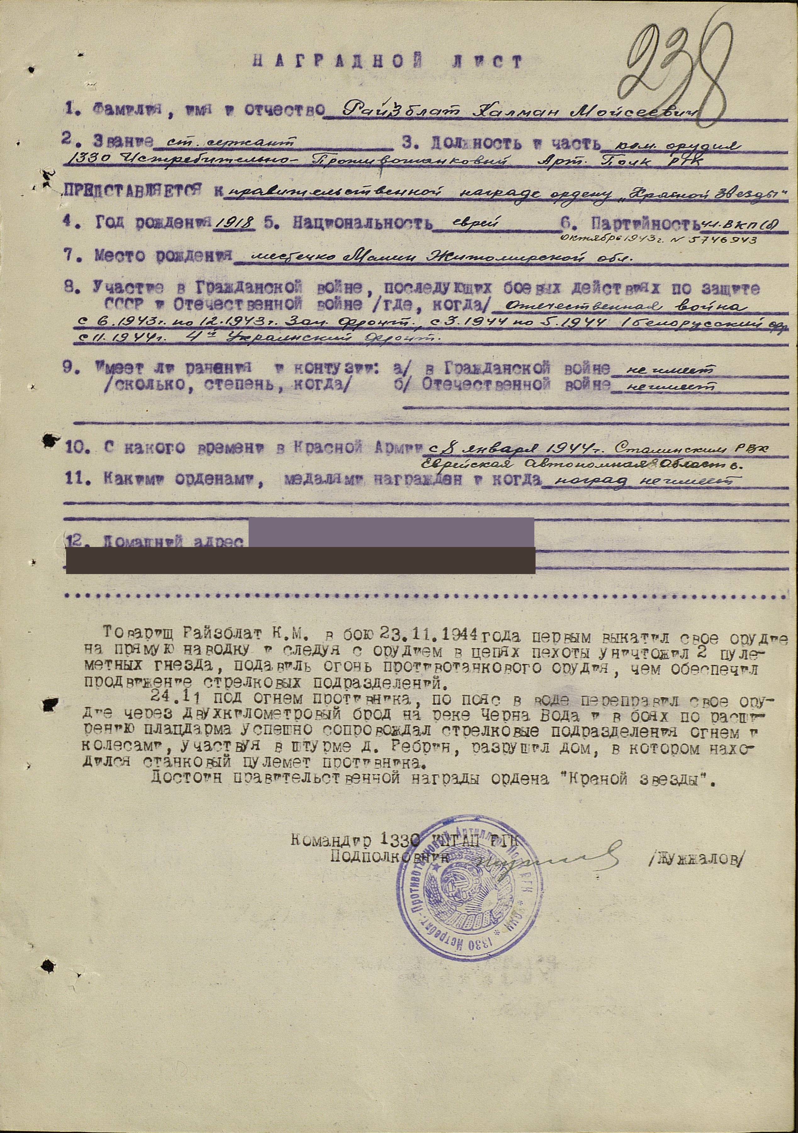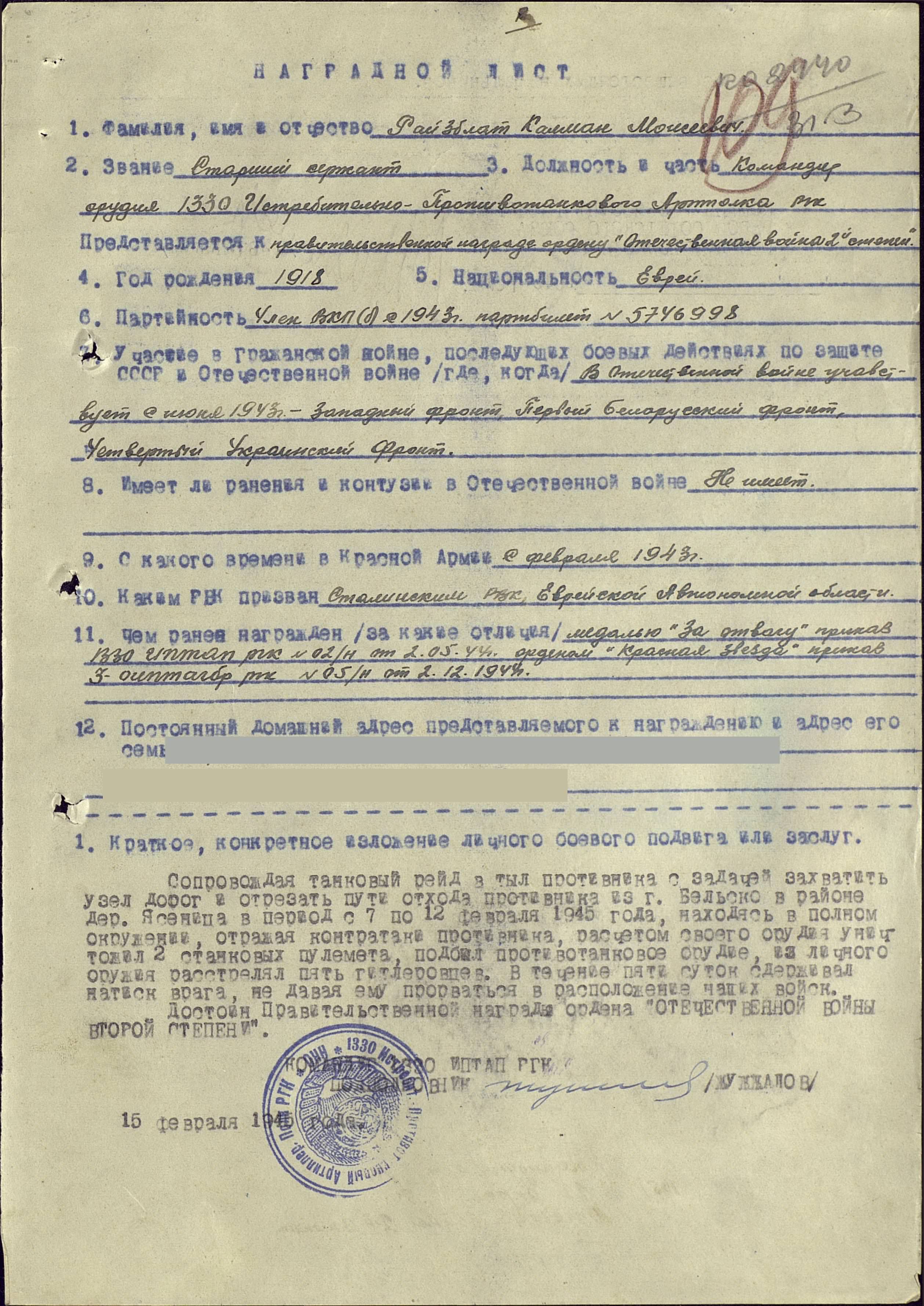 С 1943 года на фронте в звании старшего сержанта, командира орудия. За мужество и смелость был награжден Орденом Красной Звезды, Орденами Отечественной войны двух степеней. В 1945 году под городом Кенигсберг (Калининград) мой прадед был тяжело ранен и очень долго лечился в госпитале, но выжил.