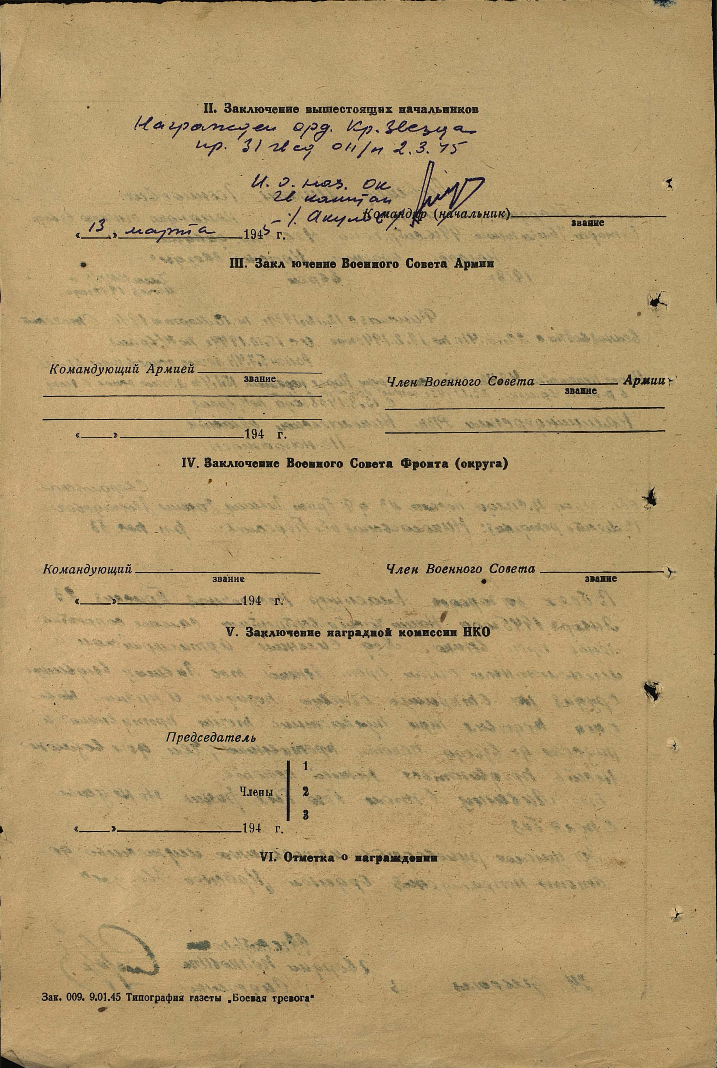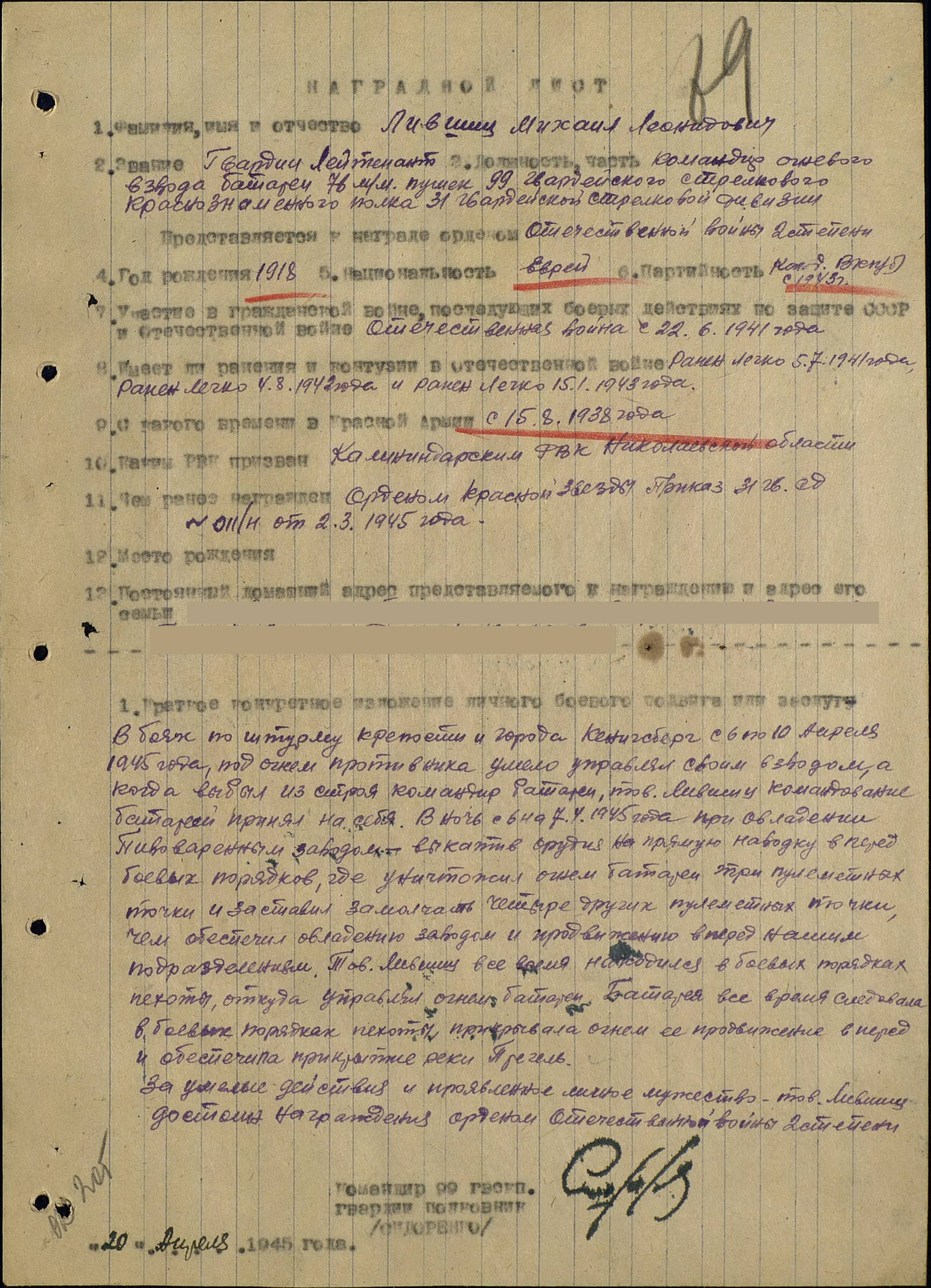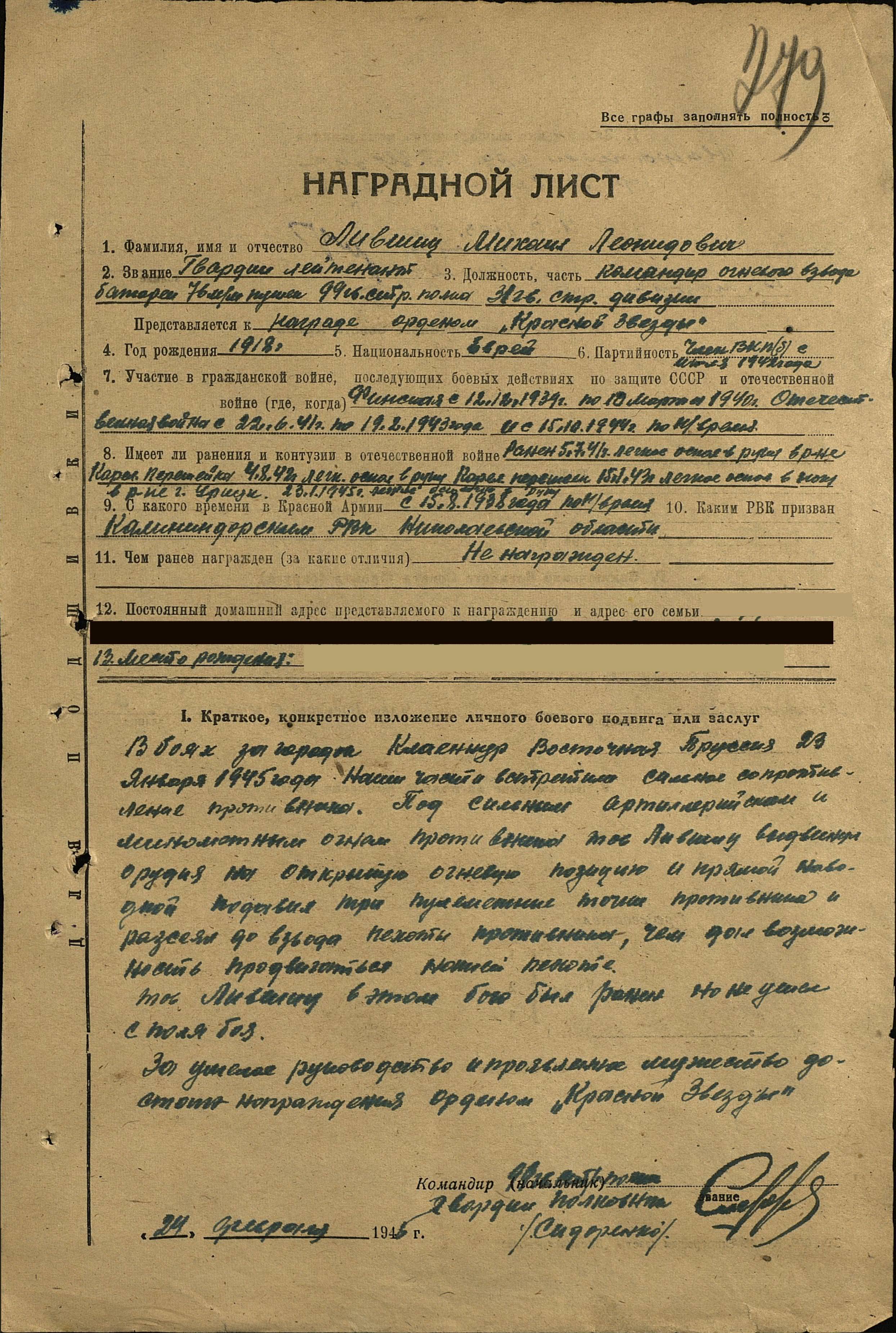 командира огневого взвода батареи 76-мм пушек, 99-го гвардейского стрелкового полка, 31-й гвардейской стрелковой дивизии.