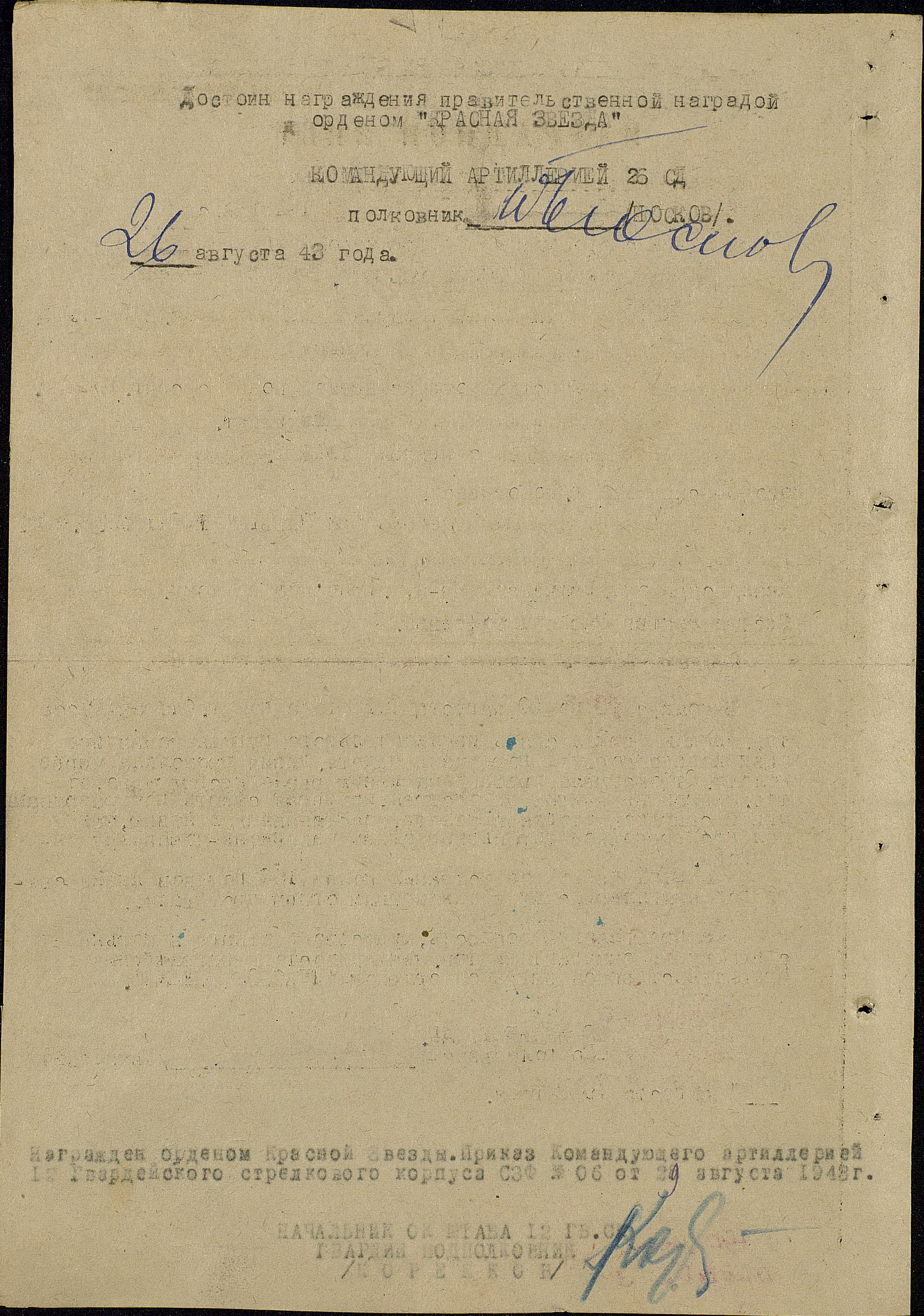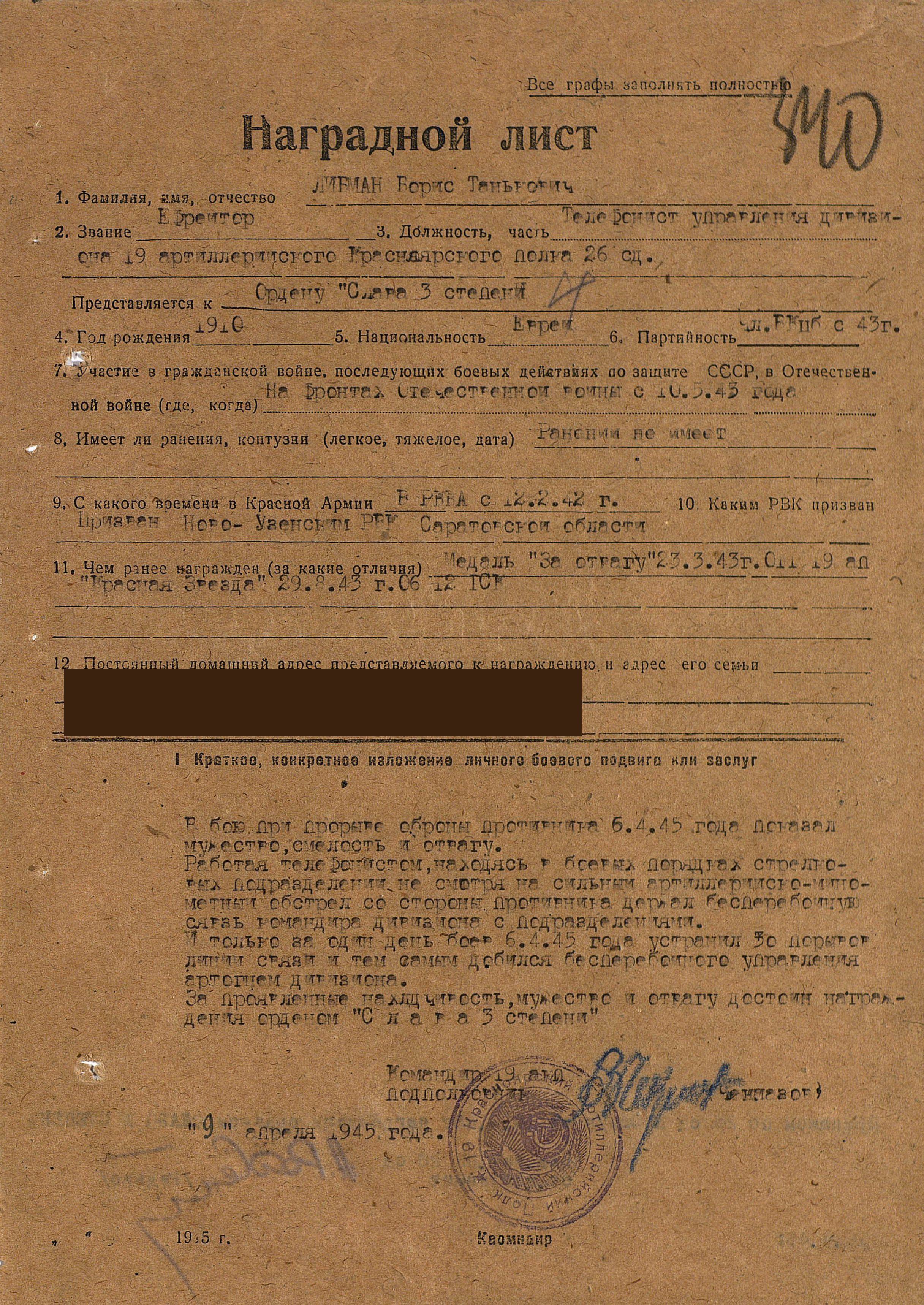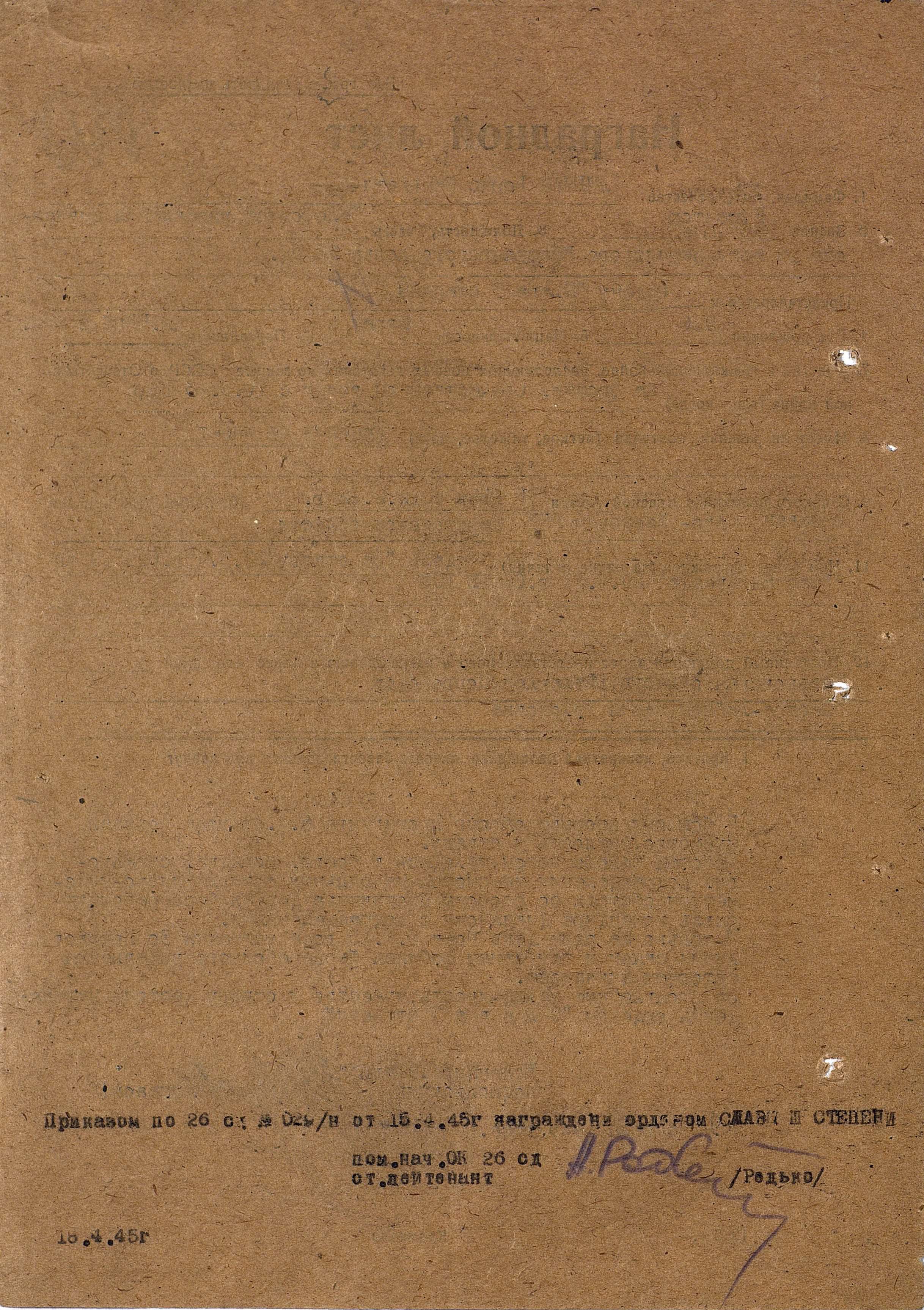 Победу встретил в Кенигсберге в должности телефониста управления дивизионом  19-го Красноярского артиллерийского  полка, 26-й стрелковой дивизии.