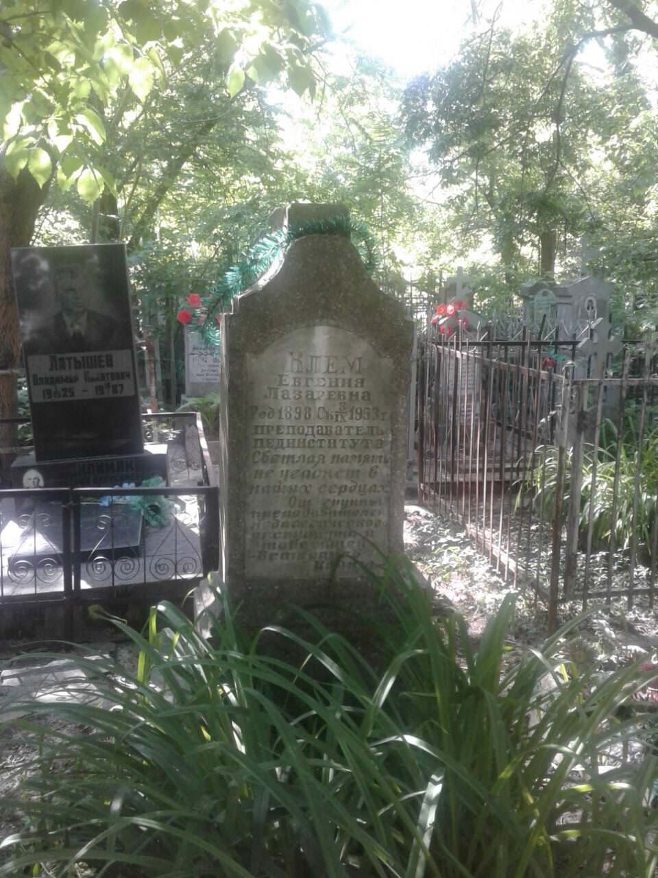 Покончила с собой, повесилась, на двери своей комнаты - 3.09.1953 года. Похоронена: Украина, г. Одесса, 2-е Интернациональное кладбище, участок №66, линия 12, могила № 30. На запущенной могиле и памятнике слова: Клем Евгения Лазаревна. Род. 1898 Ск. 3.IX 1953 Преподаватель пединститута. Светлая память не угаснет, в наших сердцах. От группы преподавателей педагогического института и товарищей – Ветеранов Войны». Вечная Слава и Память, забытой всеми, настоящей Героине Великой Войны, руководителю русской секции "БРАТСКОГО СОЮЗА ВОЕННОПЛЕННЫХ" (БСВ), в женском концентрационном лагере "РАВЕНСБРЮК", КЛЕМ ЕВГЕНИИ ЛАЗАРЕВНЕ, принявшей, тяжкую, военную и личную судьбу, в виде, множественных, преследований, за пребывание в плену!