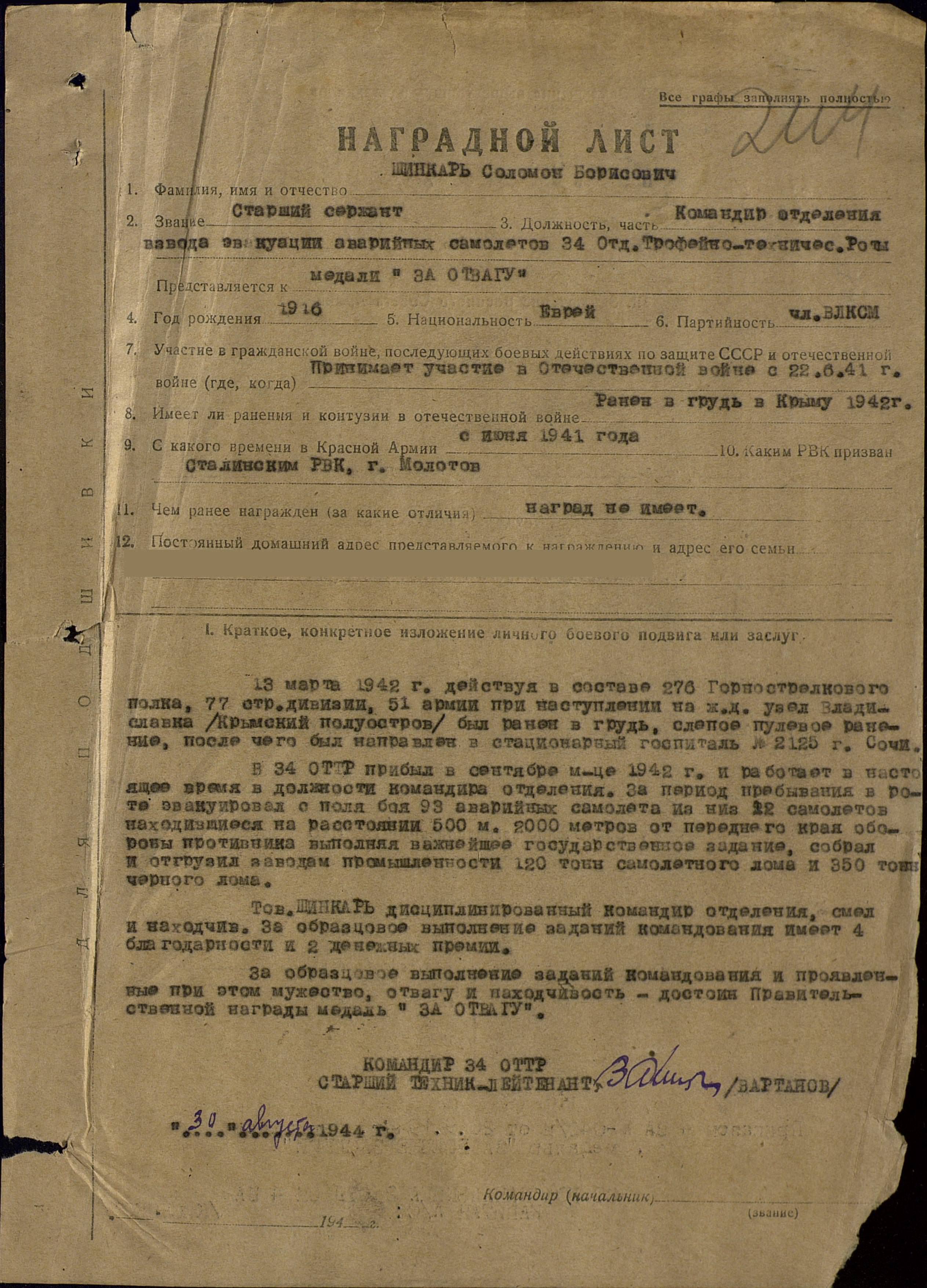 Очень хочу увековечить память моего дяди Шинкарь Соломона Борисовича, который прошёл всю войну с 1941 по 1945 год в звании старшего сержанта. В марте 1942 года был тяжело ранен пулей на вылет в грудь и попал в стационарный госпиталь №2125 в городе Сочи.