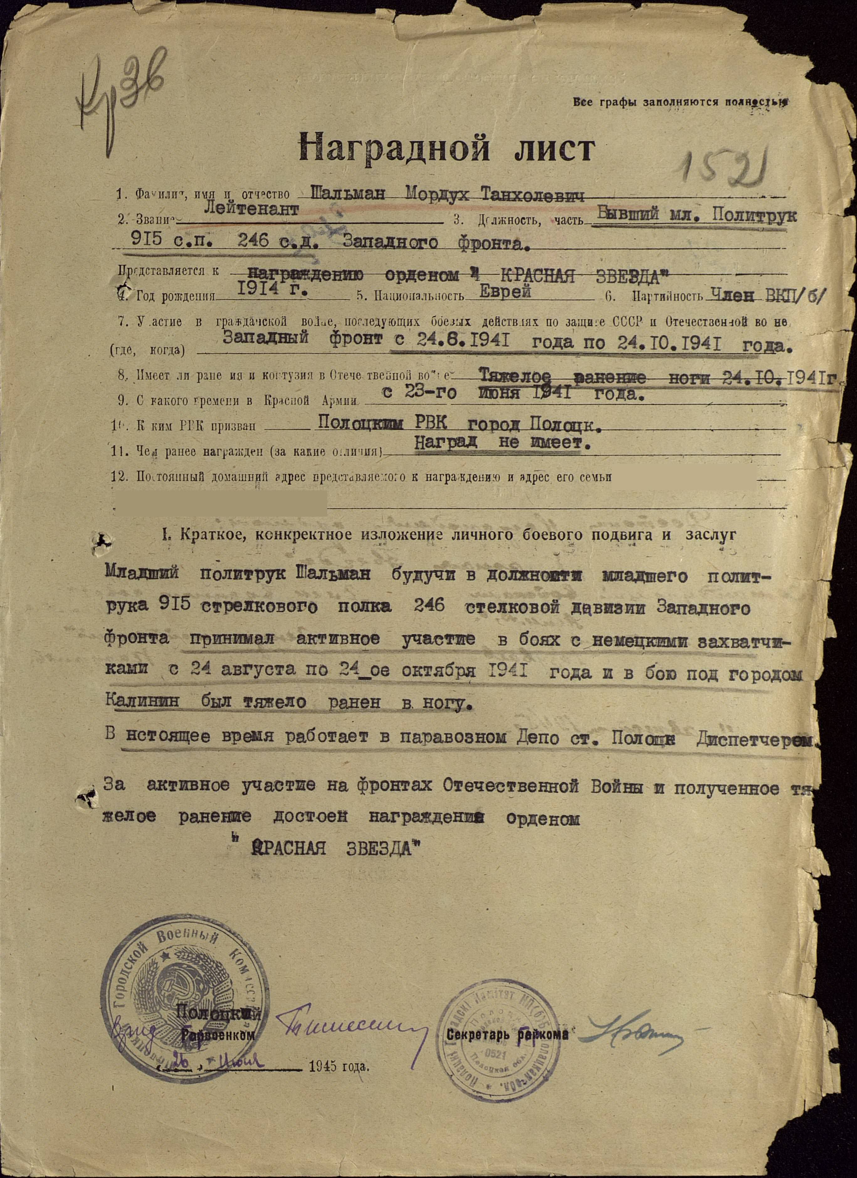 Лейтенант ШАЛЬМАН МОРДУХ ТАНХОЛЕВИЧ, 1914 года рождения, место рождения - Белорусская ССР, г. Полоцк. В РККА призван 07.1941 года, Полоцким ГВК, г. Полоцка. На фронте Феликой Отечественной войны - Политрук роты 915 стрелкового полка, 246 стрелковой дивизии, Западного фронта. Ранения: 1. Тяжёлое, 24.10. 1941 года, в ногу. После лечения, уволен из рядов РККА, как негодный, к военной службе. Боевые награды: 1. Орден "КРАСНАЯ ЗВЕЗДА"(№ записи: 83370058) с ЭЛЕКТРОННЫЙ БАНК ДОКУМЕНТОВ «ПОДВИГ НАРОДА В ВЕЛИКОЙ ОТЕЧЕСТВЕННОЙ ВОЙНЕ 1941-1945 ГГ.» ЭЛЕКТРОННЫЙ БАНК ДОКУМЕНТОВ «ПОДВИГ НАРОДА В ВЕЛИКОЙ ОТЕЧЕСТВЕННОЙ ВОЙНЕ 1941-1945 ГГ.». Вернулся, с Великой Отечественной войны, инвалидом. Многие годы трудился, на железнодорожной станции г. Полоцк, диспетчером. Прожил достойную жизнь, людей его поколения. Вечная Слава и Память Герою Отечественной войны!