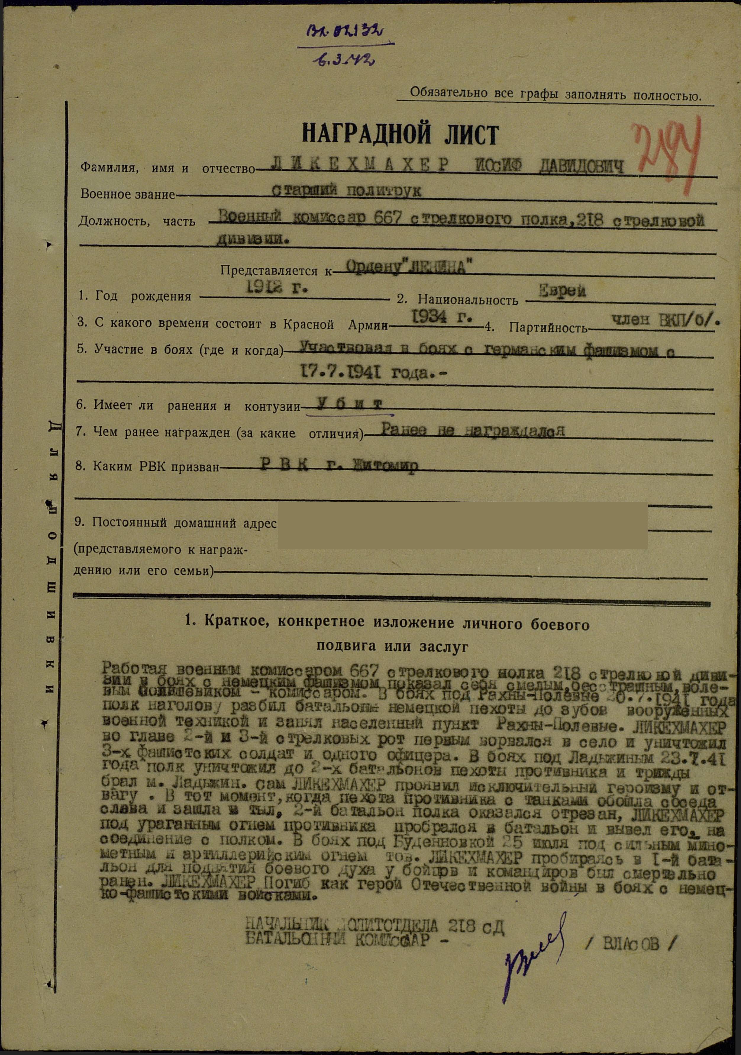 В боях под Буденновкой 25 июля под сильным минометным и артиллерийским огнем тов. Ликехмахер пробираясь в 1-й батальон для поднятия боевого духа у бойцов и командиров был смертельно ранен.