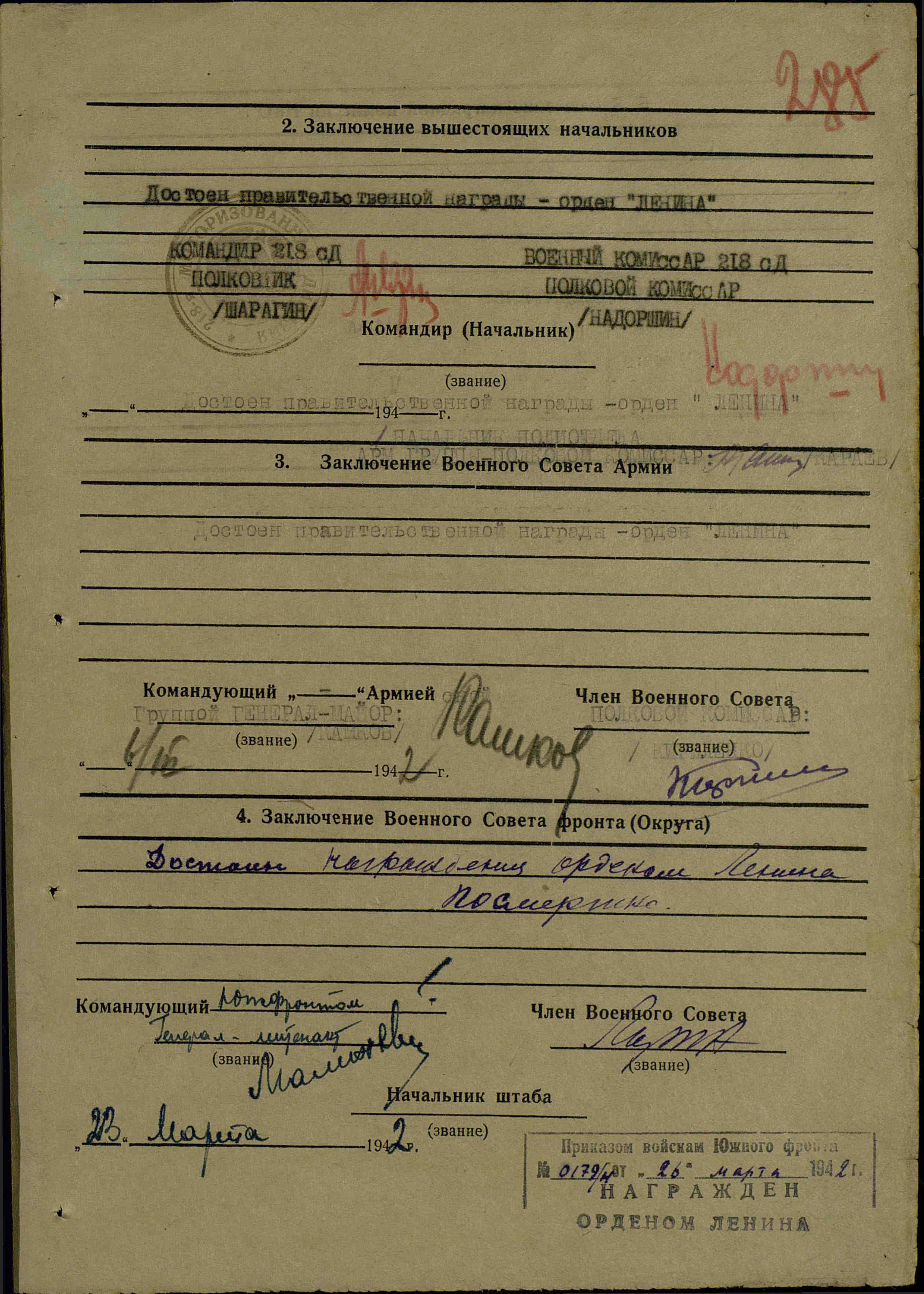 Войнный комиссар 218 стрелковой дивизии полковой комиссар Надоршин