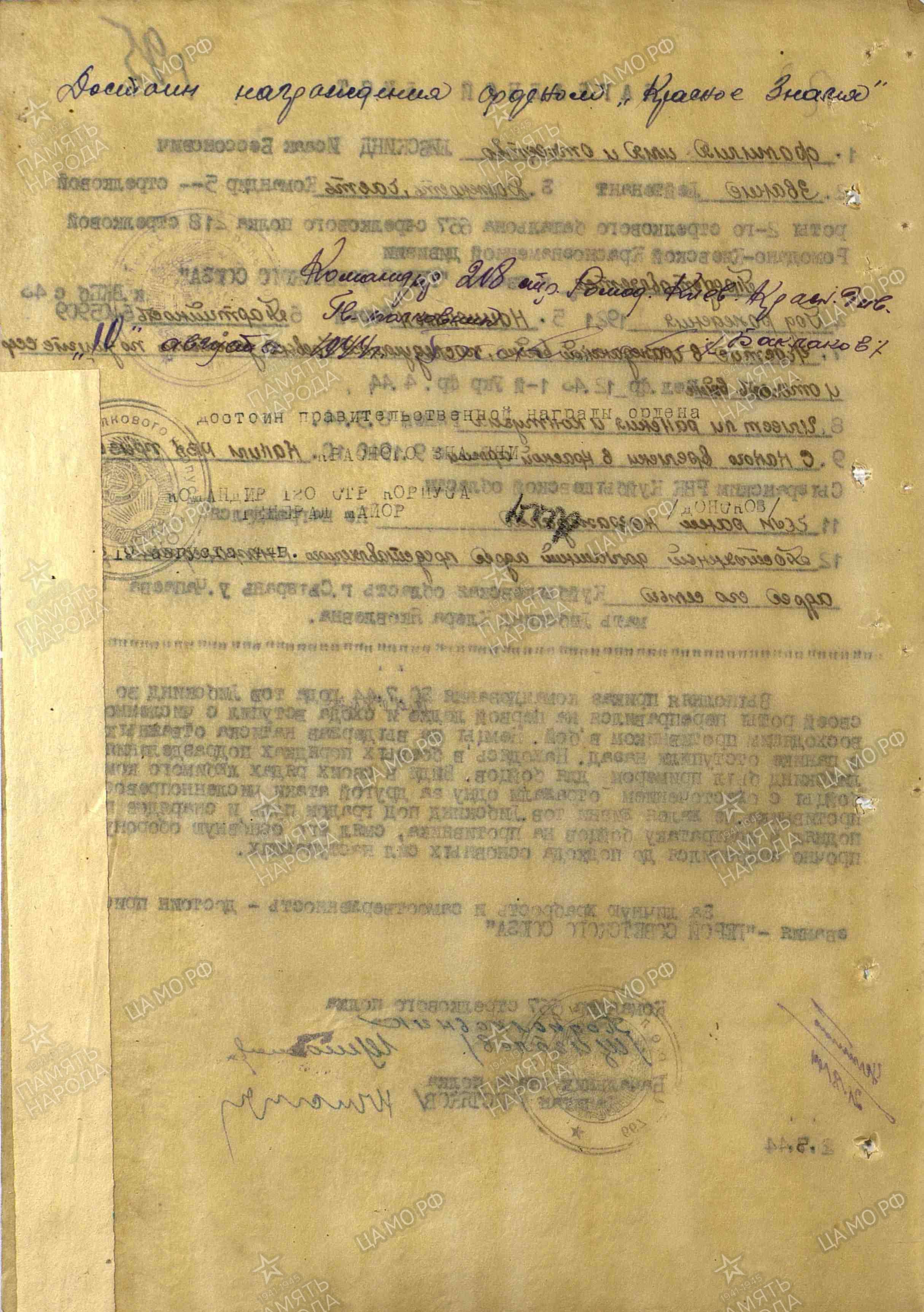 1. НАГРАДНОЙ ЛИСТ на орден: 1. "АЛЕКСАНДРА НЕВСКОГО"( с портала ЭЛЕКТРОННЫЙ БАНК ДОКУМЕНТОВ «ПОДВИГ НАРОДА В ВЕЛИКОЙ ОТЕЧЕСТВЕННОЙ ВОЙНЕ 1941-1945 ГГ.» http://podvignaroda.ru/?#tab=navHome ).