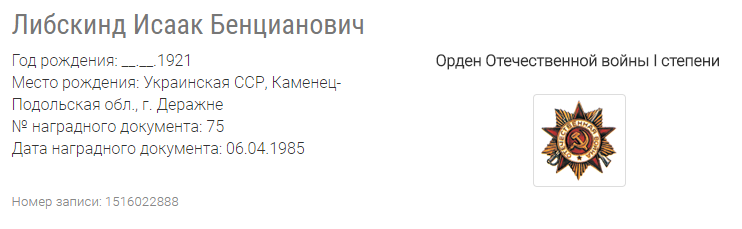 Лейтенант ЛИБСКИНД ИСААК БЕССОНОВИЧ (Бенцианович), 1921 года рождения, место рождения - Украинская ССР, Каменец-Подольская область, г. Деражне, еврей. В РККА призван Сызранским ГВК, Куйбышевской области, 09.1940 года. В Великой Отечественной войне с 06.1941 года( на Юго-Западном, Белорусском и 1 Украинском фронтах) - Командир 5 стрелковой роты, 2 стрелкового батальона, 667 стрелкового полка, 218 стрелковой Ромодано-Киевской ордена Ленина Краснознаменной ордена Суворова 2 степени дивизии, 22 стрелкового корпуса, 3 гвардейской Армии, 1 Украинского фронта. Ранения: 1. 8.05.1944 года. Боевые награды: 1. Орден "АЛЕКСАНДРА НЕВСКОГО"( Из НАГРАДНОГО ЛИСТА на звание "ГЕРОЙ СОВЕТСКОГО СОЮЗА": "Выполняя Приказ командования, 30.07.1944 года, тов. ЛИБСКИНД, во главе своей роты, переправился, на первой лодке, и сходу вступил, с численно превосходящим противником, в бой. Немцы, не выдержав натиска отважных, в панике, отступили назад. Находясь, в боевых порядках подразделения, тов. ЛИБСКИНД был примером для бойцов. Видя, в своих рядах, любимого командира бойцы, с ожесточением, отражали одну за другой, атаки численно превосходящего противника. Не жалея жизни, тов. ЛИБСКИНД, по градом пуль и снарядов противника, поднял, в контраатаку, бойцов, на противника, смял его основную оборону и прочно закрепился до подхода основных сил наступающих. За личную храбрость и самоотверженность достоин присвоения звания "ГЕРОЙ СОВЕТСКОГО СОЮЗА". Командир 667 стрелкового полка Подполковник ЩИГОЛЕВ. 2.08.1944 г."; ЗАКЛЮЧЕНИЕ ВЫШЕСТОЯЩИХ НАЧАЛЬНИКОВ: Достоин награждения орденом "КРАСНОЕ ЗНАМЯ". Командир 218 стрелковой Ромодано-Киевской ордена Ленина Краснознаменной ордена Суворова 2 степени дивизии Гвардии полковник БАКЛАКОВ. 10 августа 1944 года.";№ записи 31184349); 2. Орден "ОТЕЧЕСТВЕННАЯ ВОЙНА" 1 СТЕПЕНИ(№ наградного документа: 75 ;Дата наградного документа: 06.04.1985; Номер записи: 1516022888) с портала ЭЛЕКТРОННЫЙ БАНК ДОКУМЕНТОВ «ПОДВИГ НАРОДА В ВЕЛИКОЙ ОТЕЧЕСТВЕННОЙ ВОЙНЕ 1941-1945 ГГ.» http://podvignaroda.ru/?#tab=navHome ). Вернулся с Великой Отечественной войны, со смертельной должности - Командира стрелковой роты! Послевоенная судьба неизвестна. Вечная Слава и Память, настоящему, Герою Великой Отечествененой войны, лейтенанту ЛИБСКИНДУ ИСААКУ БЕССОНОВИЧУ!