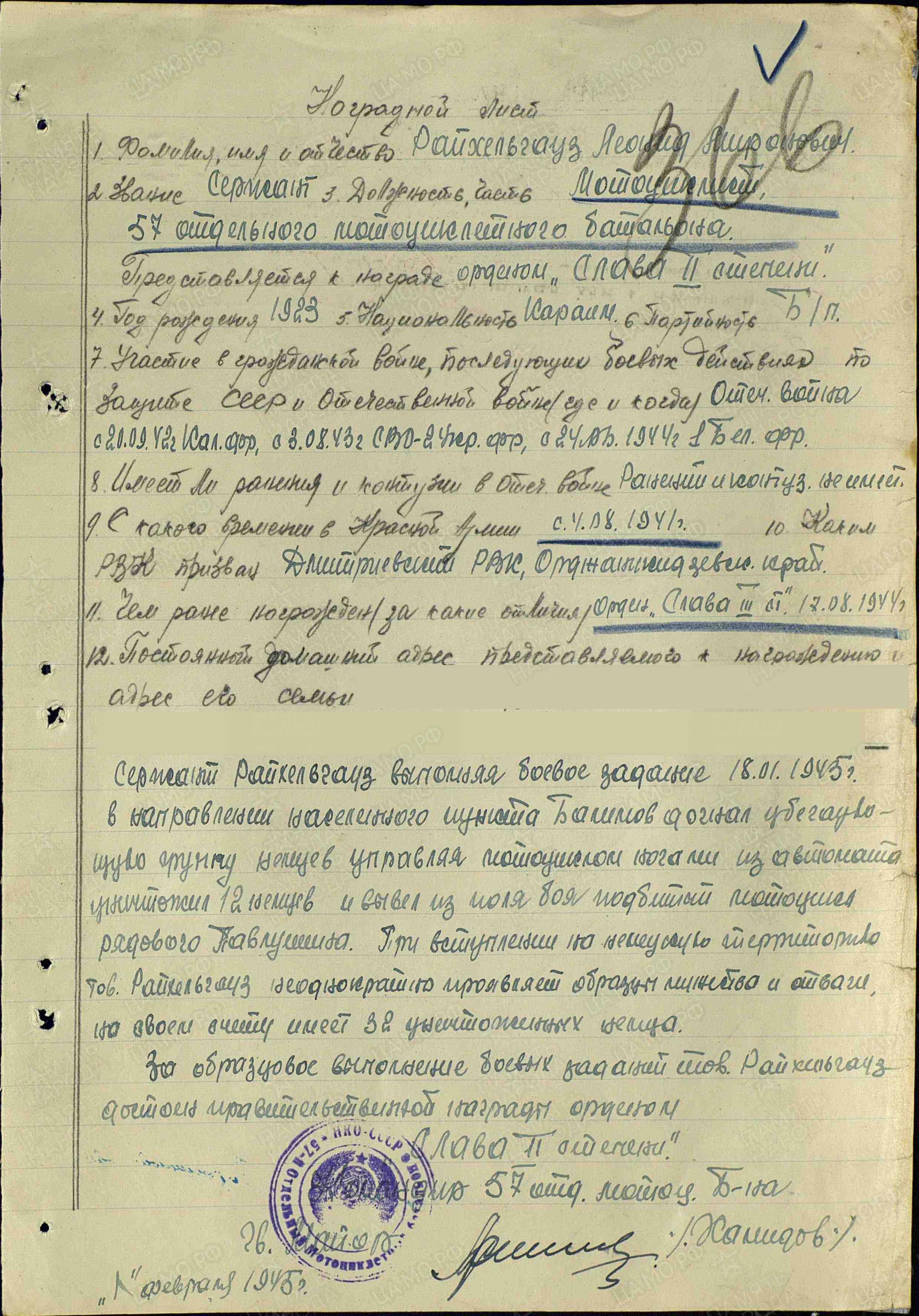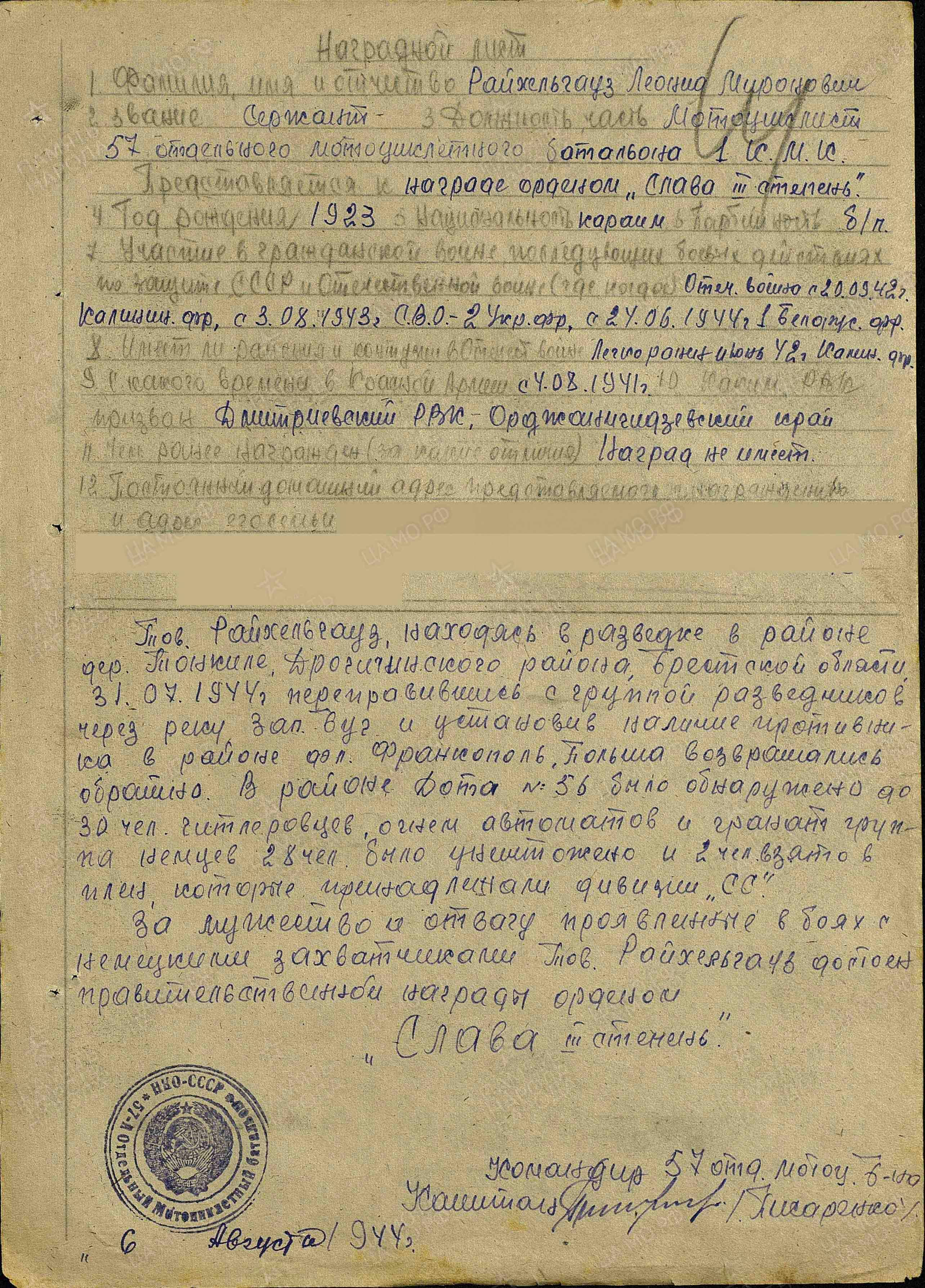 За мужество и отвагу проявленные в боях с немецкими захватчиками тов. Райхельгауз достоин