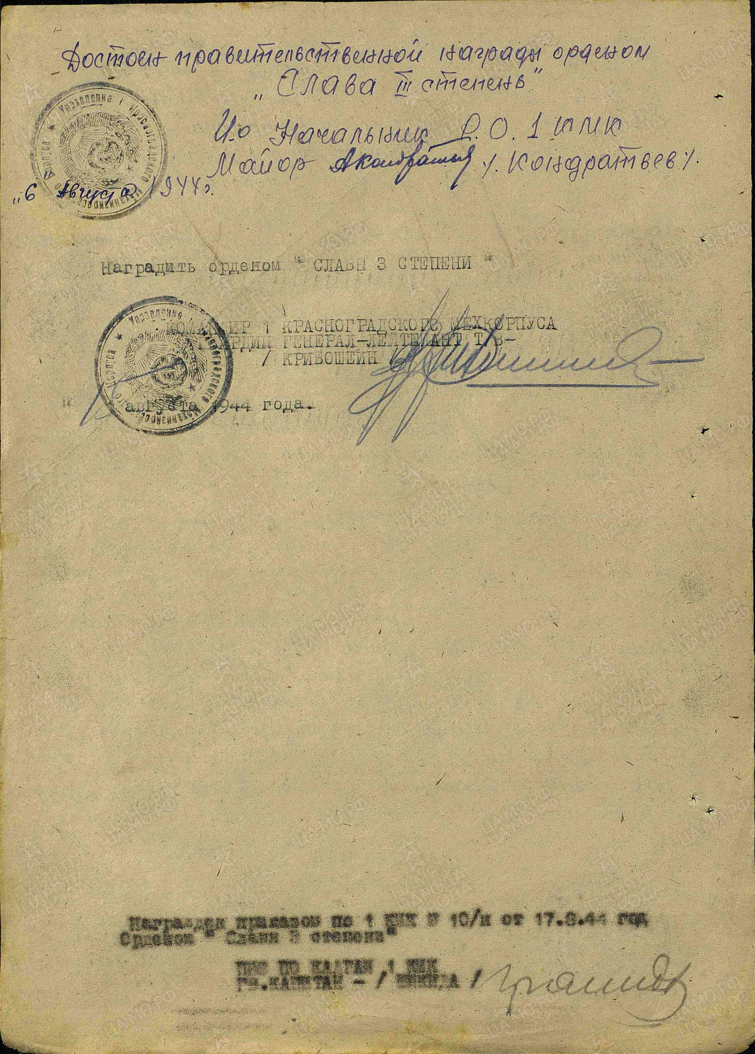Чем ранее награжден (За какие отличия) орден «Слава 3 степени» 17.08.1944 г.