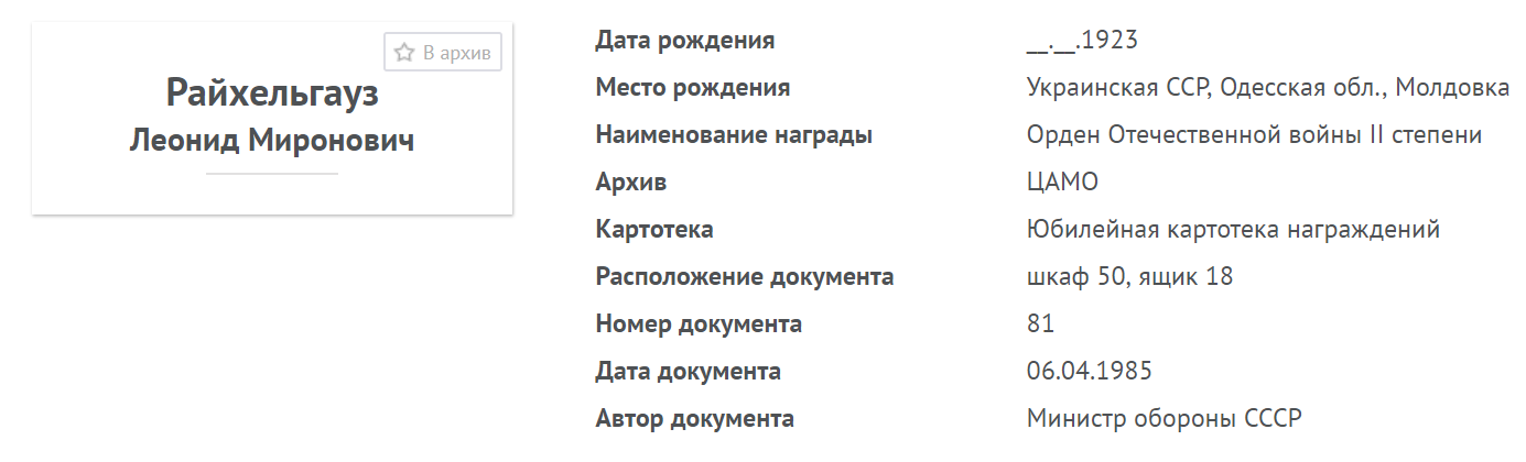 Райхельгауз Леонид Миронович родился в 1923 году в Украинская ССР, Одесская обл., Голованевский р-н, в с.Молдовка. Еврей.