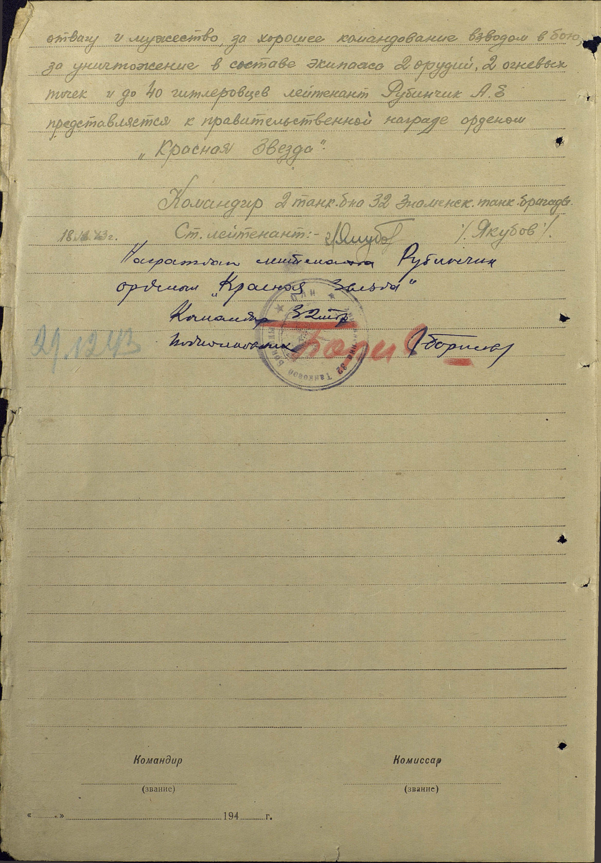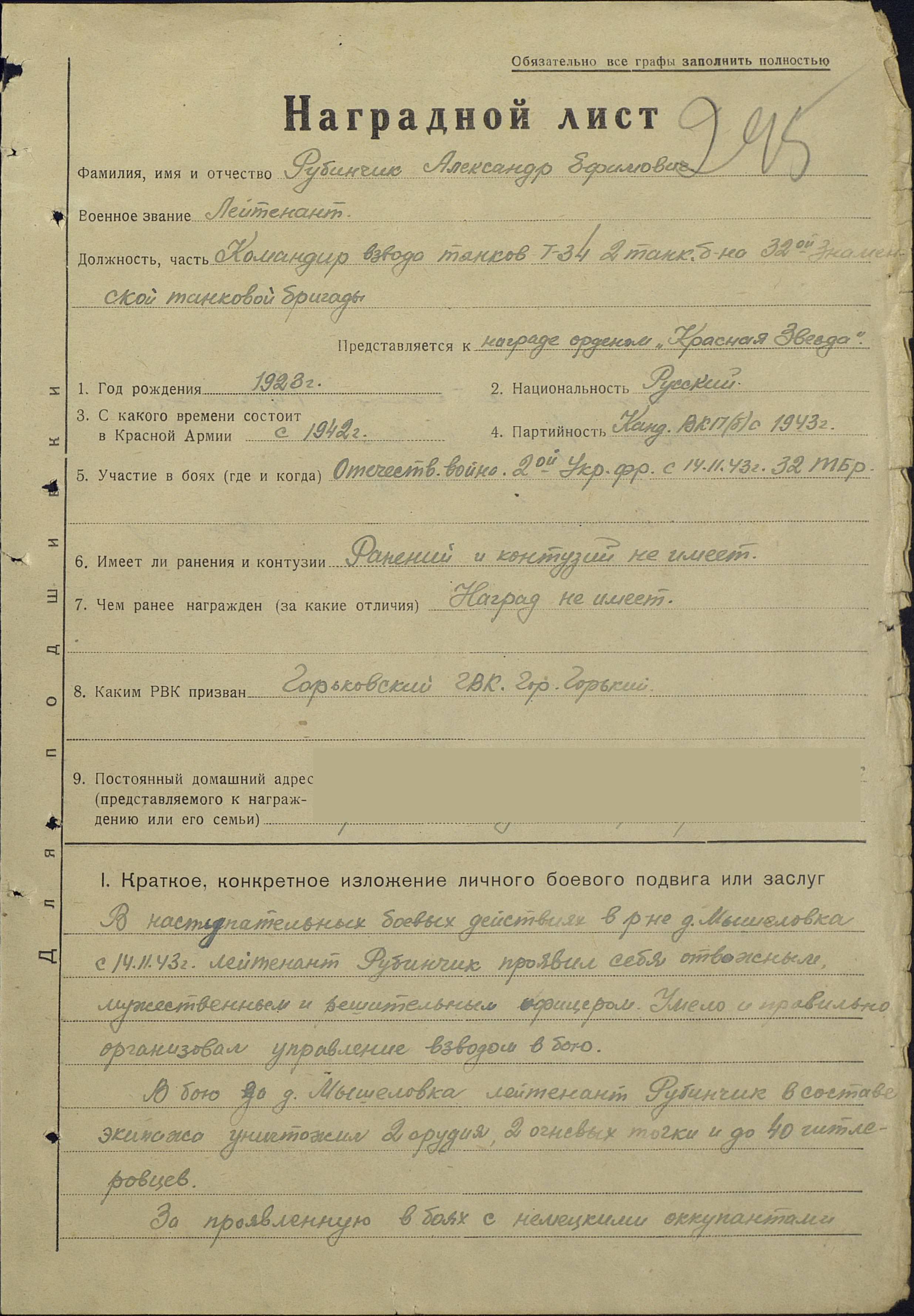командир танкового взвода   32-ой Знаменской танковой бригады 1943