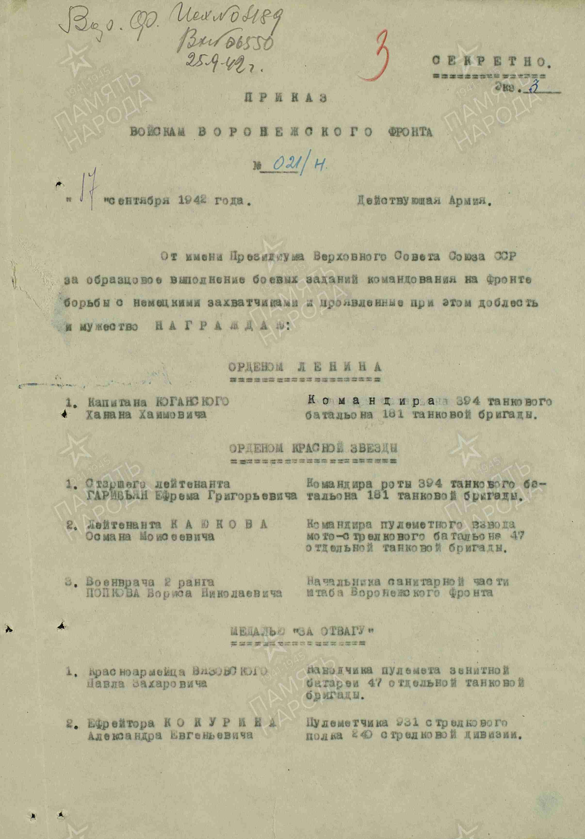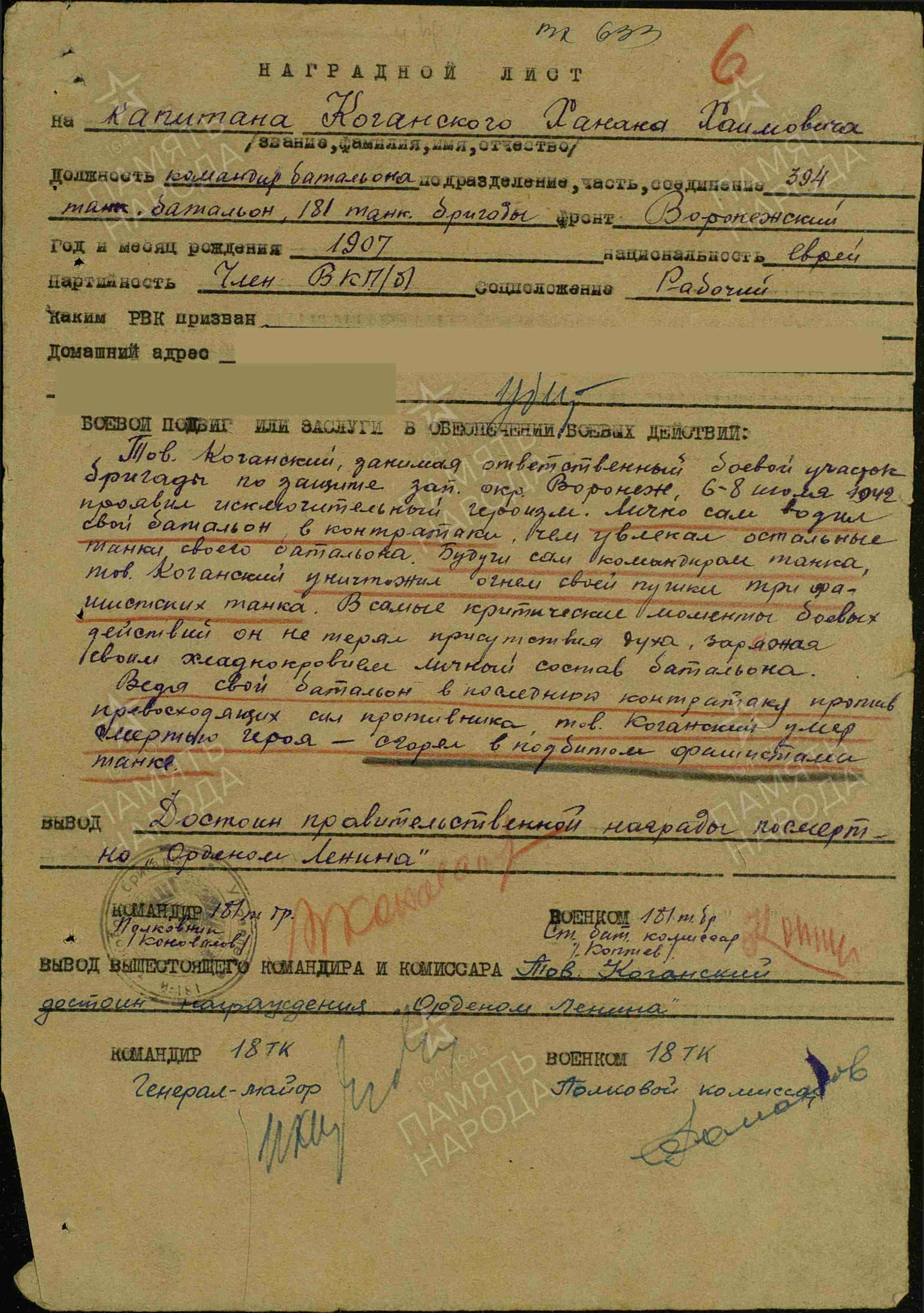 Примечание: Капитан КАГАНСКИЙ Х. Х. сгорел, с экипажем, в бою, 8.07.1942 года, на западной окраине г. Воронеж, Воронежской области, РСФСР. Захоронен (в настоящее время): РОССИЯ, Воронежская область, г. Воронеж, ул. 20-летия Октября, 37 д, мемориал "Чижовский плацдарм", братская могила №1.