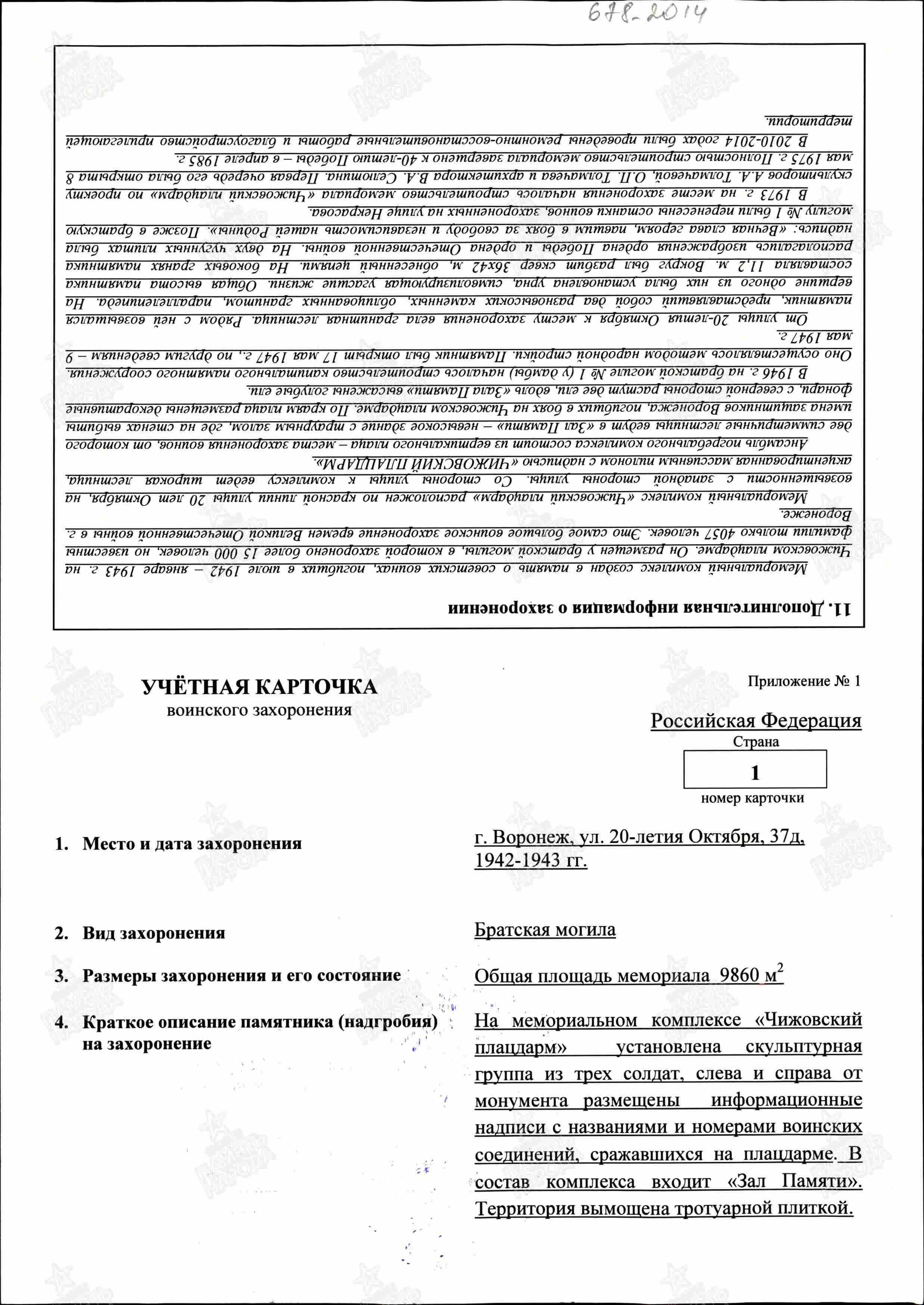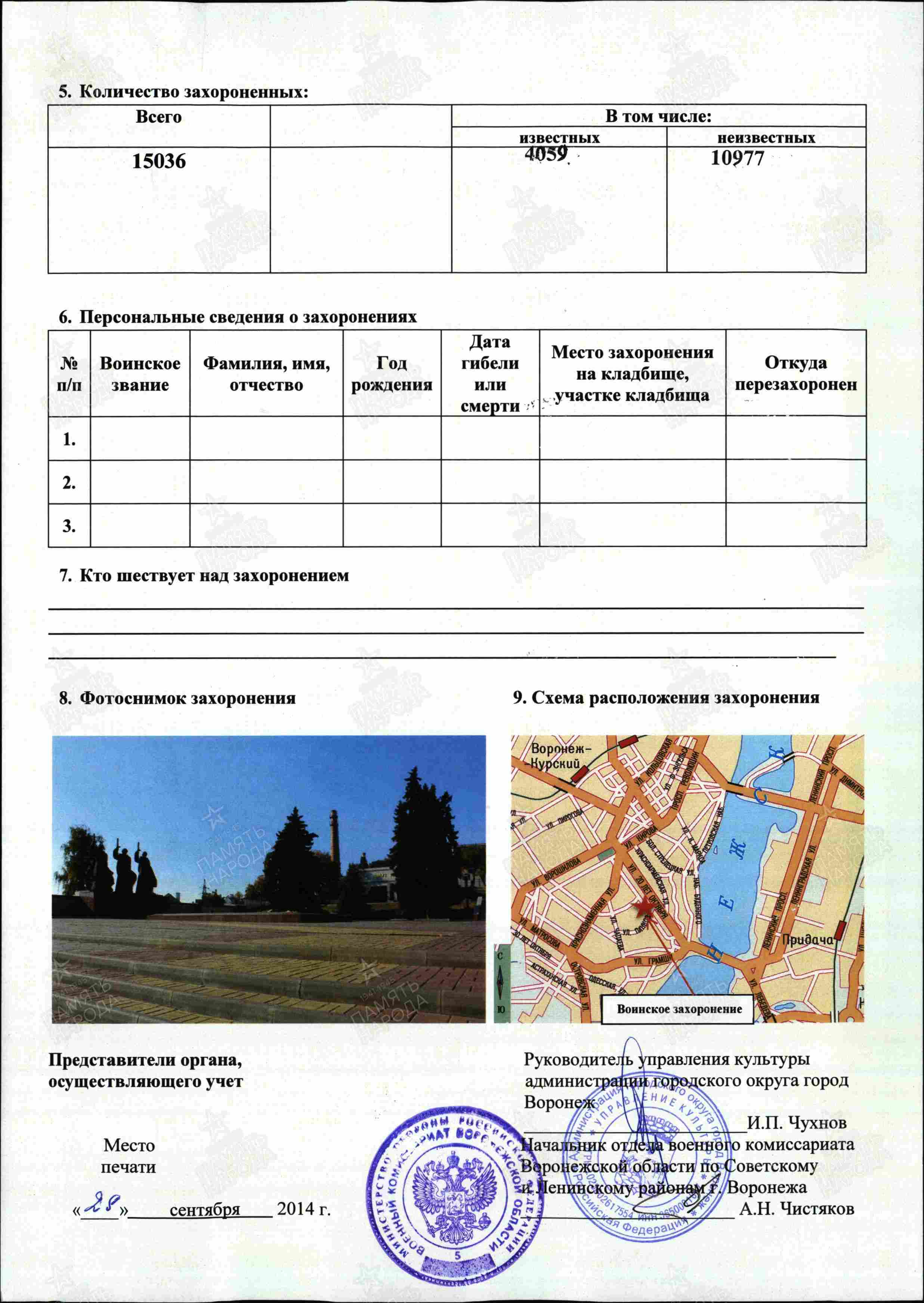 3. Захоронение: РОССИЯ, Воронежская область, г. Воронеж, ул. 20-летия Октября, 37 д, мемориал "Чижовский плацдарм", братская могила №1(Туристско - информационный центр Воронежа: https://clck.ru/UX5gN   );