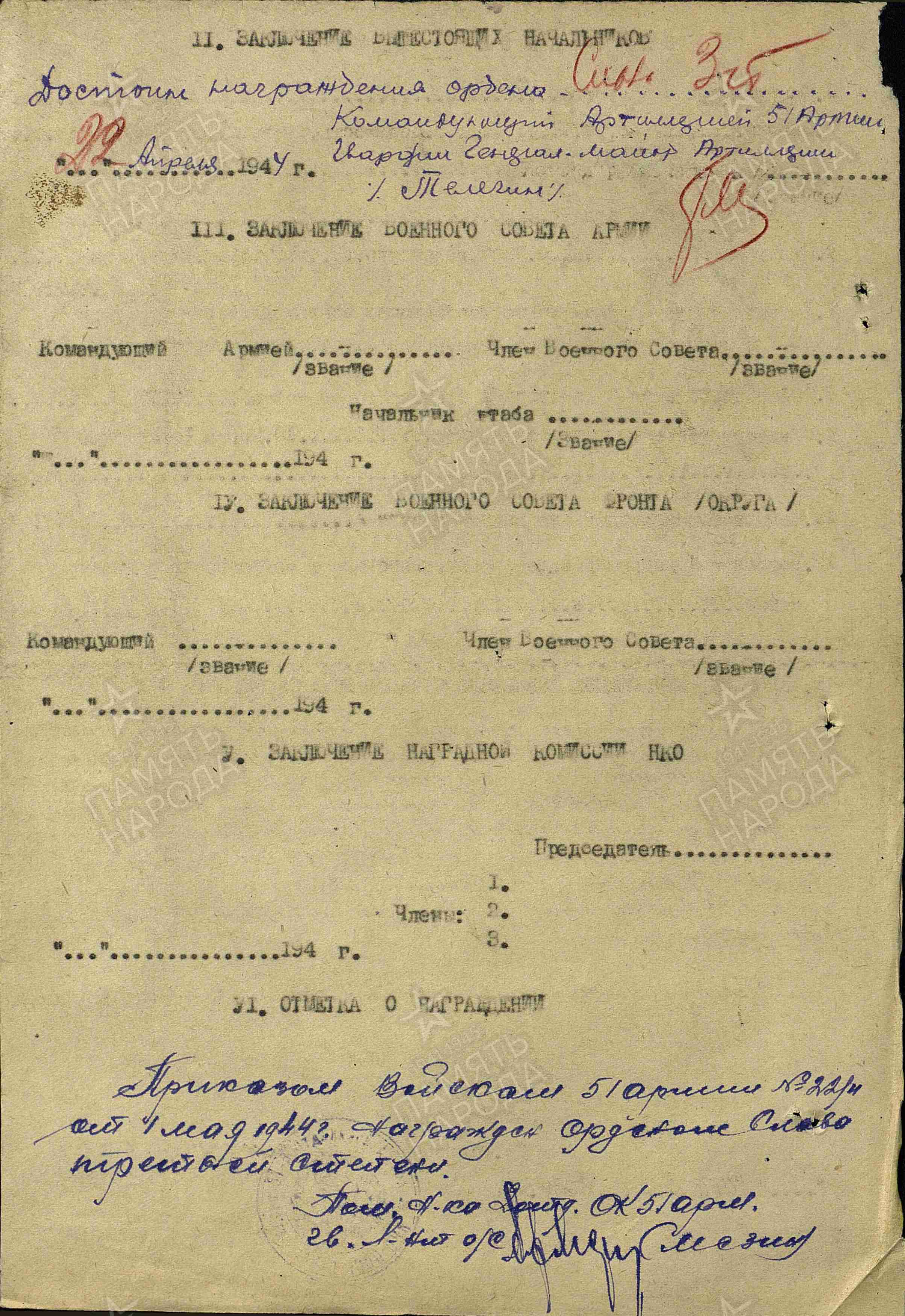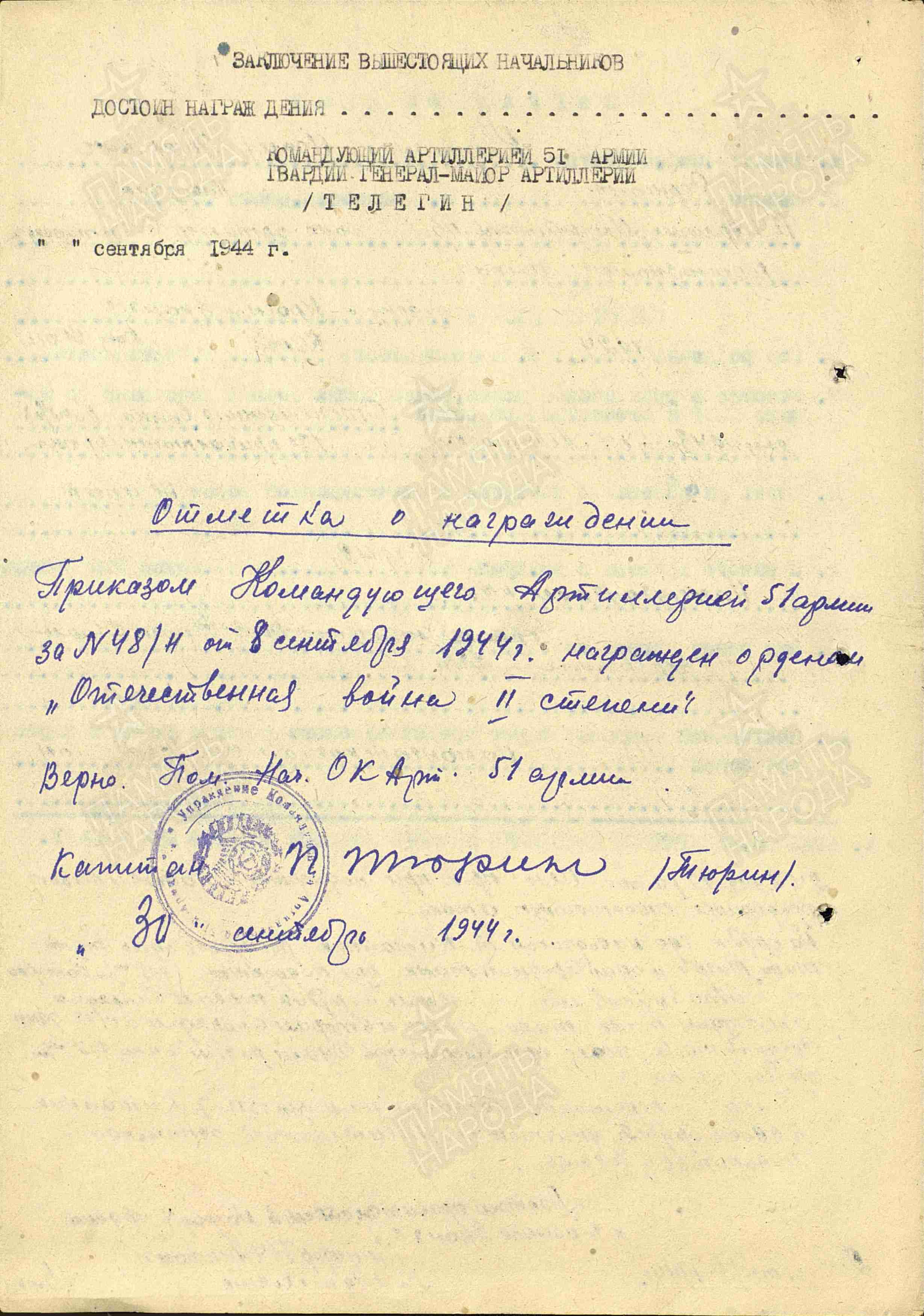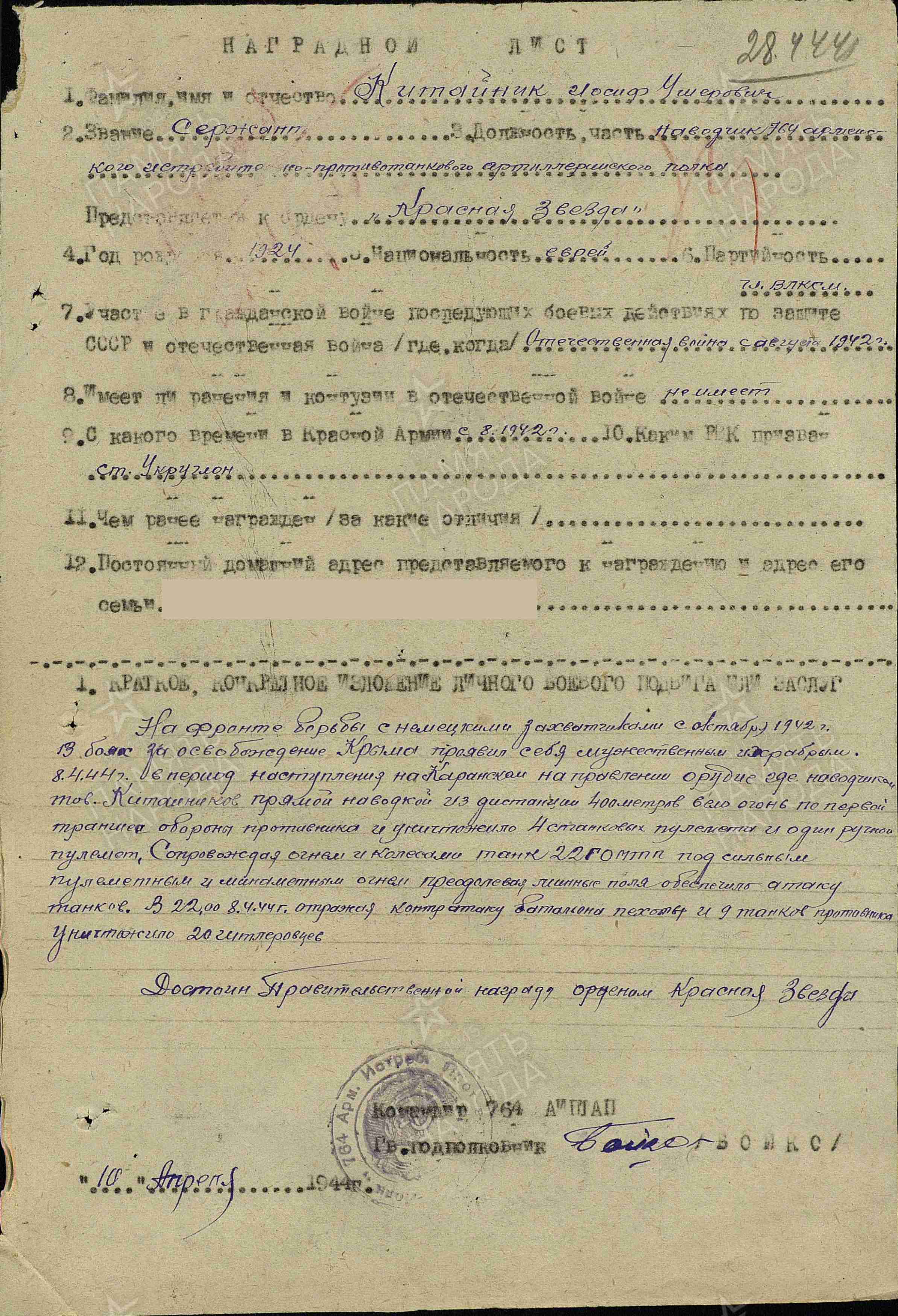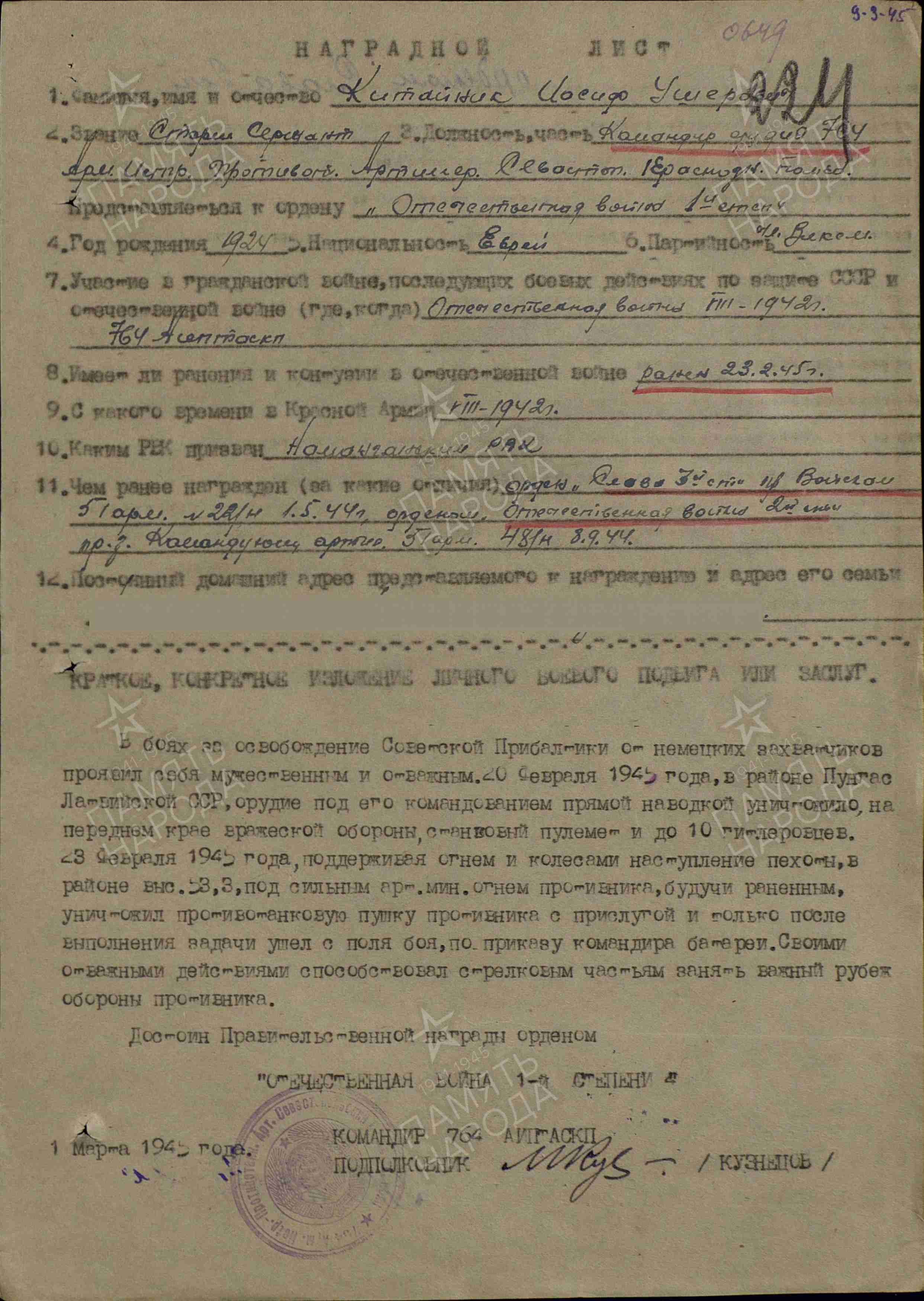 Китайник Иосиф Ушерович. Орден Отечественной войны I степени