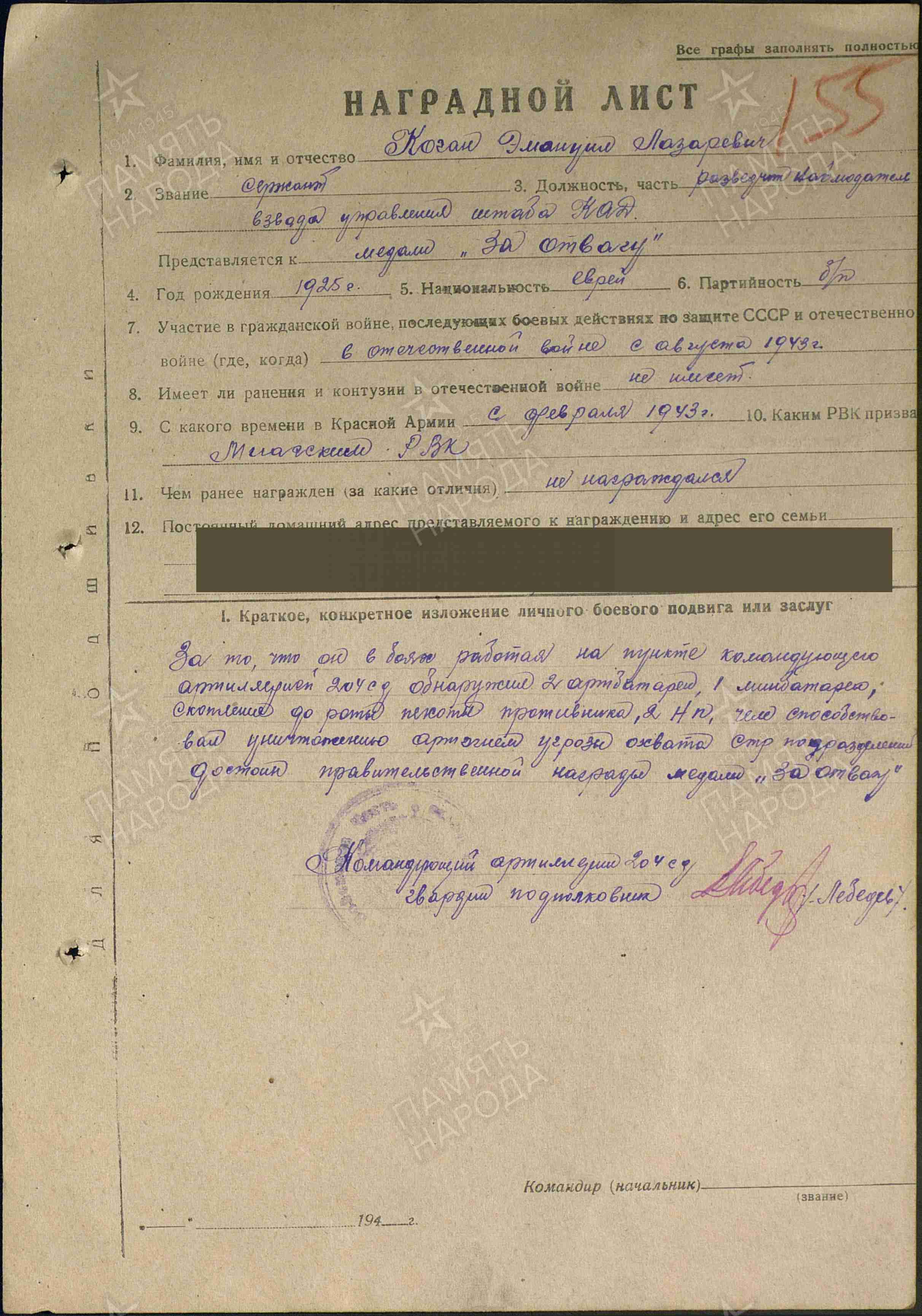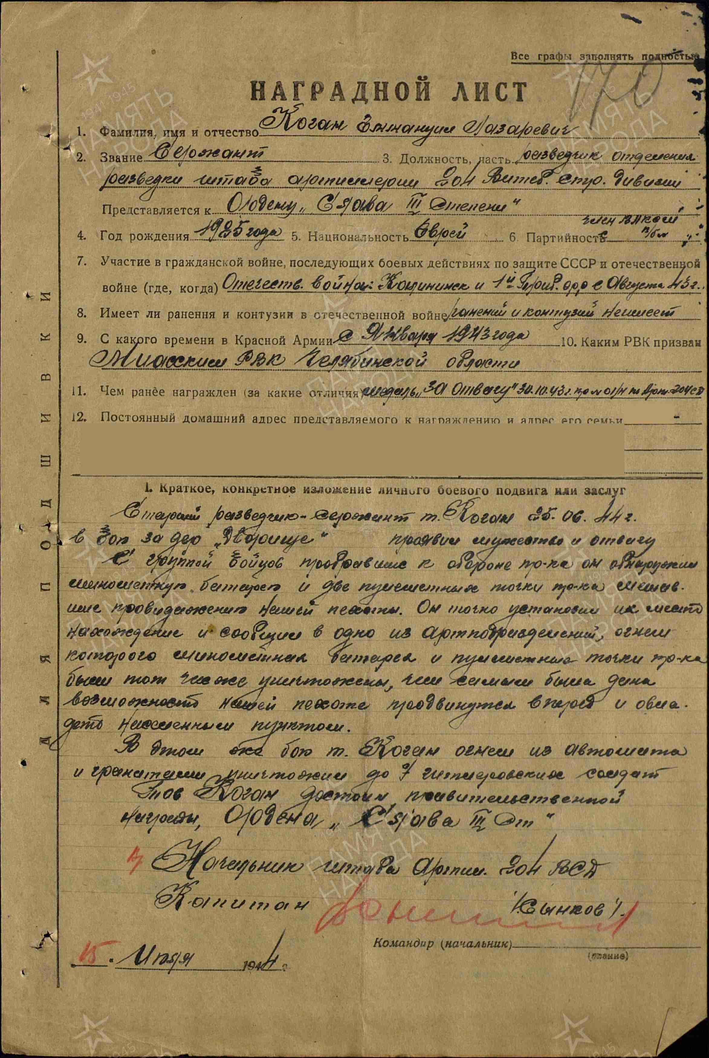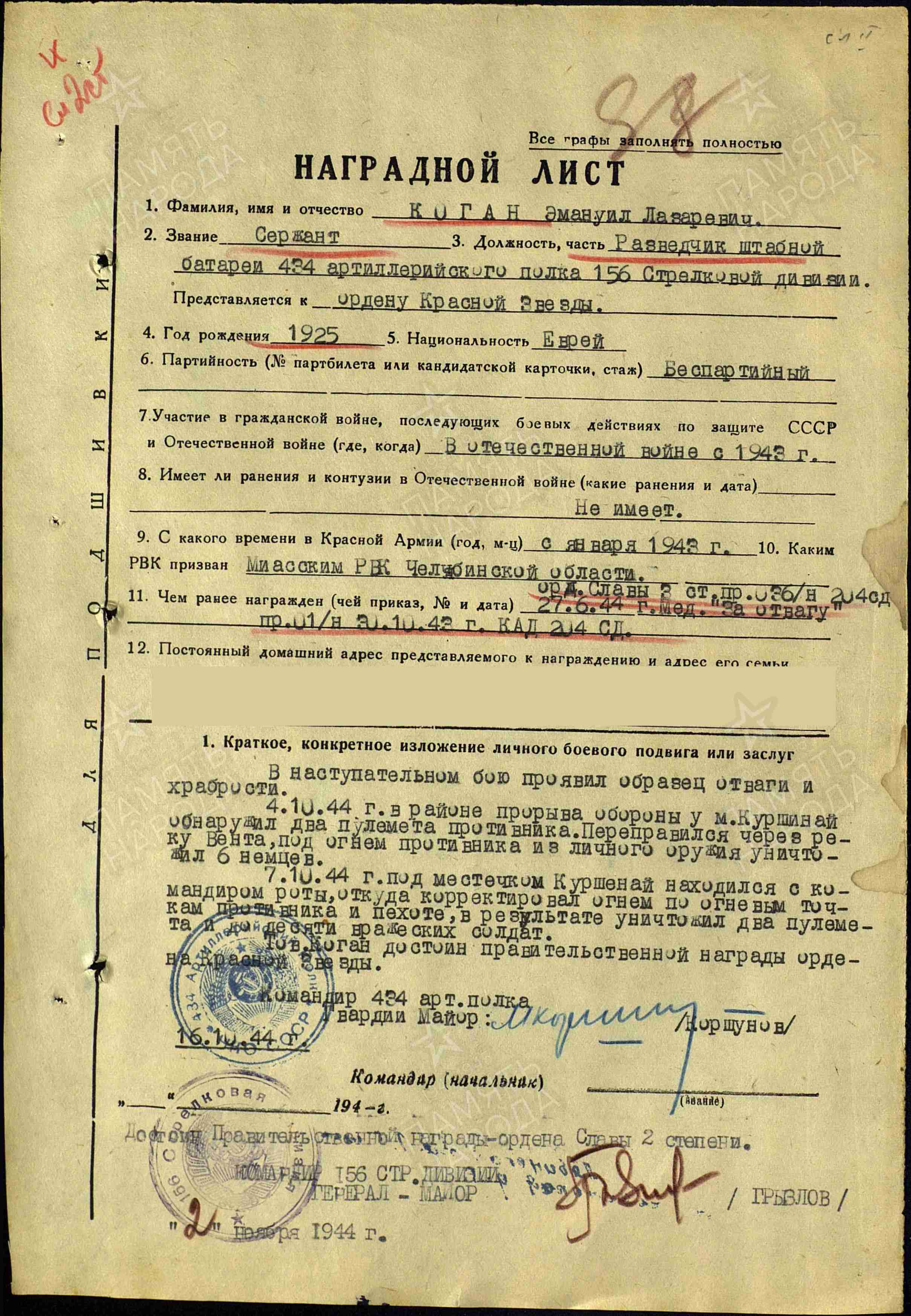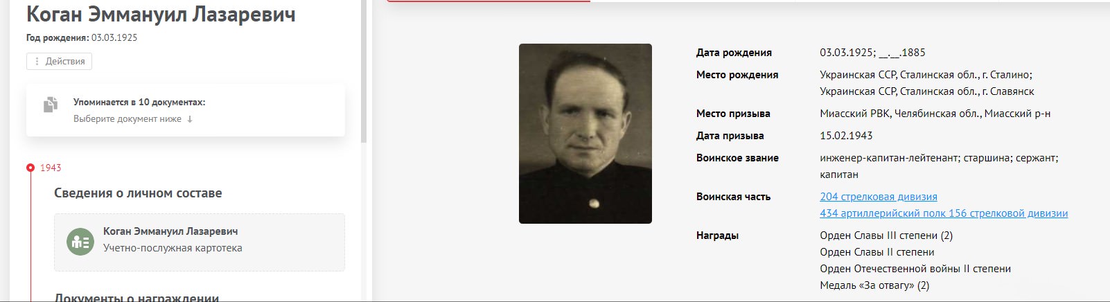 Коган Эммануил Лазаревич родился 3.03.1925 в городе Славянск Сталинской области Укр.ССР. Еврей.