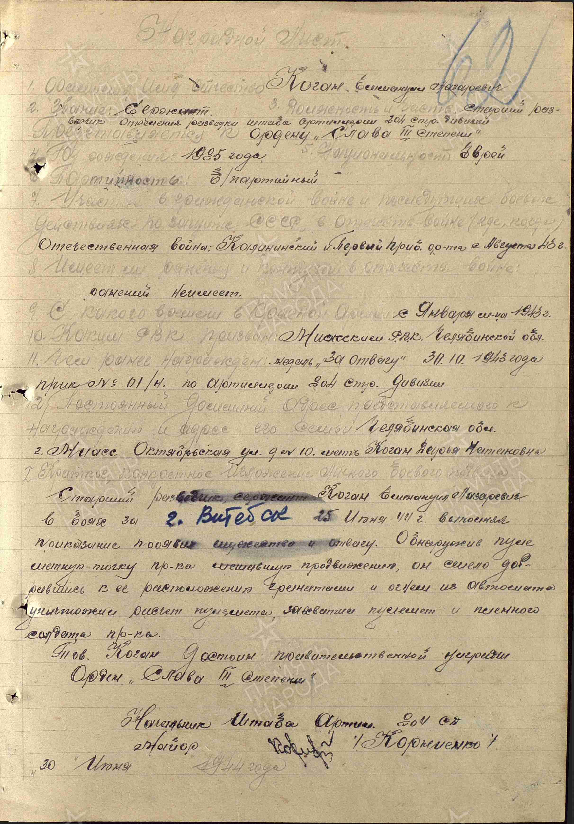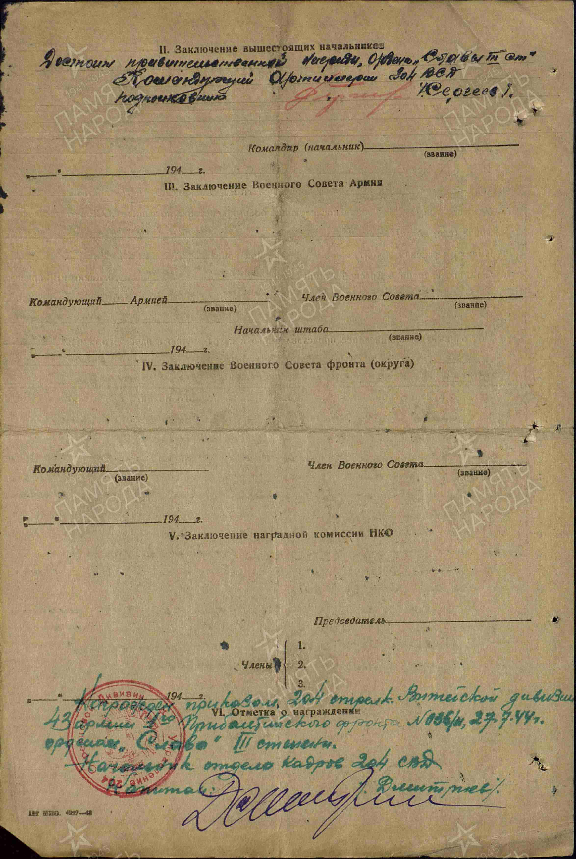 27.07.1944 Орден Славы III степени