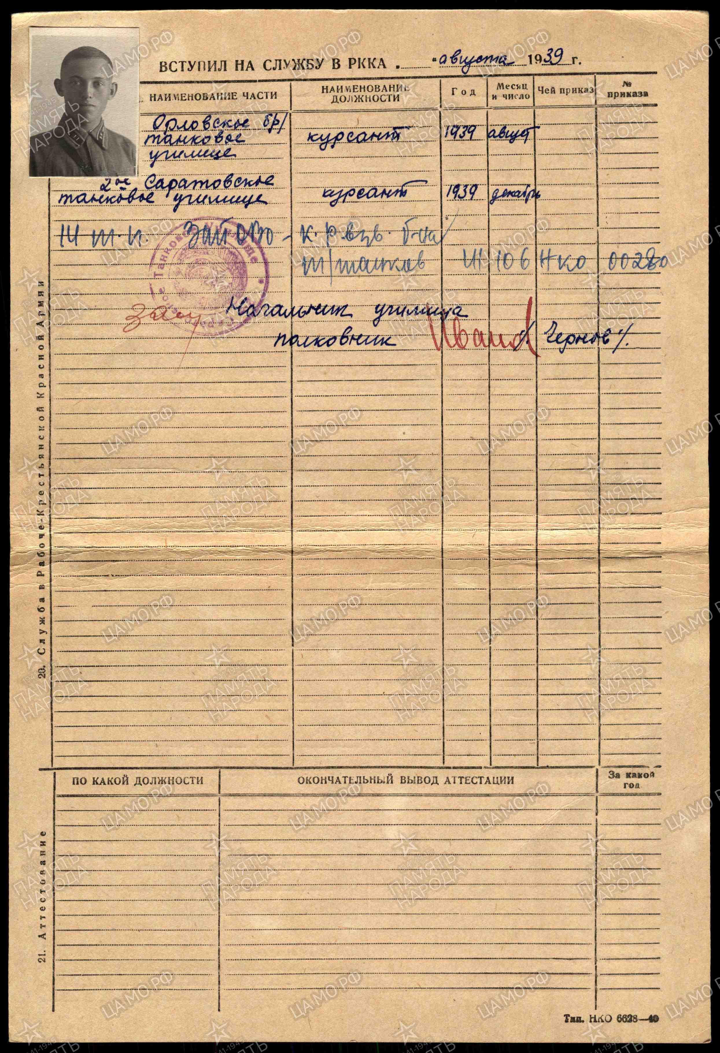 10.6.1941 окончил 2-е Саратовское танковое училище и направлен для продолжения службы в Западный Особый Военный Округ.