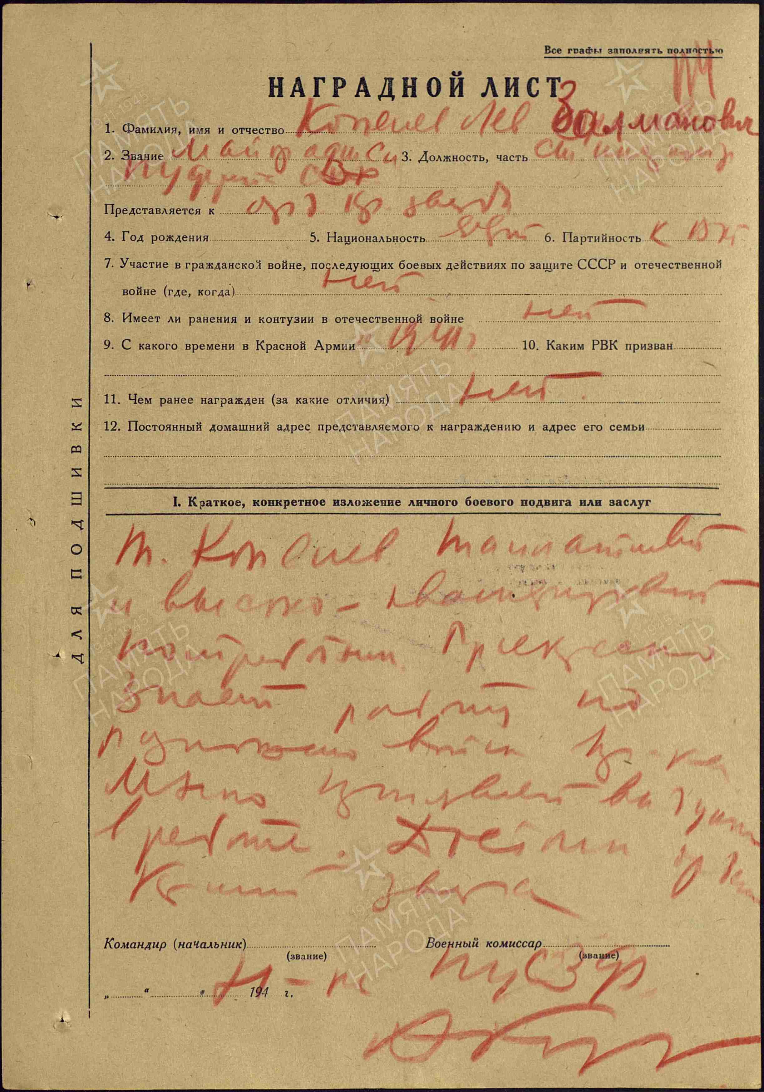 " Майор Копелев Лев Залманович старший инструктор 7 отдела политуправления СЗФ, прекрасно зная немецкий язык, западноевропейскую, в т ч германскую литературу и историю Германии, за время войны прекрасно изучил противостоящего войскам СЗФ противника и деталях знает части и соединения 16 армии как с политической так и с военной стороны. Обладая литературным талантом, выдумкой и исключительной инициативой, он является автором большой части оперативных листовок изданных политправлением СЗФ, и многих армейских. Многократно проявлял не только мужество, но и исключительную инициативу и смелость в работе. Проделал исключительно ценную работу по организации антифашистского школы, разработке программы и методики преподавания. Является лучшим из преподавателей в школе, пользующимся наибольшим авторитетом среди слушателей. В деле используя антифашистов и вообще военнопленных на фронте проявил большую инициативу и творческую энергию.