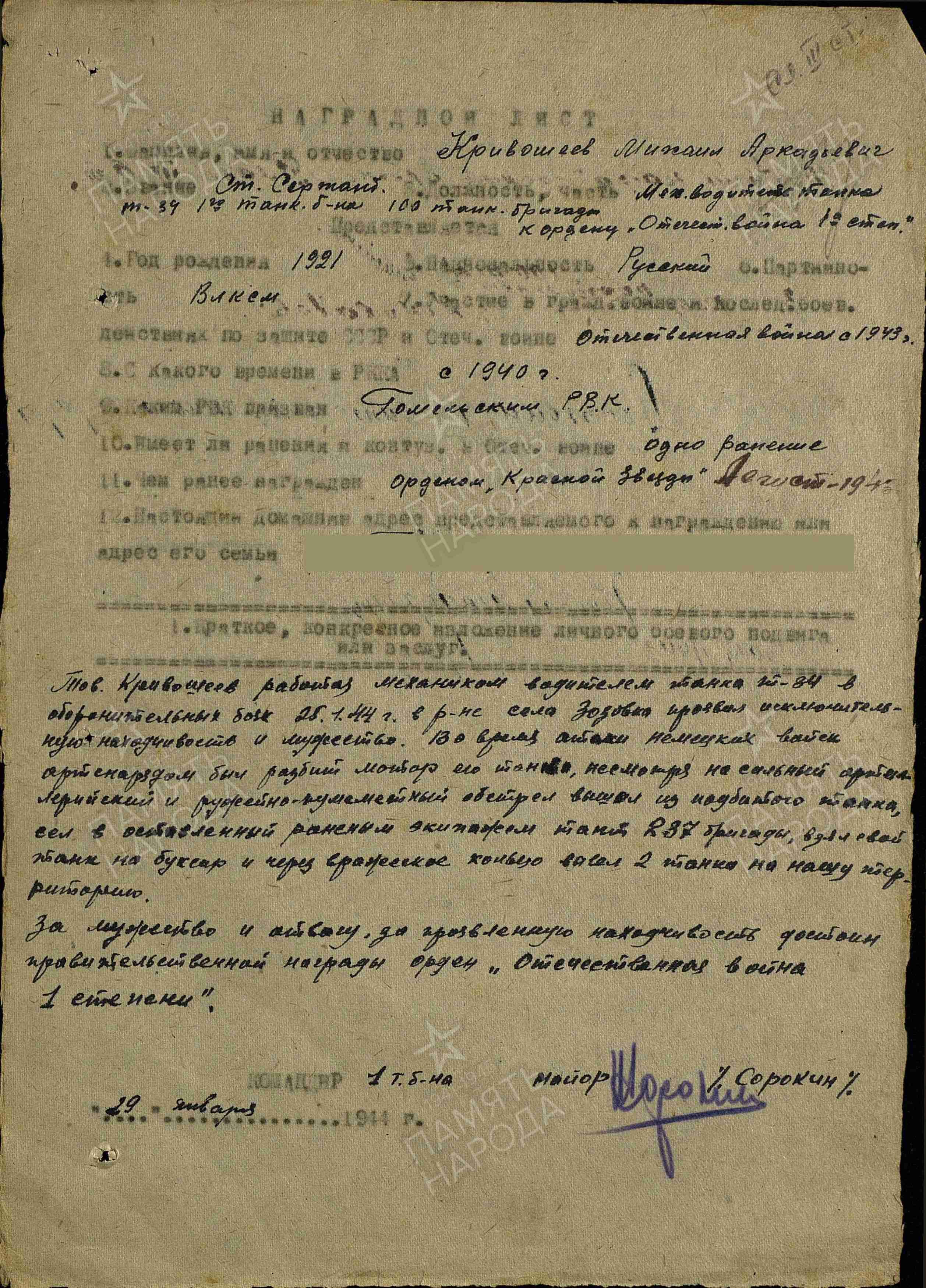 Кривошеев Михаил Аркадьевич. Орден Отечественной войны I степени