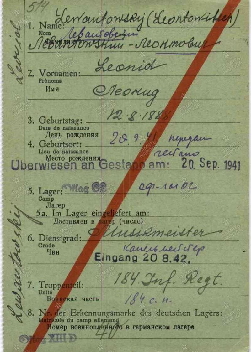 Техник - интендант 1 ранга (старший лейтенант) ЛЕВАНТОВСКИЙ ЕВЕЛЬ (ЛЕОНИД, ЕВГЕНИЙ) ДАВИДОВИЧ, 12.09.1888 года рождения, место рождения - РОССИЙСКАЯ ИМПЕРИЯ, Черниговская губерния, Конотопский уезд, гуездый город Конотоп (по административному делению: 1. СССР: Украинская ССР, Сумская область, Конотопский район, г. Конотоп; 2. УКРАИНЫ: Сумская область, Конотопский район, г. Конотоп), еврей. Проживал, до 1932 года: Украинская ССР, Черниговская область, Прилукский район, г. Прилуки. В РККА призван: в 1920 году; в 1932 году. Участник советско - финской войны 1939 - 1940 гг. В Великой Отечественной войне с 22.06.1941 года в должности (последняя): Капельмейстера взвода музыкантов штаба 184 стрелкового Краснознамённого полка, 56 стрелковой Московской Краснознамённой дивизии, 4 стрелкового корпуса, 3 армии, Западного фронта. Пленён в районе г. Минск, Минского района, Минской области, Белорусской ССР, 30.06.1941 года. В плену (назвал: 1. Имя - Леонид) Oflag 62 (XIII D) Hammelburg, военный округ XIII – Нюрнберг (Nürnberg), Бавария, Третий Рейх; в н. вр.: г. Хаммельбург (Hammelburg), район Бад-Киссинген (Bad Kissingen), административный округ Нижняя Франкония (Unterfranken), федеральная земля Бавария (Bayern), ФРГ (Bundesrepublik Deutschland ), лагерный №40. Выявлен, как еврей. Передан гестапо, 20.09.1941 года. Расстрелян после 20.09.1941 года, на учебном стрелковом полигоне школы снайперов СС, в качестве "живой мишени", под г. ХЕБЕРТСХАУЗЕН, Бавария, Третий Рейх; в н. вр.: г. Хабертсхаузен (Hebertshausen), район Дахау (Dachau), федеральная земля Бавария (Bayern; Свободное государство Бавария (Freistaat Bayern), ФРГ (Bundesrepublik Deutschland). В списке Маргариты Котиковской порядковый №402. Родственники: данных нет.