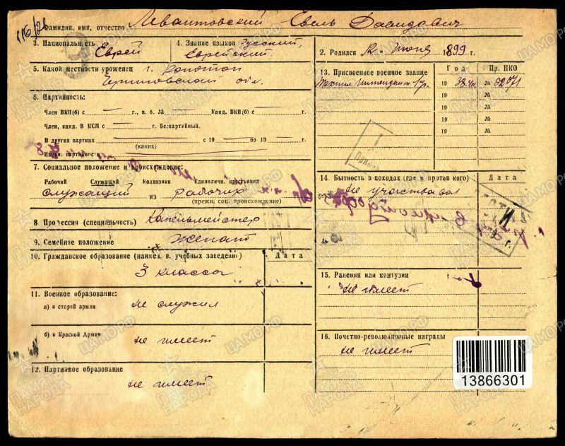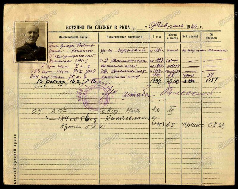 Данные из УПК (учётно - послужной карты, портал "ПАМЯТЬ НАРОДА 1941 - 1945").