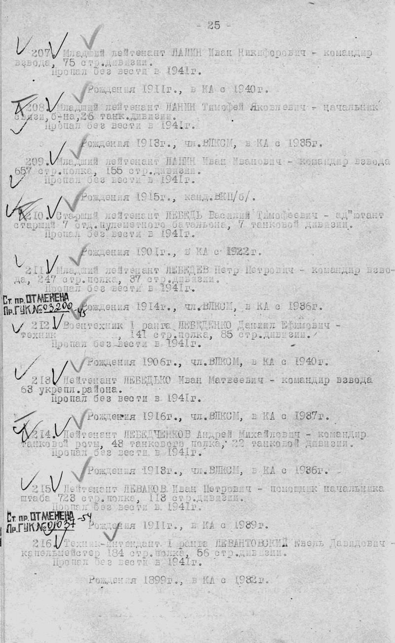 - ПНШ, капитан Остапенко Дмитрий Иванович 26.10.1905 г.р., Черниговская обл., Прилуцкий р-н, с. Замостье. В РККА с 1927 г. Жена Остапенко А.В. г.Казань ул.Нечаева, 84.