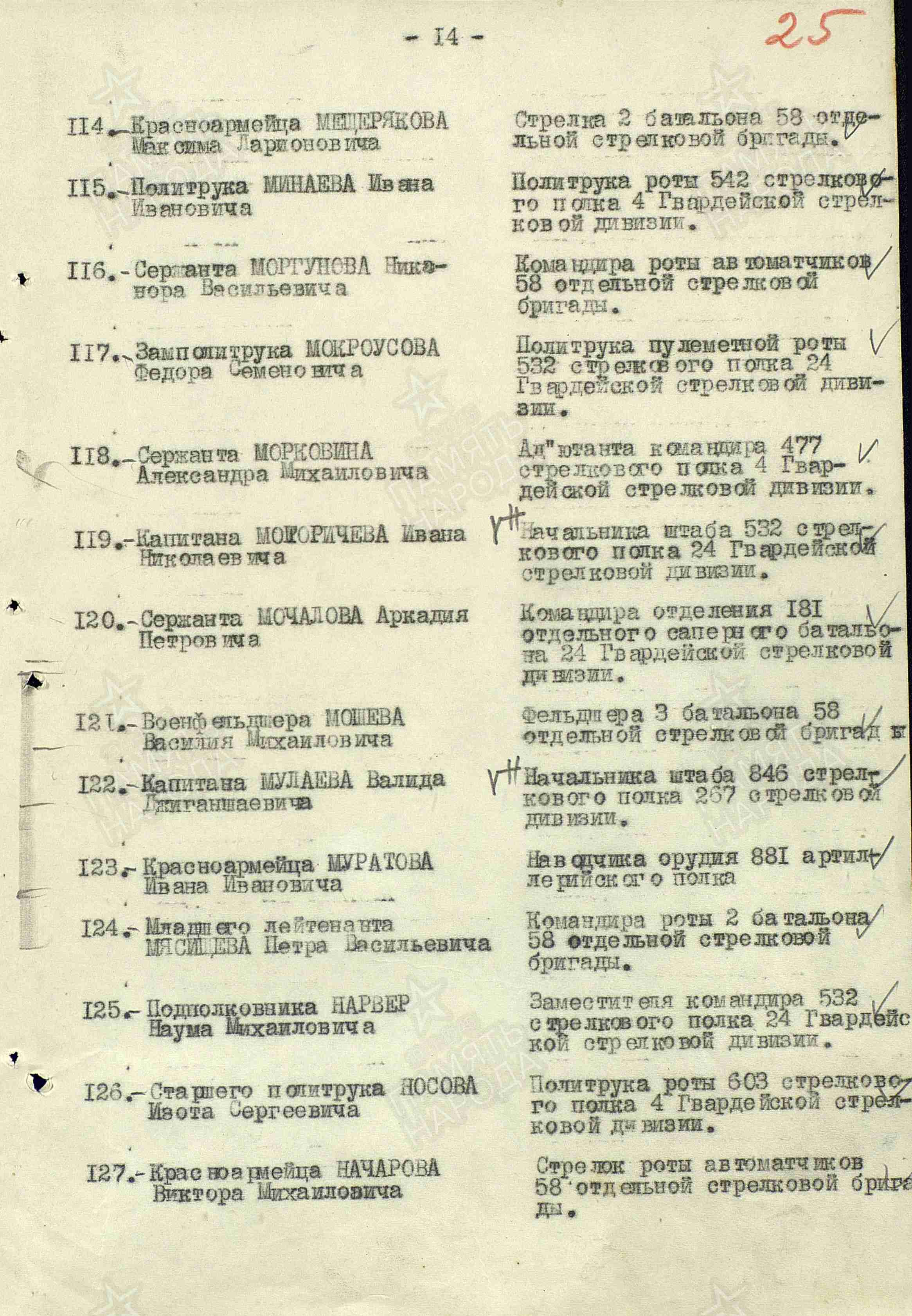 - 532 сп 111 сд ЛенФ (532 сп, 111 сд ЛенФ, 111 сд, ЛенФ); 25 гв. сд 2 УкрФ (25 гв. сд, 2 УкрФ); 321 сд 65 А Донского фронта (321 сд, 65 А Донского фронта); 82 гв. сд (82 гв. сд); 131 зсп 25 гв. сд (131 зсп, 25 гв. сд); 25 гв. сд (25 гв. сд)