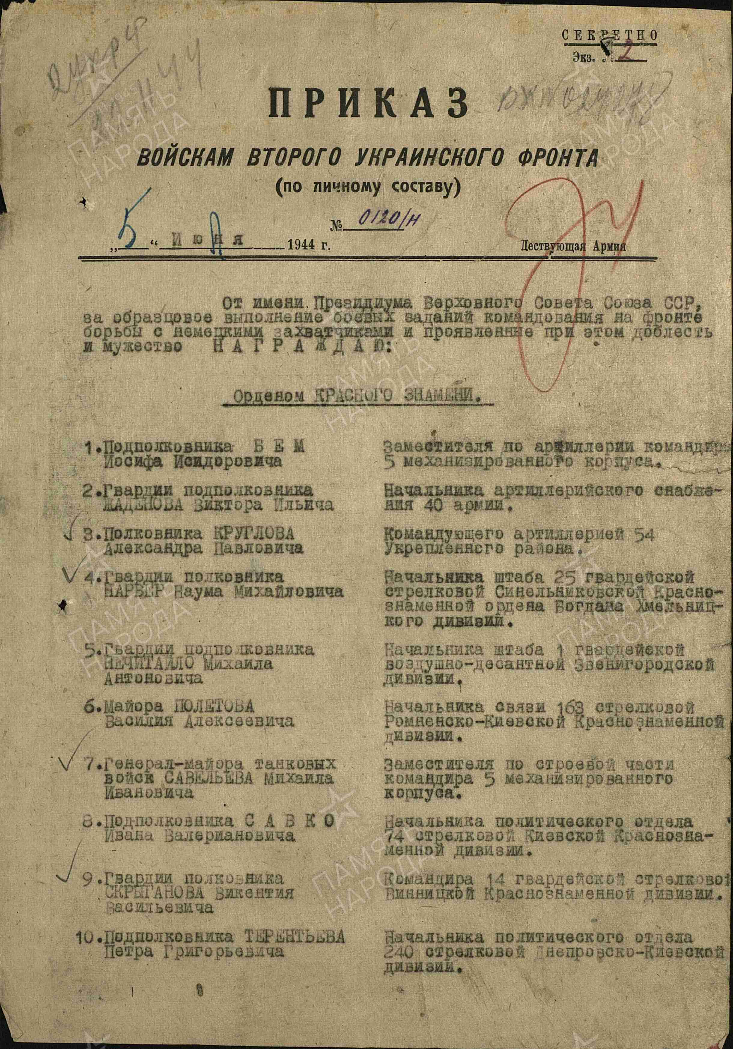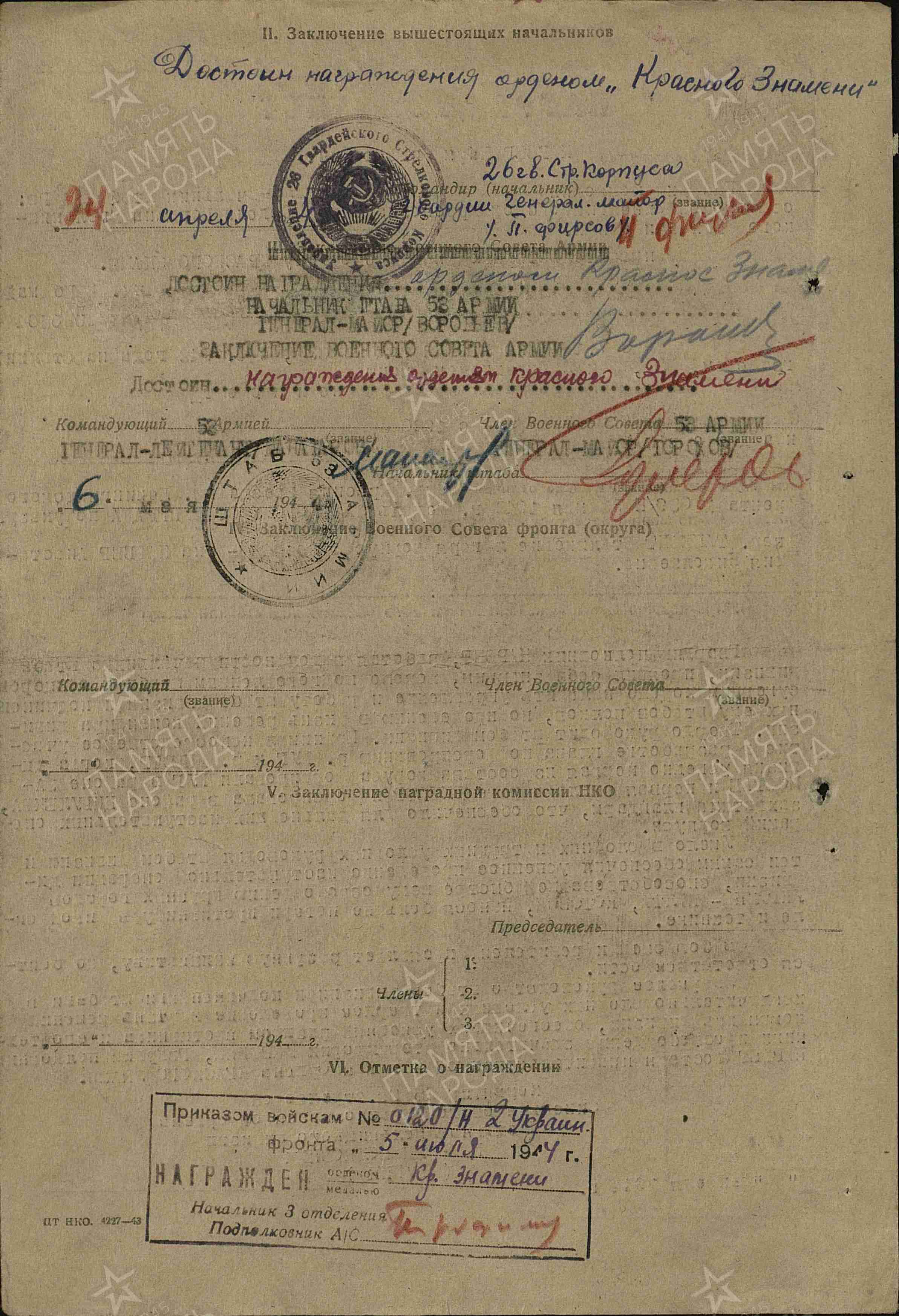| 05.07.1944 | Орден Красного Знамени |
