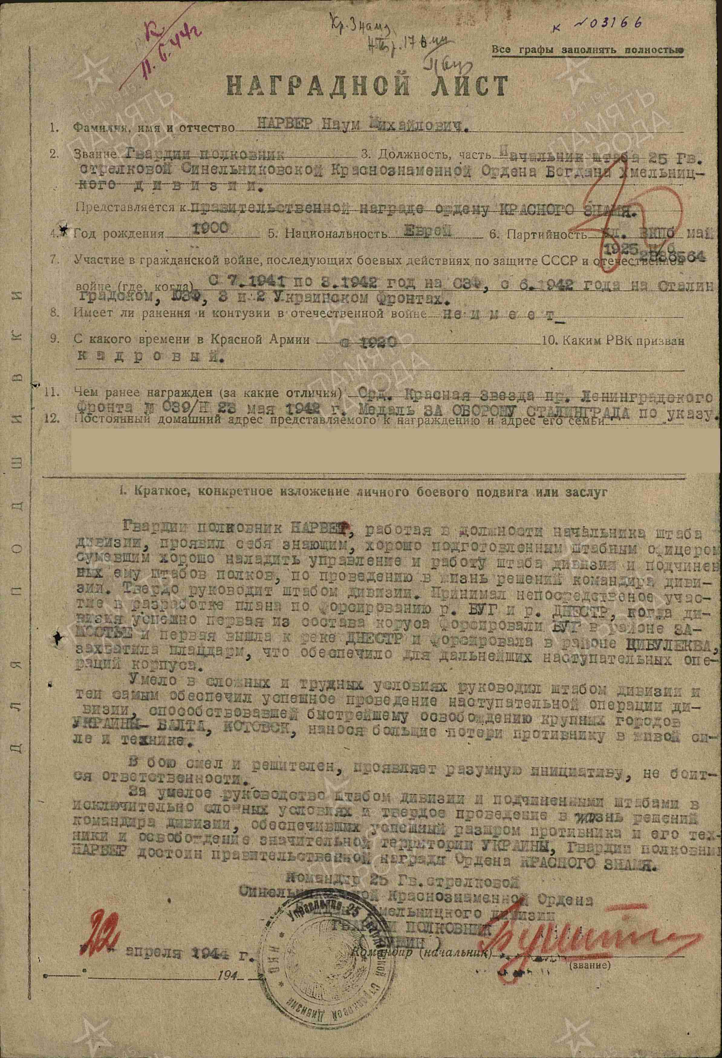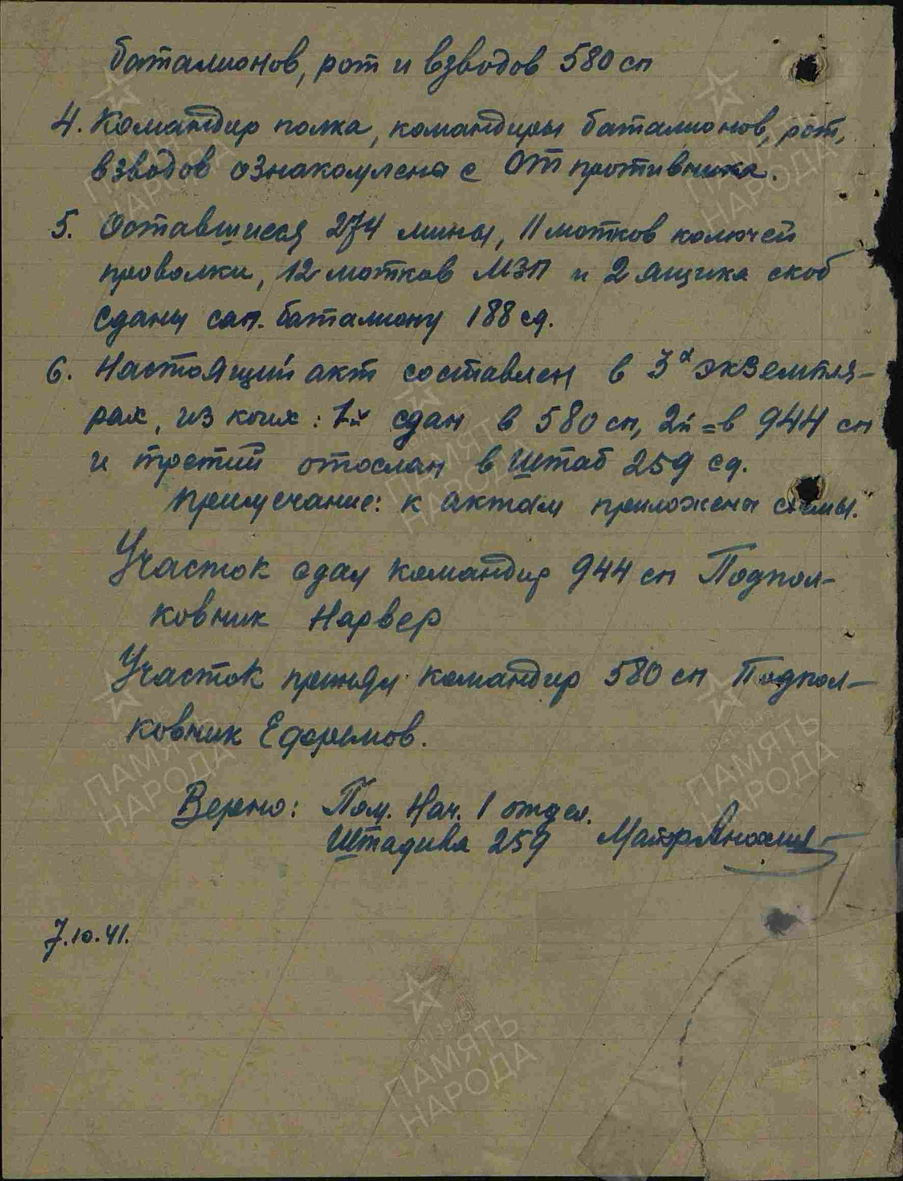 4. Полковник НАРВЕР Н. М.; документы подтверждающие нахождение в должности ("ПАМЯТЬ НАРОДА 1941 - 1945": https://clck.ru/TCC7A );