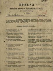 Начальник штаба 25 гвардейской стрелковой Синельниковско - Будапештской Краснознамённой орденов Суворова и Богдана Хмельницкого дивизии, 25 гвардейского стрелкового корпуса, 7 гвардейской армии, 2 Украинского фронта (1944 - 05.1945).