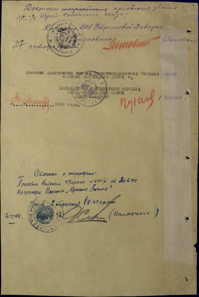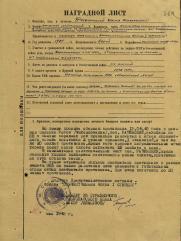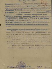 24.10.1943 за беспримерный  героизм и личное мужество при форсировании Днепра и боях на днепровском  плацдарме был представлен на звание Героя Советского Союза.  По данному наградному листу 60.6.1944  был удостоен ордена Боевого Красного Знамени.