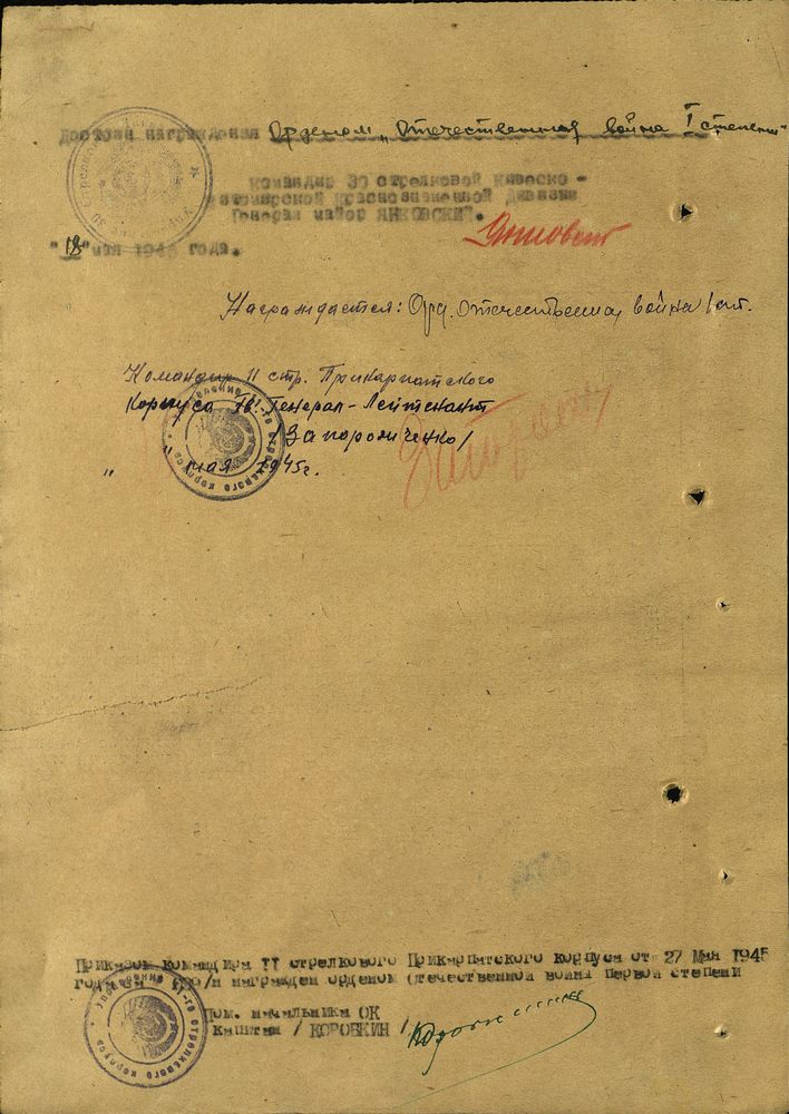 Также награжден орденами Отечественной Войны 1-й степени, Отечественной Войны 2-й степени, Красной Звезды.
