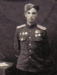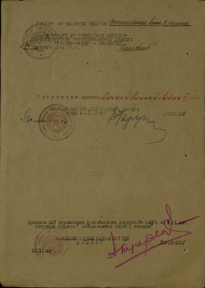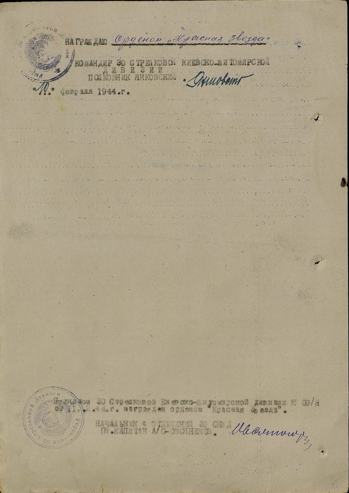 Командир минометного взвода 2-й минометной роты 35-го стрелкового Станиславского полка 30-й стрелковой Киевско-Житомирской Краснознаменной дивизии.