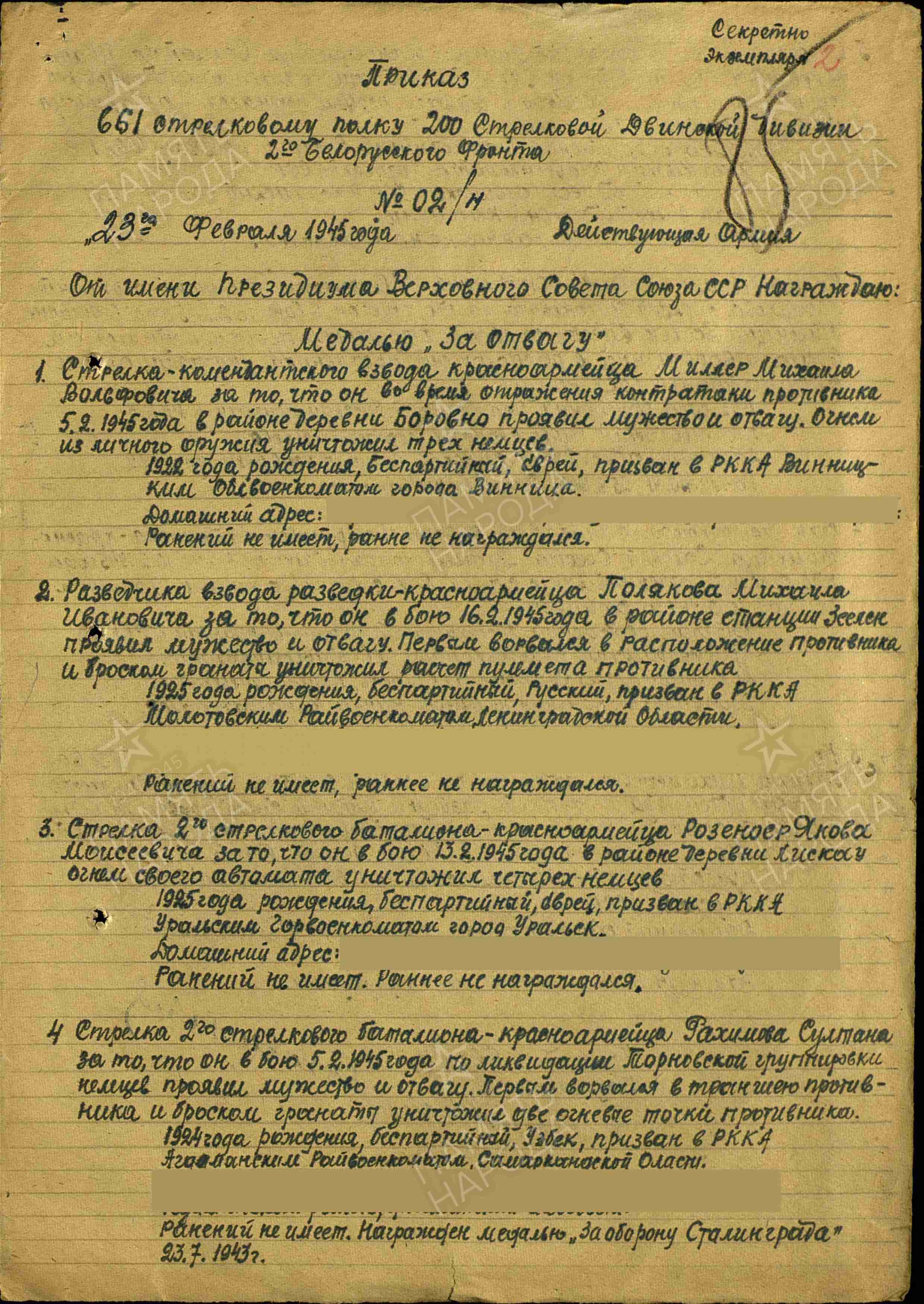 "Наградить стрелка 2-го стрелкового батальона красноармейца Розиноер Якова Моисеевича за то, что он в бою 13.02.1945 года в районе деревни Лискау огнем своего автомата уничтожил четырех немцев".