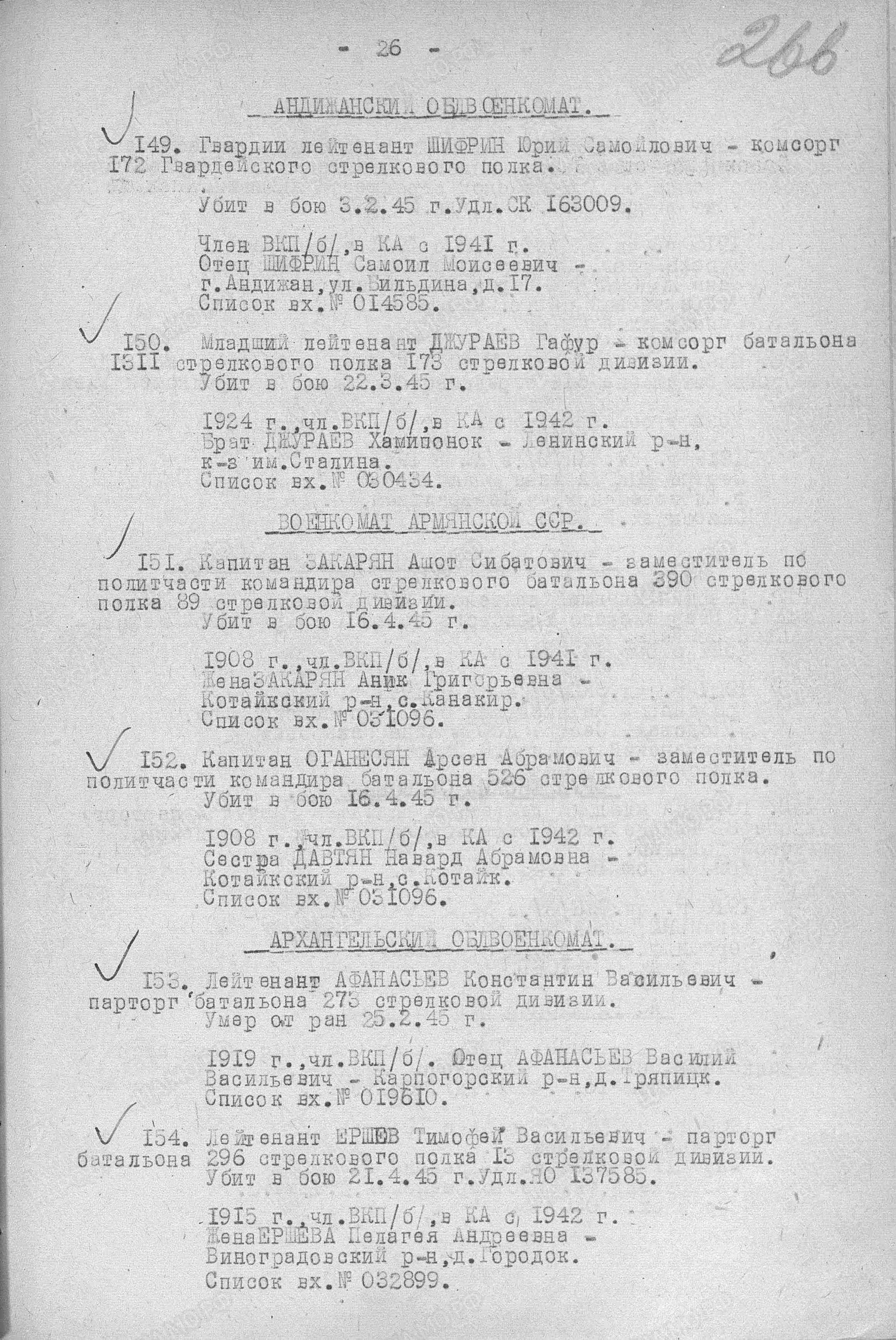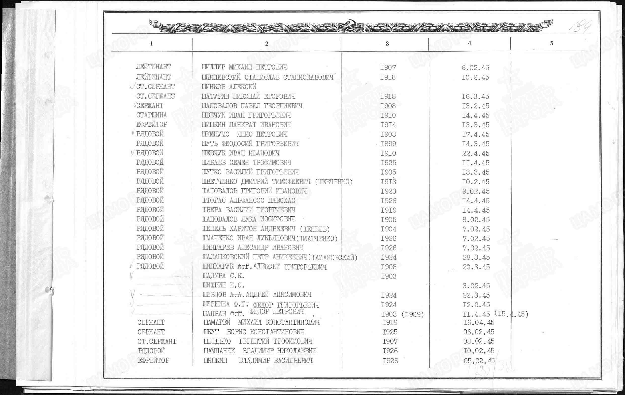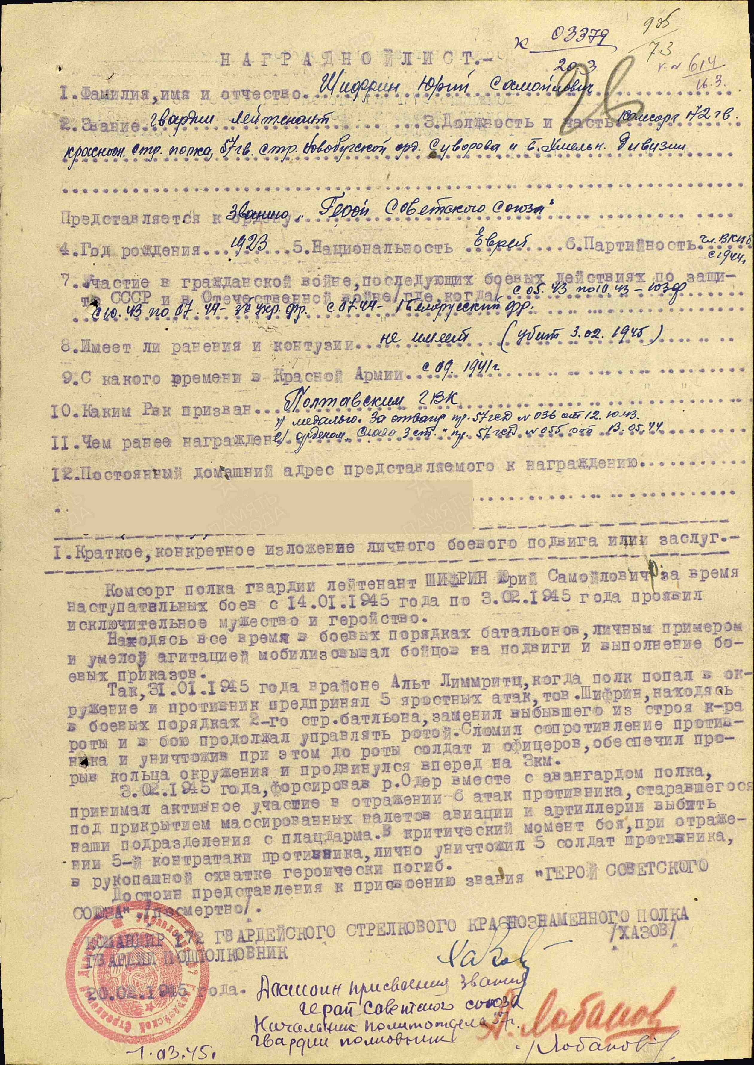 Гвардии лейтенант ШИФРИН ЮРИЙ САМОЙЛОВИЧ, 1923 года рождения, место рождения - Украинская ССР, Полтавская область, г. Полтава, еврей. В РККА призван Полтавским ГВК, Полтавской Области, Украинской ССР, 09.1941 года. В Великой Отечественной войне с 08.1943 года (на Юго - Западном, 3 Украинском, 1 Белорусском фронтах) в должности (последняя): Комсорга 172 гвардейского стрелкового Краснознамённого полка, 57 гвардейской стрелковой Новобугской орденов Суворова и Богдана Хмельницкого дивизии, 4 гвардейского стрелкового корпуса, 8 гвардейской армии, 1 Белорусского фронта. Ранения: нет. Боевые награды: 1.Ордена: "ОТЕЧЕСТВЕННОЙ ВОЙНЫ" 1 СТЕПЕНИ (ПОСМЕРТНО; НАГРАДНОГО ЛИСТА на звание "ГЕРОЙ СОВЕТСКОГО СОЮЗА": "Комсорг полка, гвардии лейтенант ШИФРИН ЮРИЙ САМОЙЛОВИЧ, за время наступательных боёв, с 14.01.1945 года по 3.02.1945 года, проявил исключительное мужество и геройство.