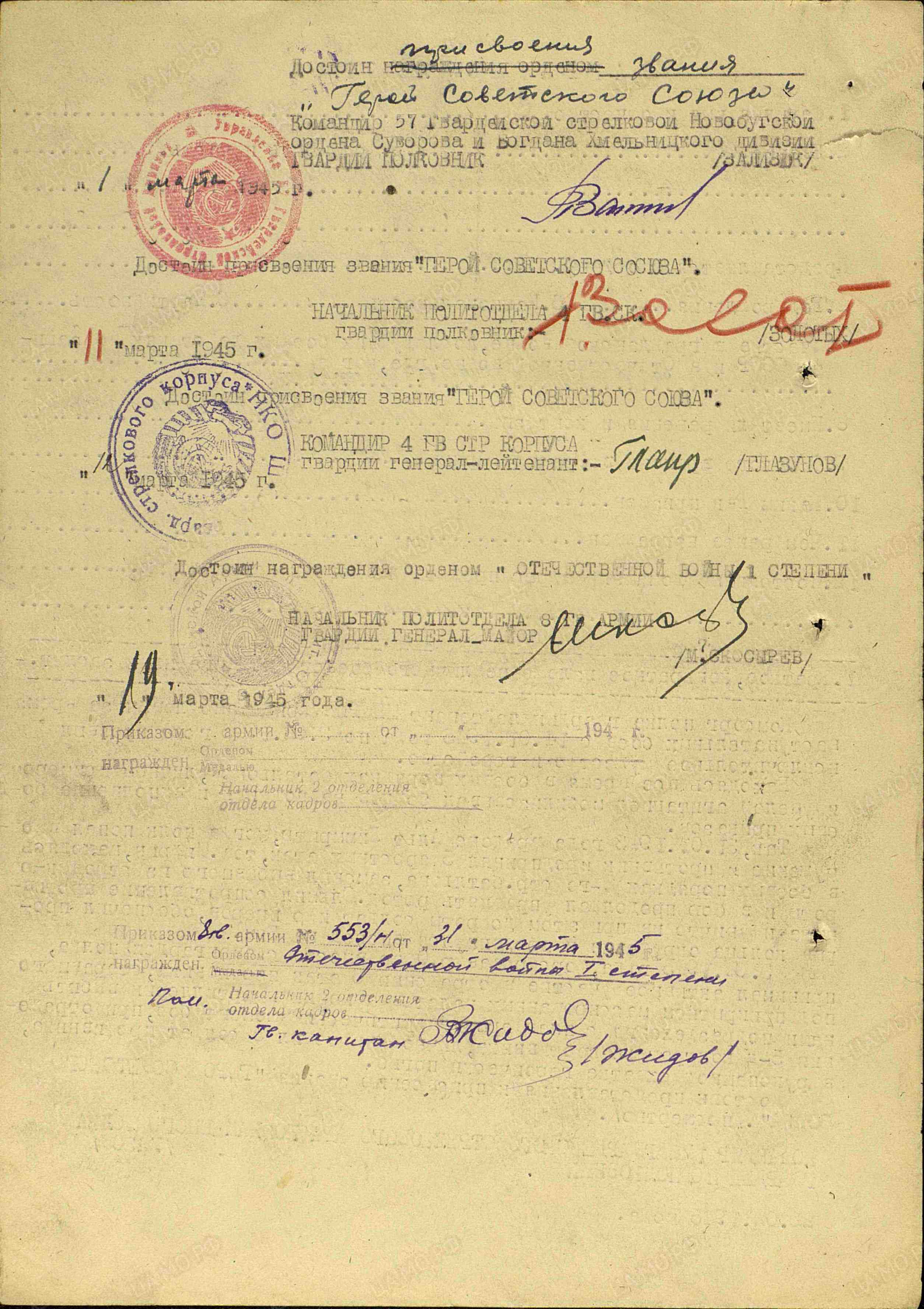 Достоин присвоения звания "ГЕРОЙ СОВЕТСКОГО СОЮЗА" Командир 57 гвардейской стрелковой Новобугской орденов Суворова и богдана Хмельницкого дивизии Гвардии полковник ЗАЛИЗЮК. 1.03.1945 года.