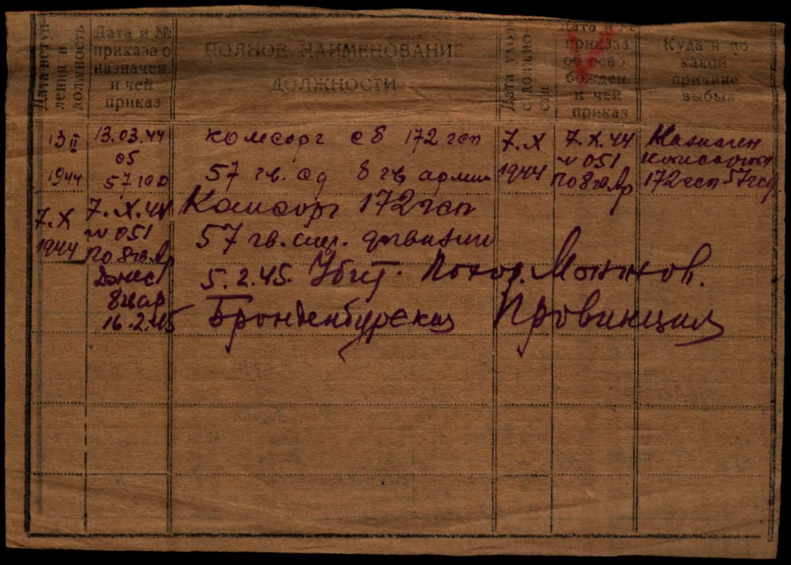 Комсорг 172 гвардейского стрелкового Краснознамённого полка, 57 гвардейской стрелковой Новобугской орденов Суворова и Богдана Хмельницкого дивизии, 4 гвардейского стрелкового корпуса, 8 гвардейской армии, 1 Белорусского фронта.