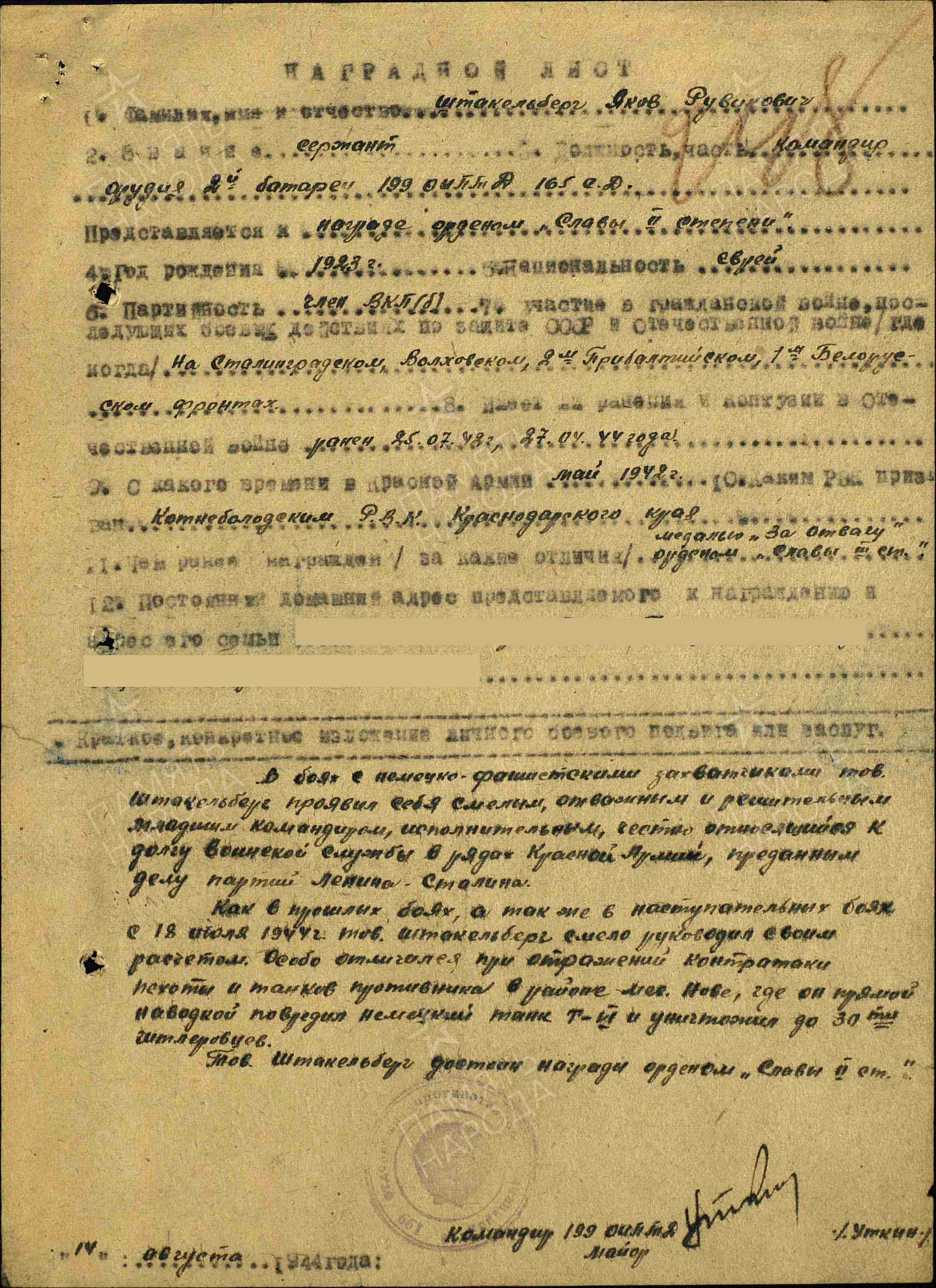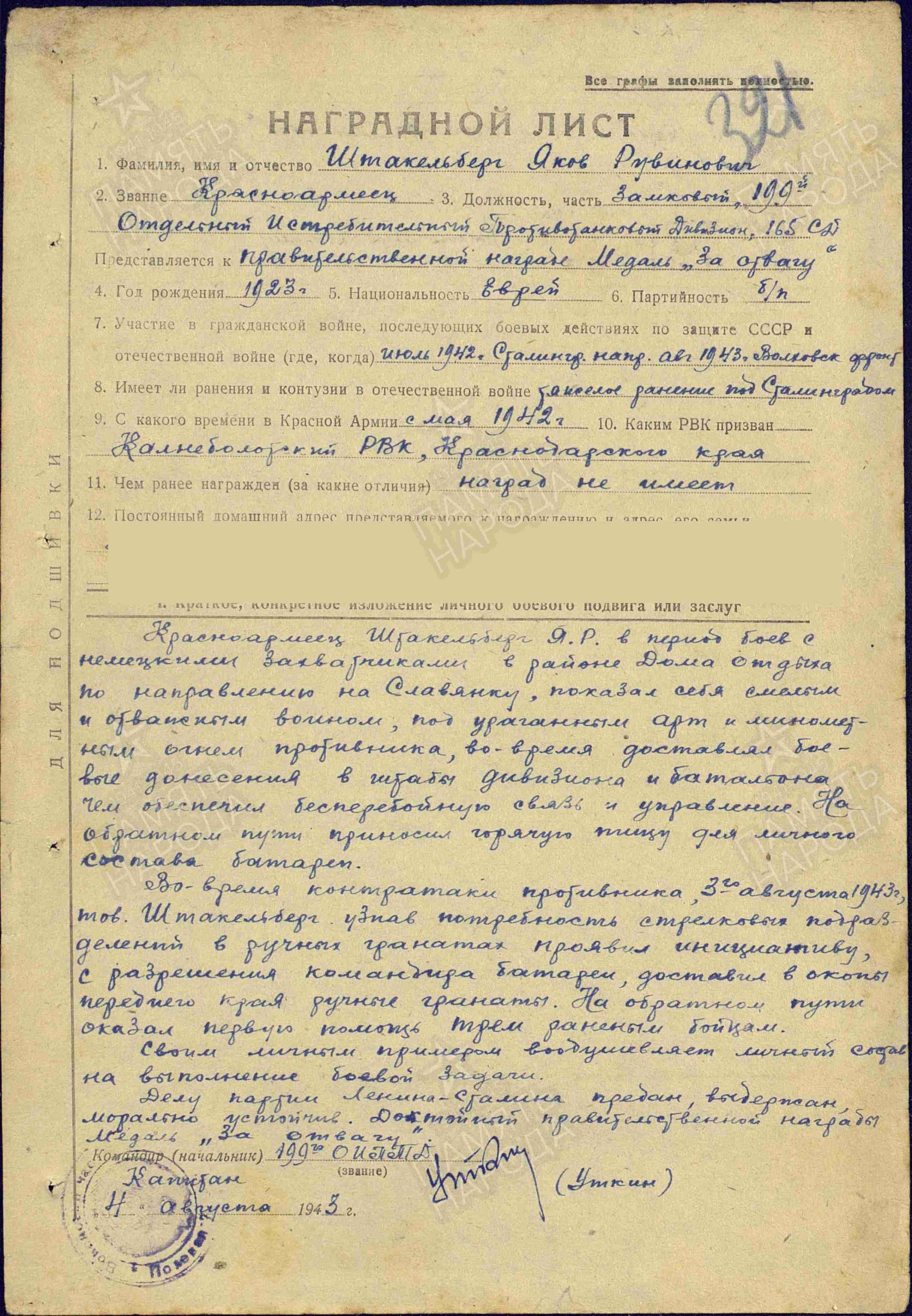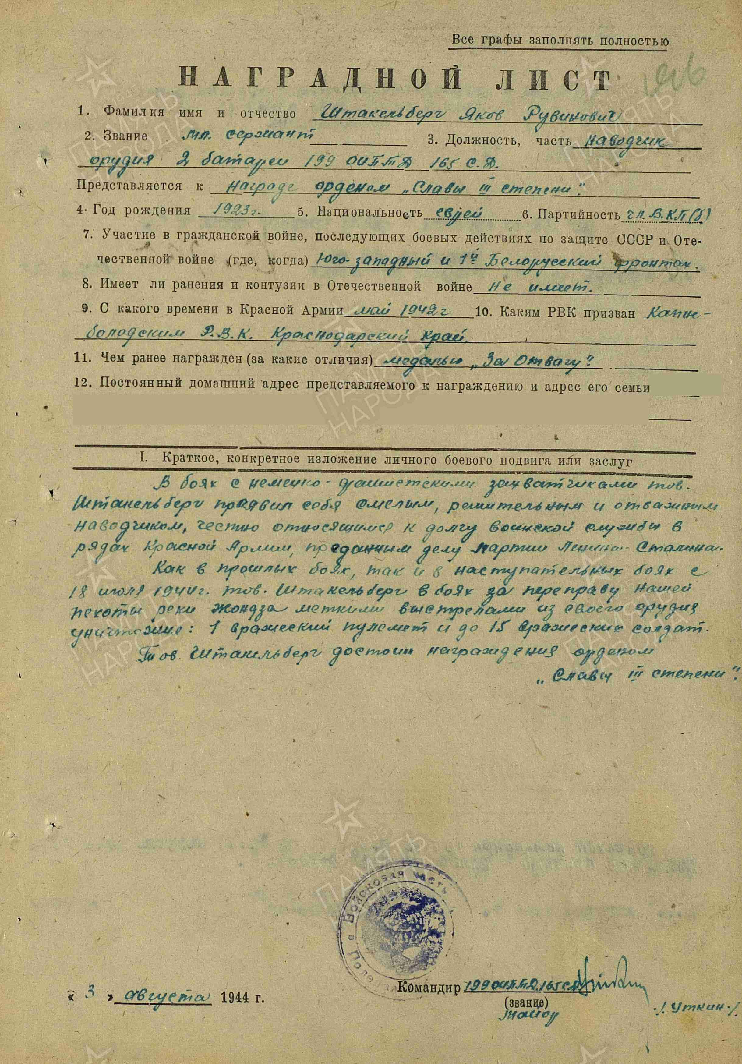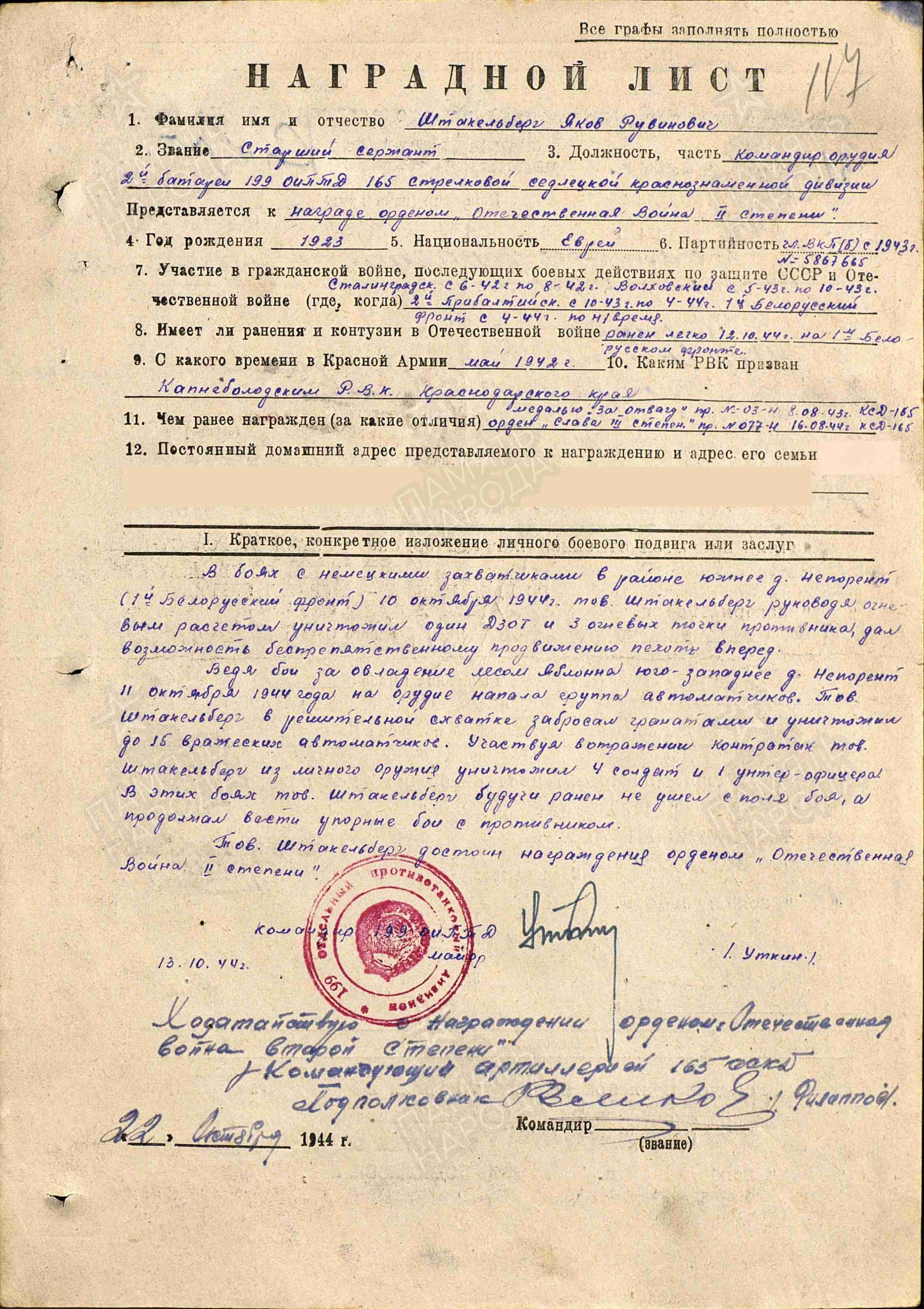 ЛИЧНАЯ СТРАНИЦА  на старшего сержанта Штакельберга Якова Рувимовича :