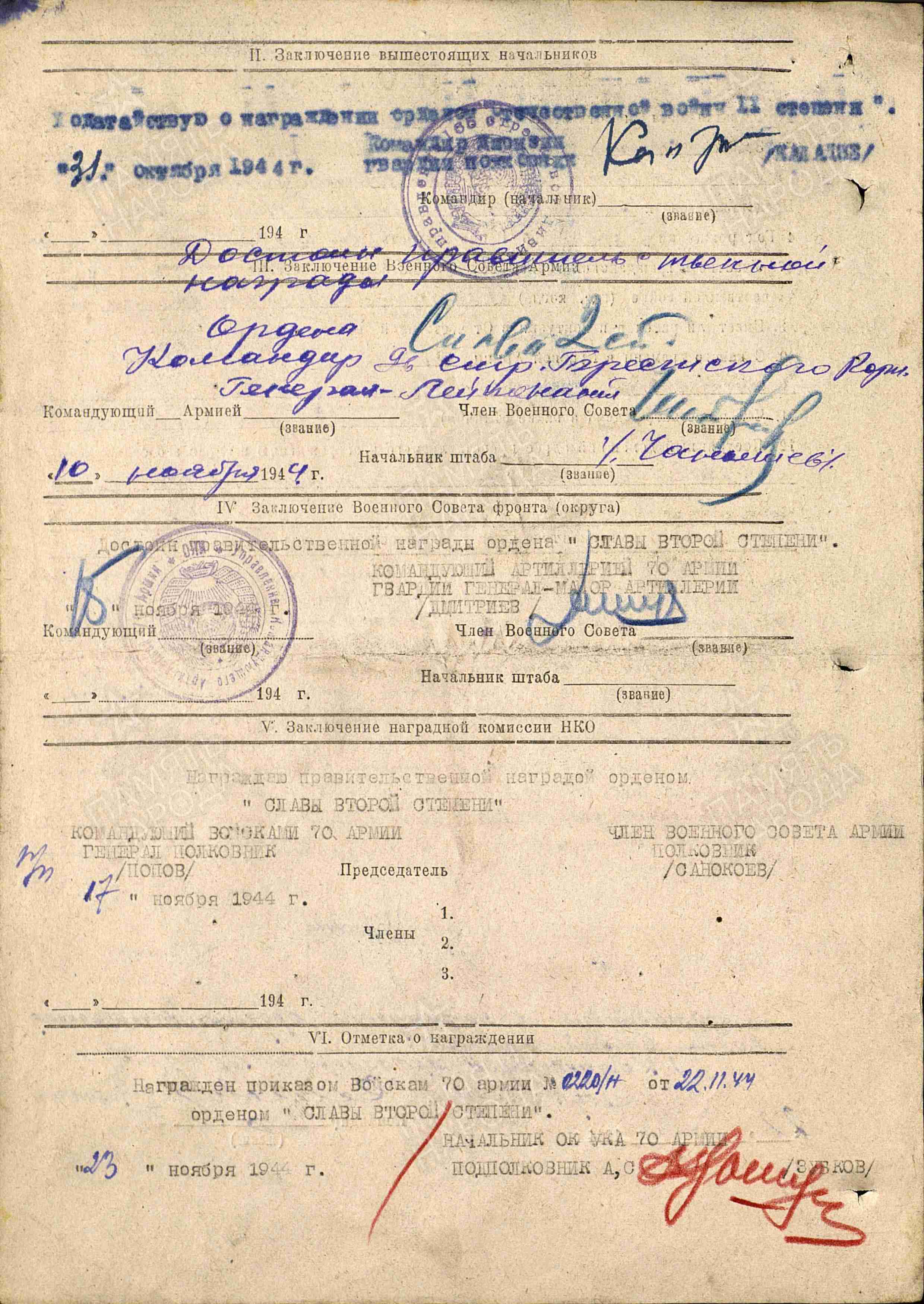 Ордена: "ОТЕЧЕСТВЕННОЙ ВОЙНЫ" 1 и 2 СТЕПЕНЕЙ, "СЛАВЫ" 2 и 3 СТЕПЕНЕЙ.