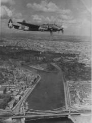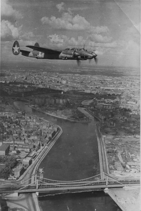 - авторское описание фотографии: "Бомбардировщик Ту-2 младшего лейтенанта А.В. Кудлаева в полете над Крымским мостом на заключительной репетиции воздушного парада в Москве. Фото из альбома летчика 63 БАП (бомбардировочного авиаполка) А.В. Кудлаева."; Место съемки: Москва; Время съемки: 1945.