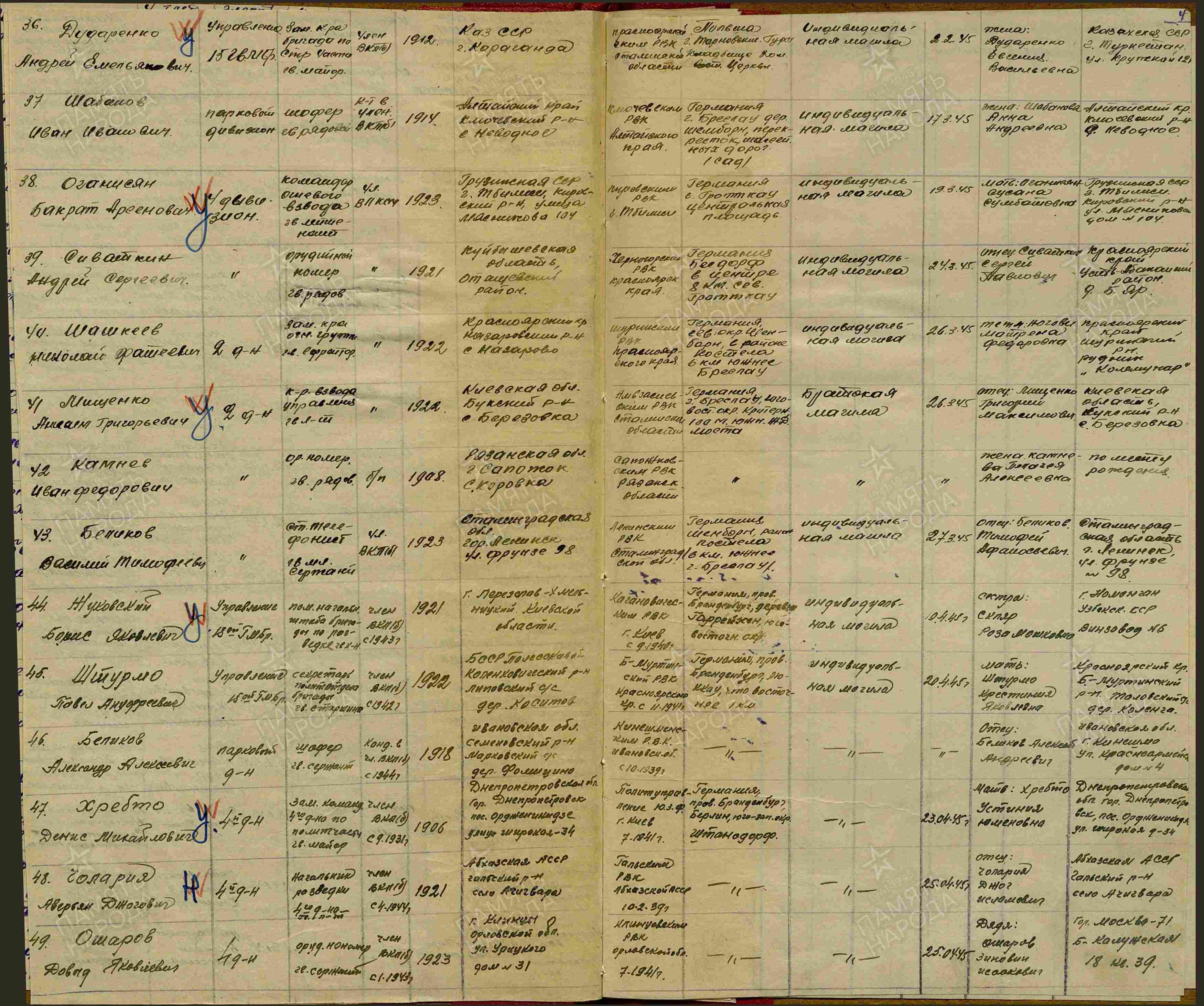 Убит  19.4.1945. Похоронен в районе н.п.Гаршхен, провинция Бранденбург, Германия.