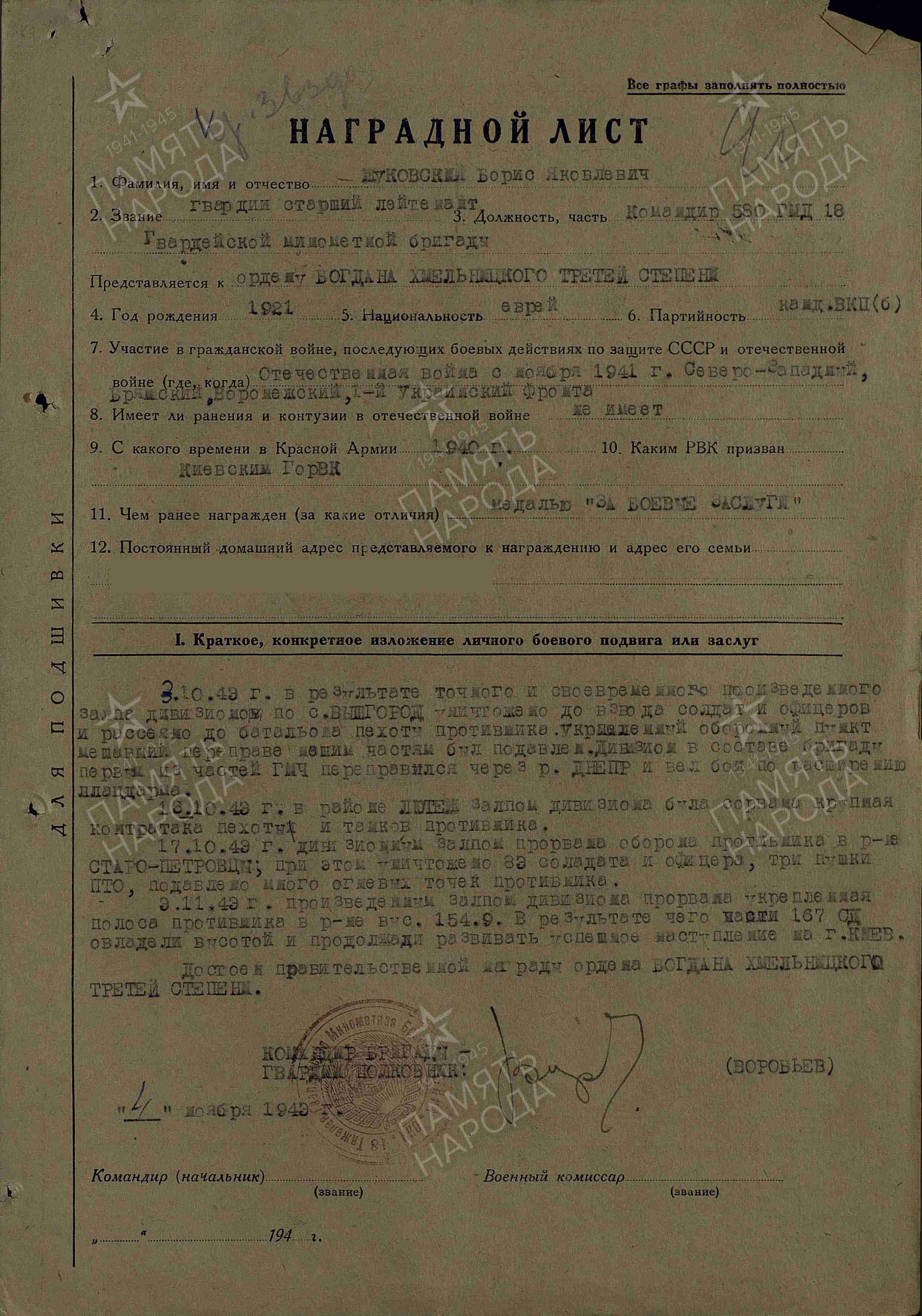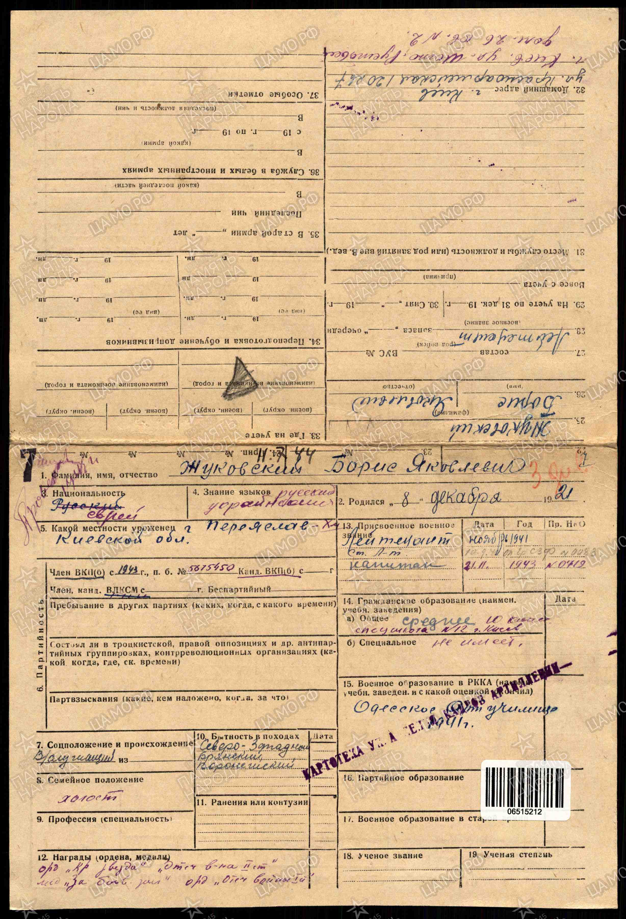 Борис Яковлевич Жуковский родился 8.12.1921 в г.Переяславль Киевской области. Еврей.